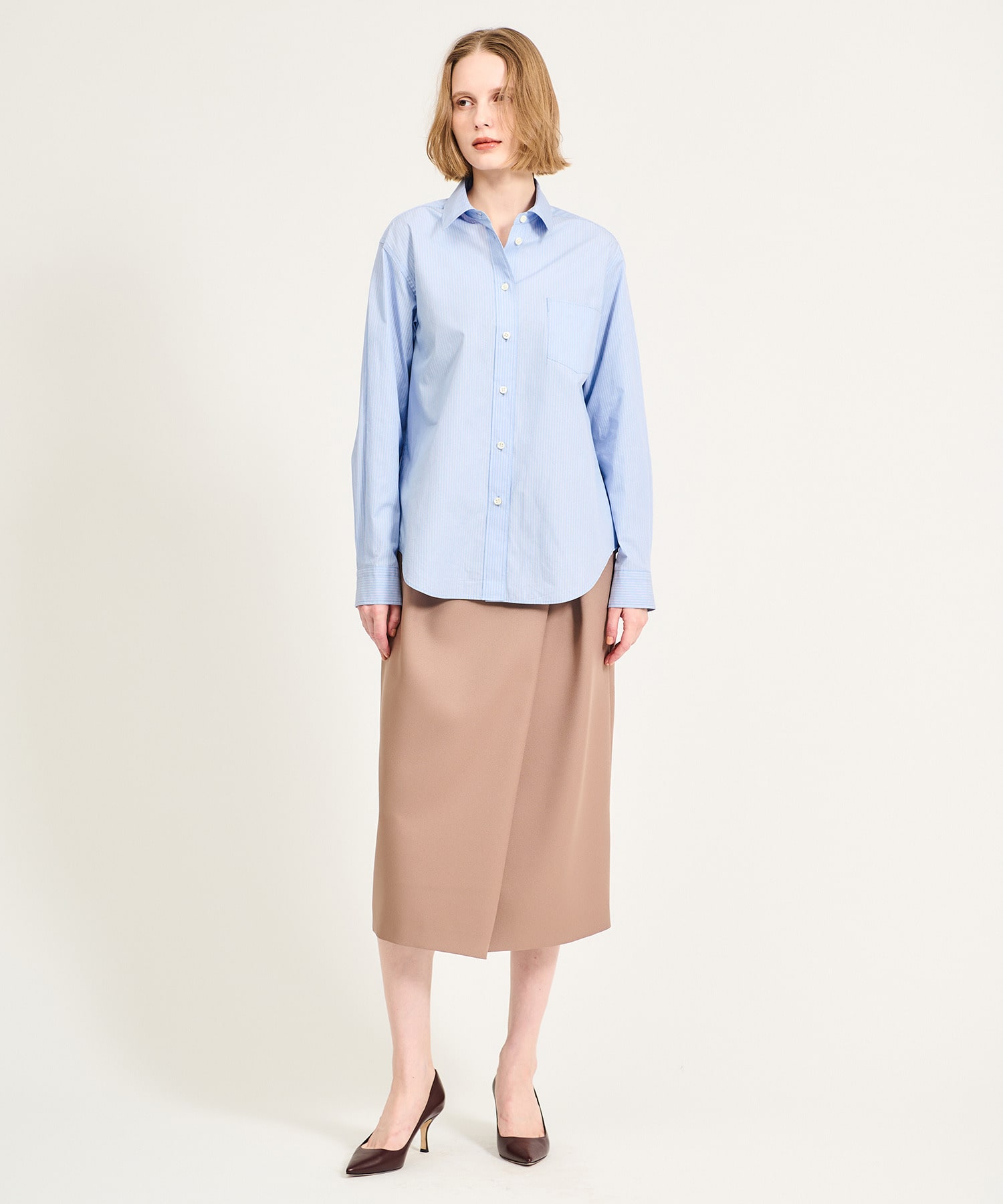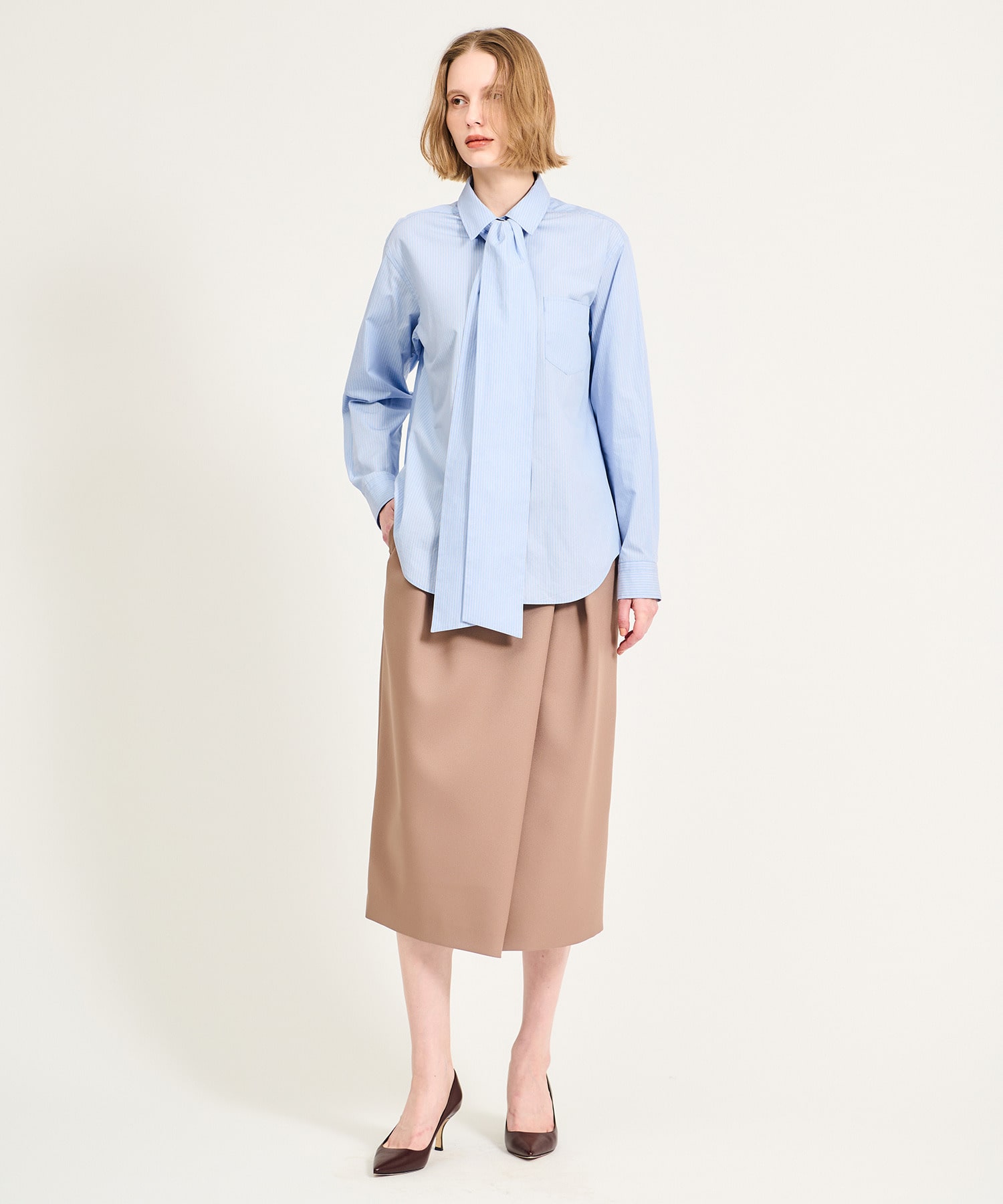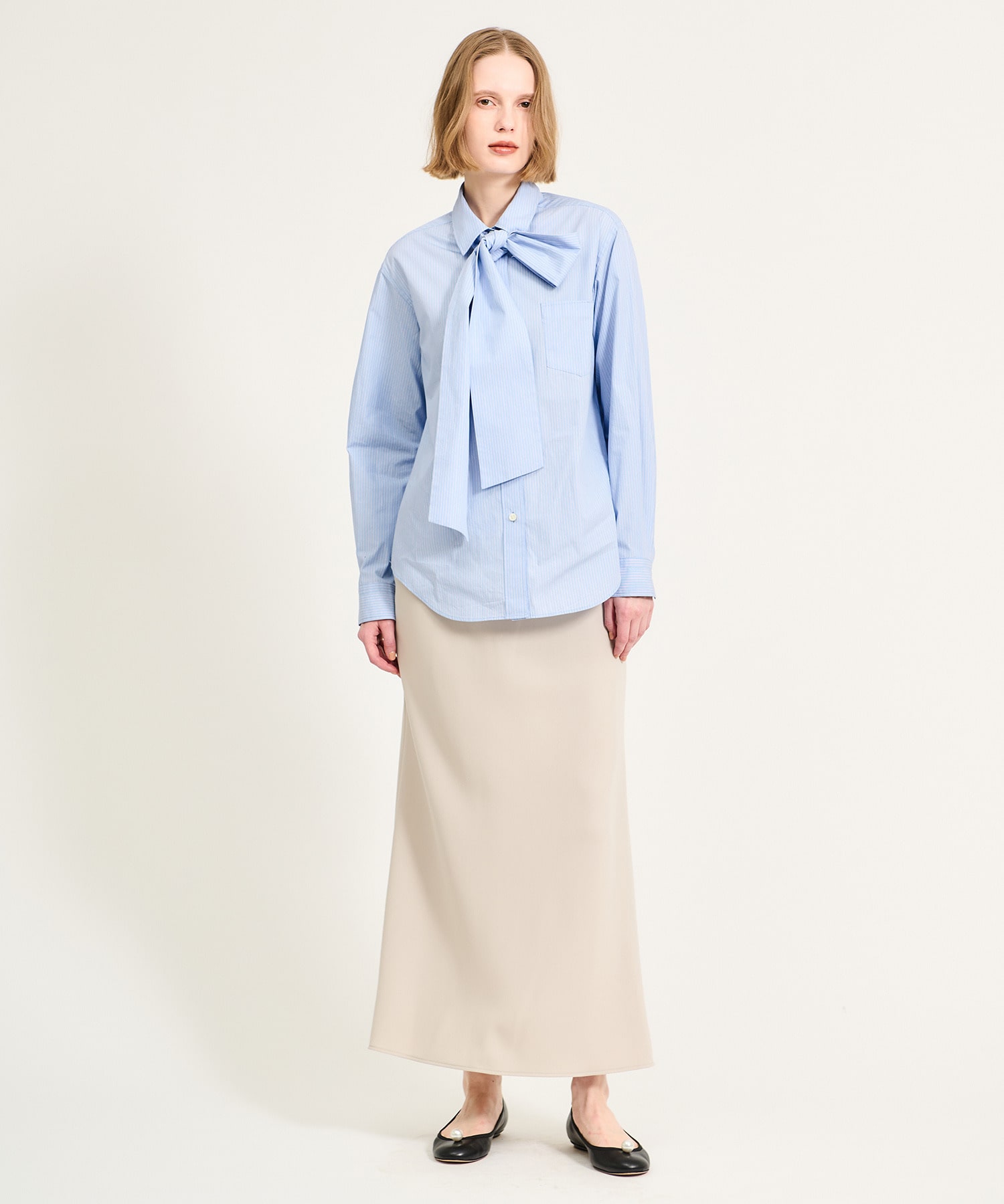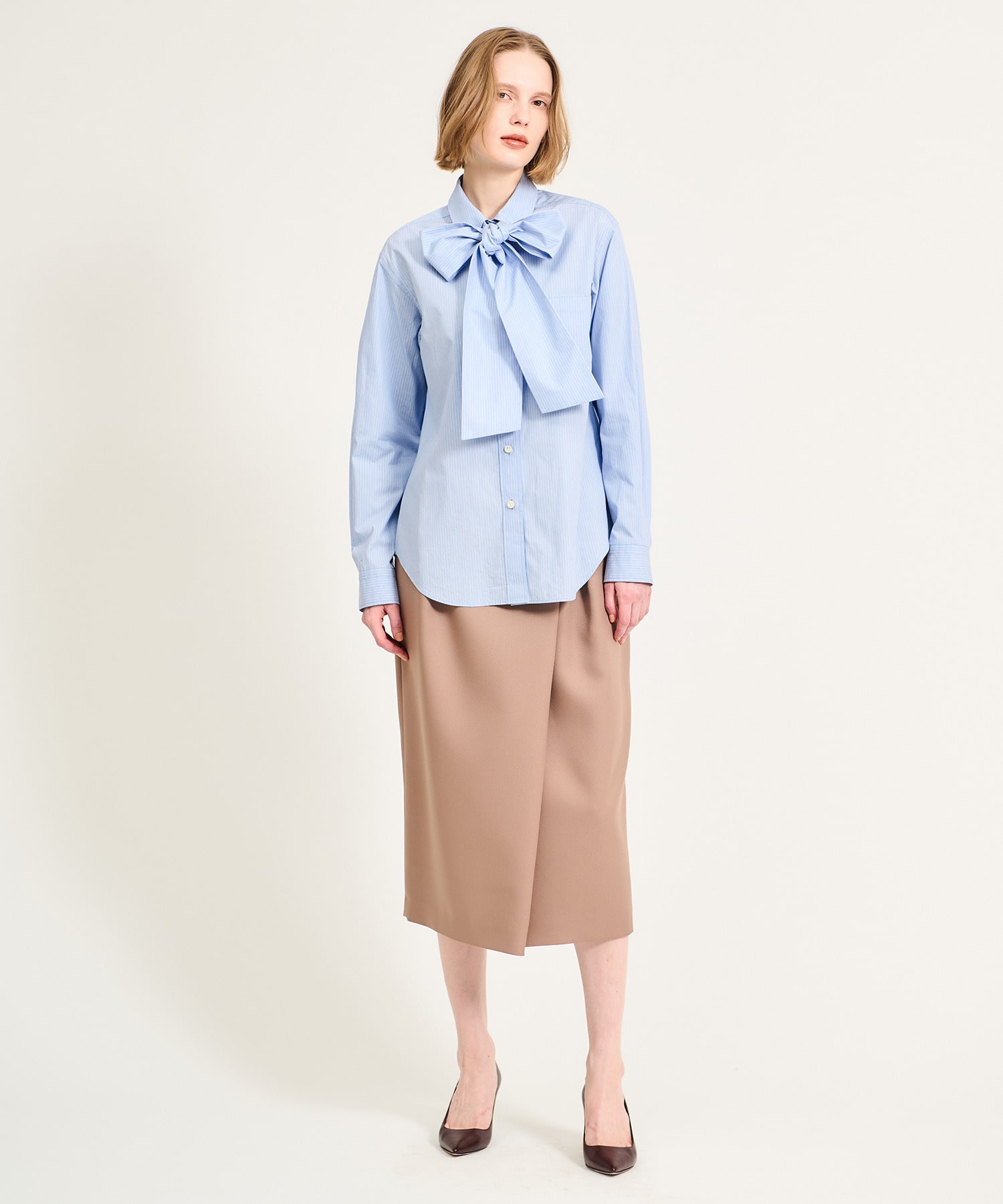 取り外し可能なボウタイ付きで、衿を立たせてリボンをぎゅっと結べば、顔まわりにボリュームが生まれ華やかな印象に。ボウタイを外せば、すっきりとしたストライプシャツとしても着用可能です。