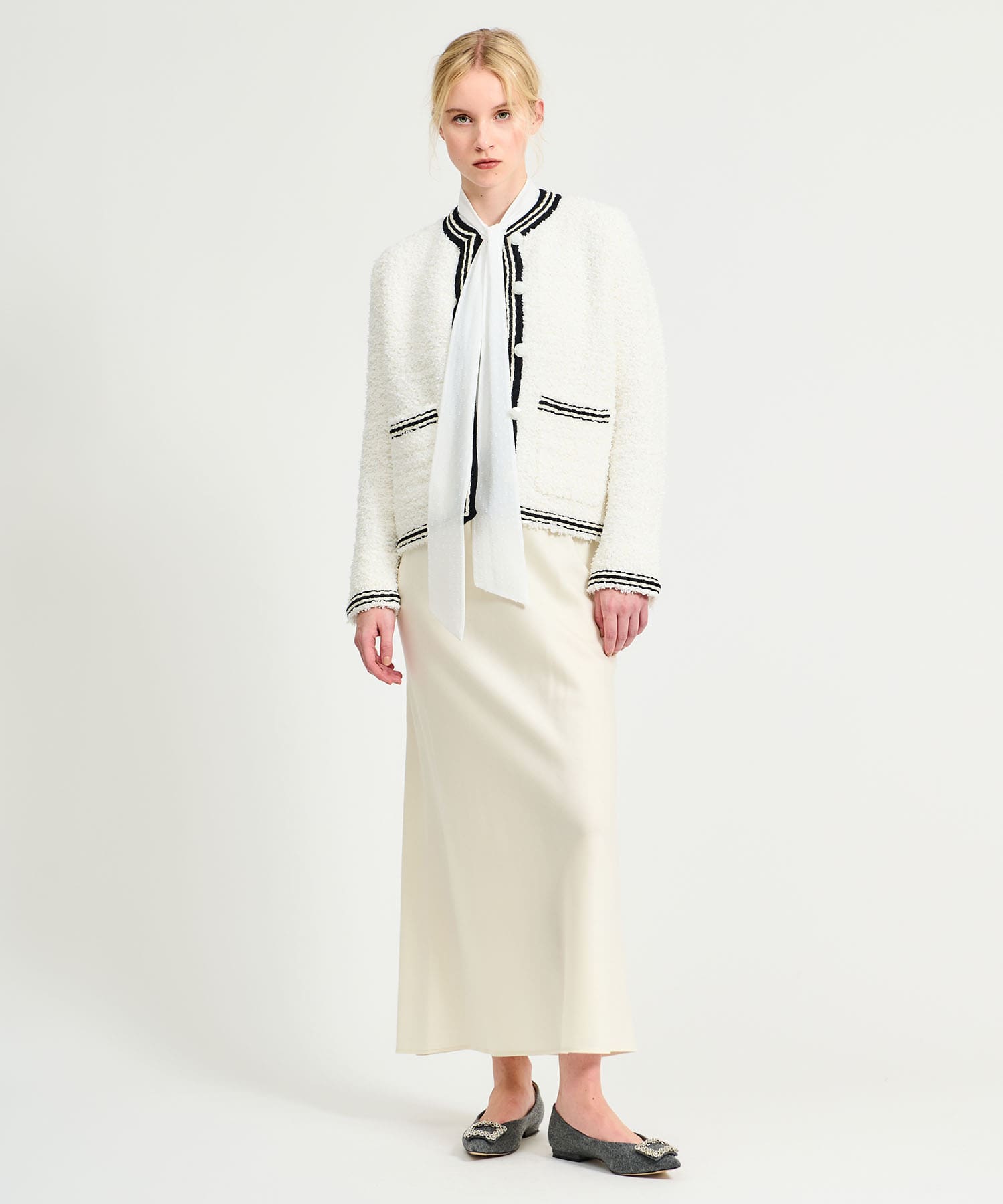 首元のボウタイデザインはフェミニンなムードを演出しながらも、甘すぎずクリーンな佇まい。