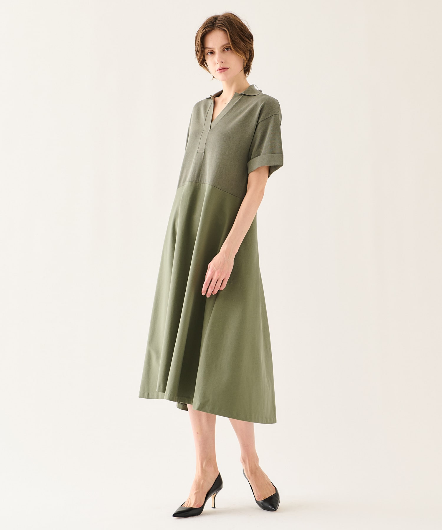 ニットトップスと、布帛見えするジャージ素材のスカートを組み合わせたコンビネーションワンピース。