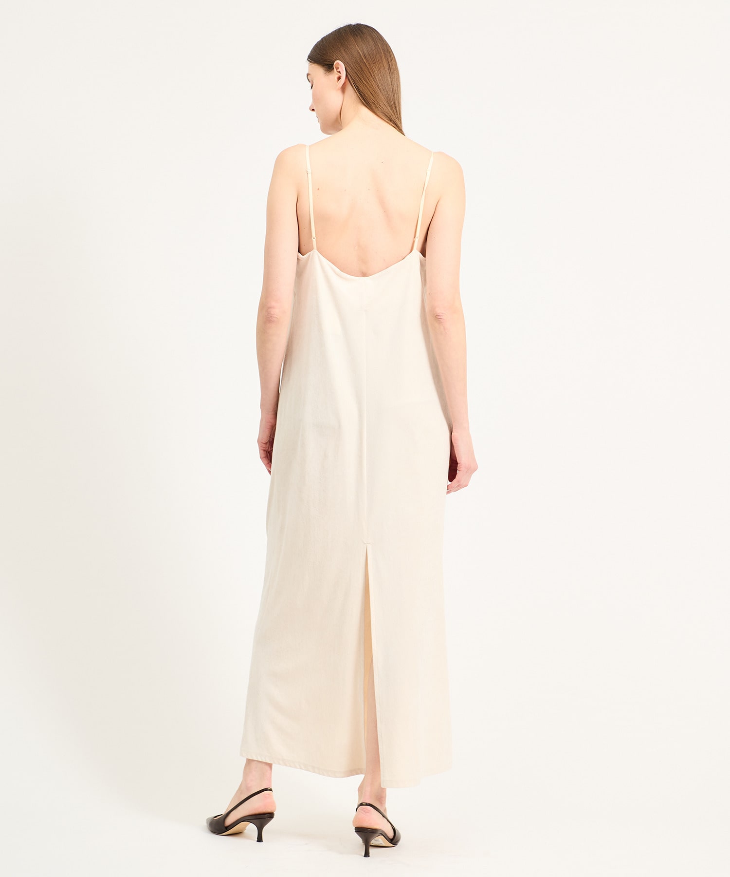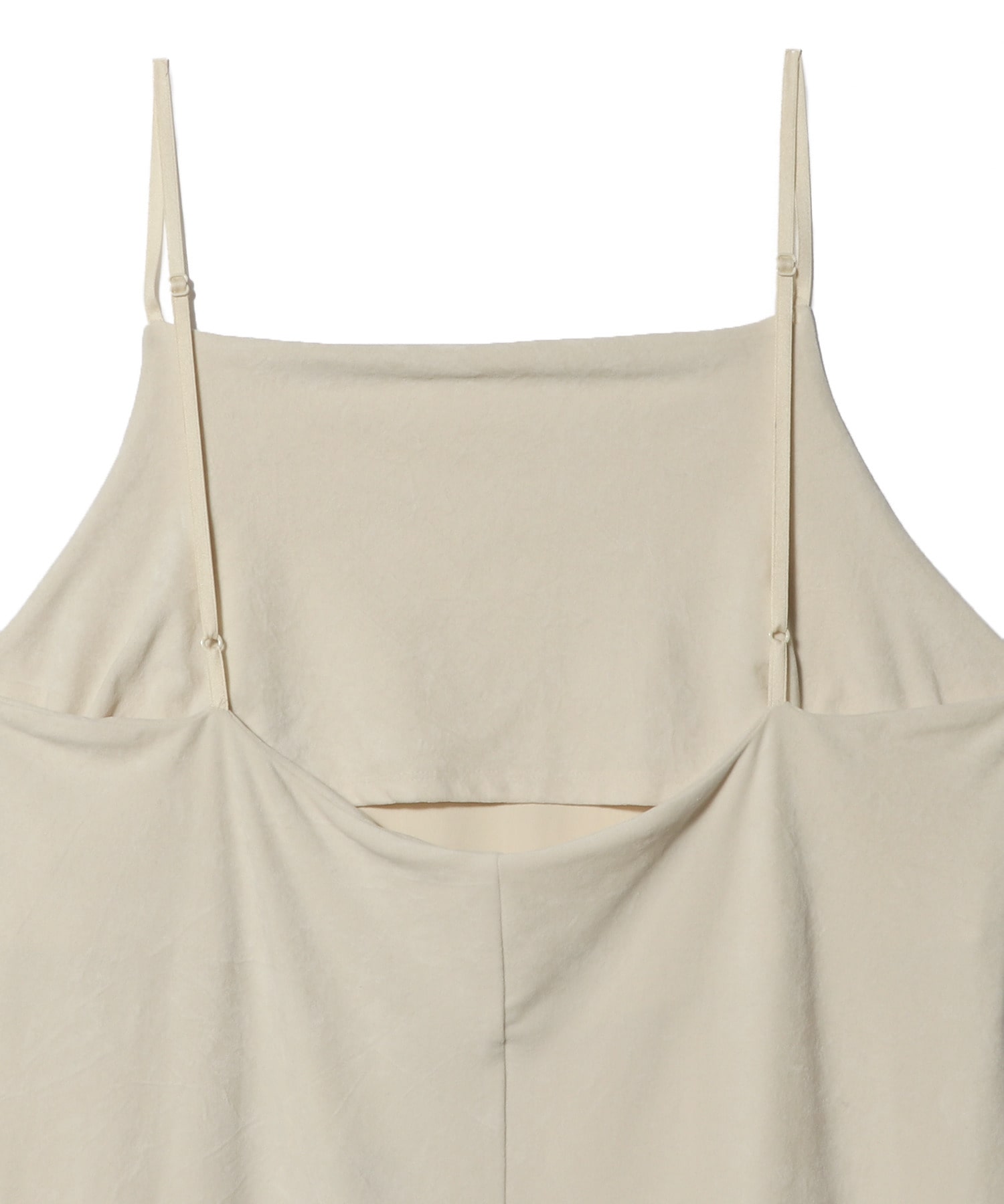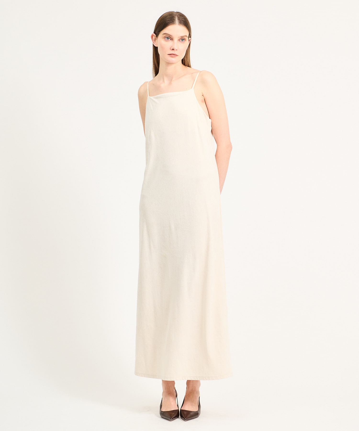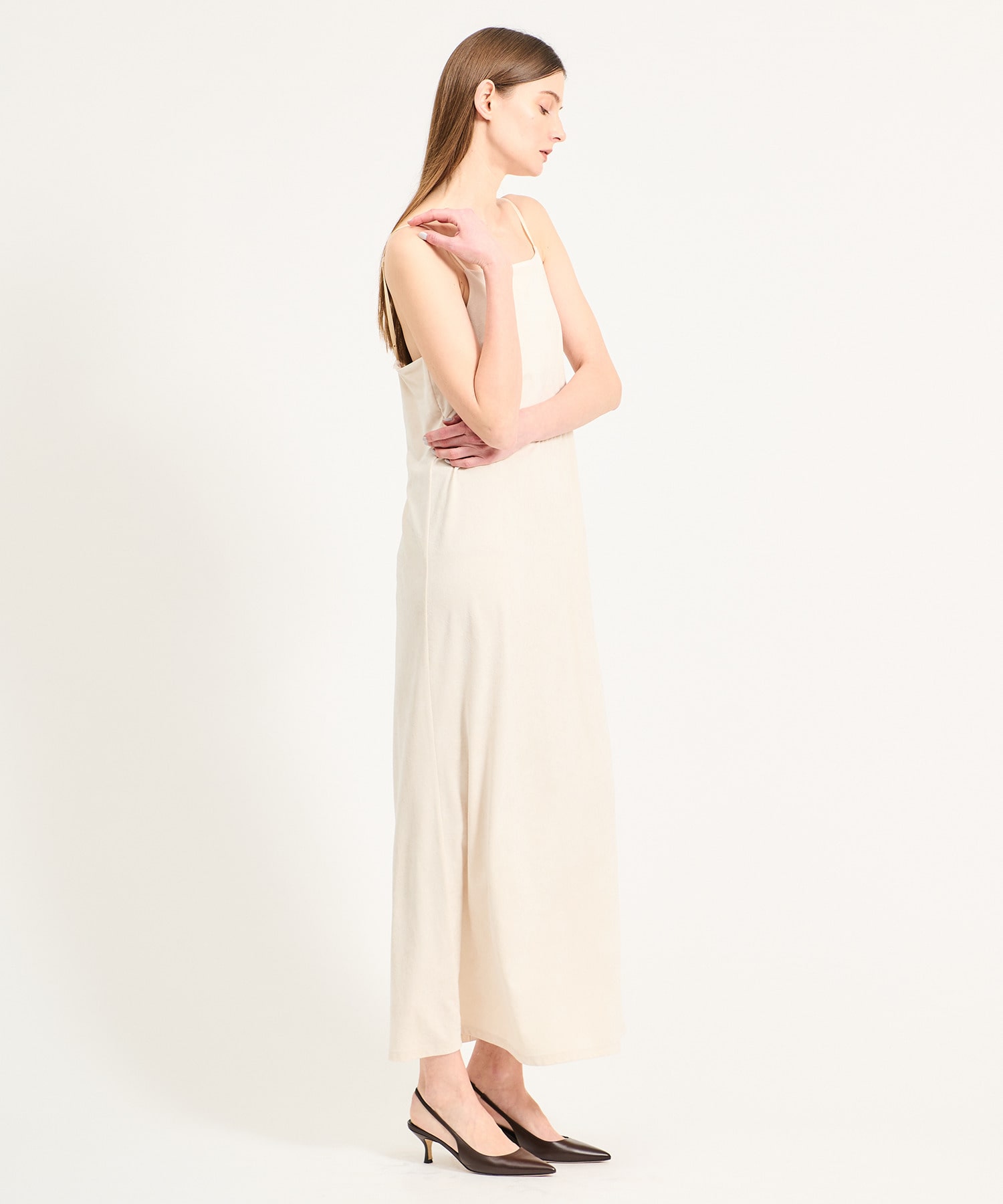 トリアセテートの生糸を使用した、スエードのような起毛した柔らかな風合いと不均一なクラッシュ感が特徴のキャミソールドレス。