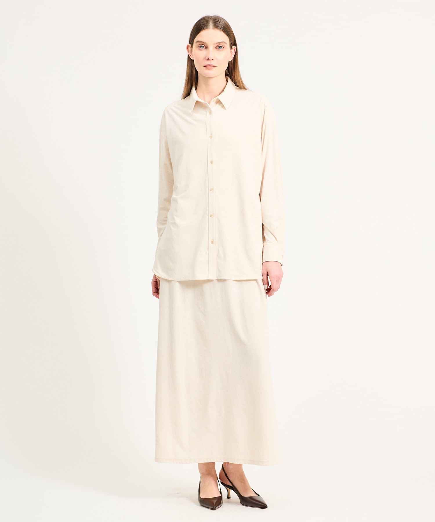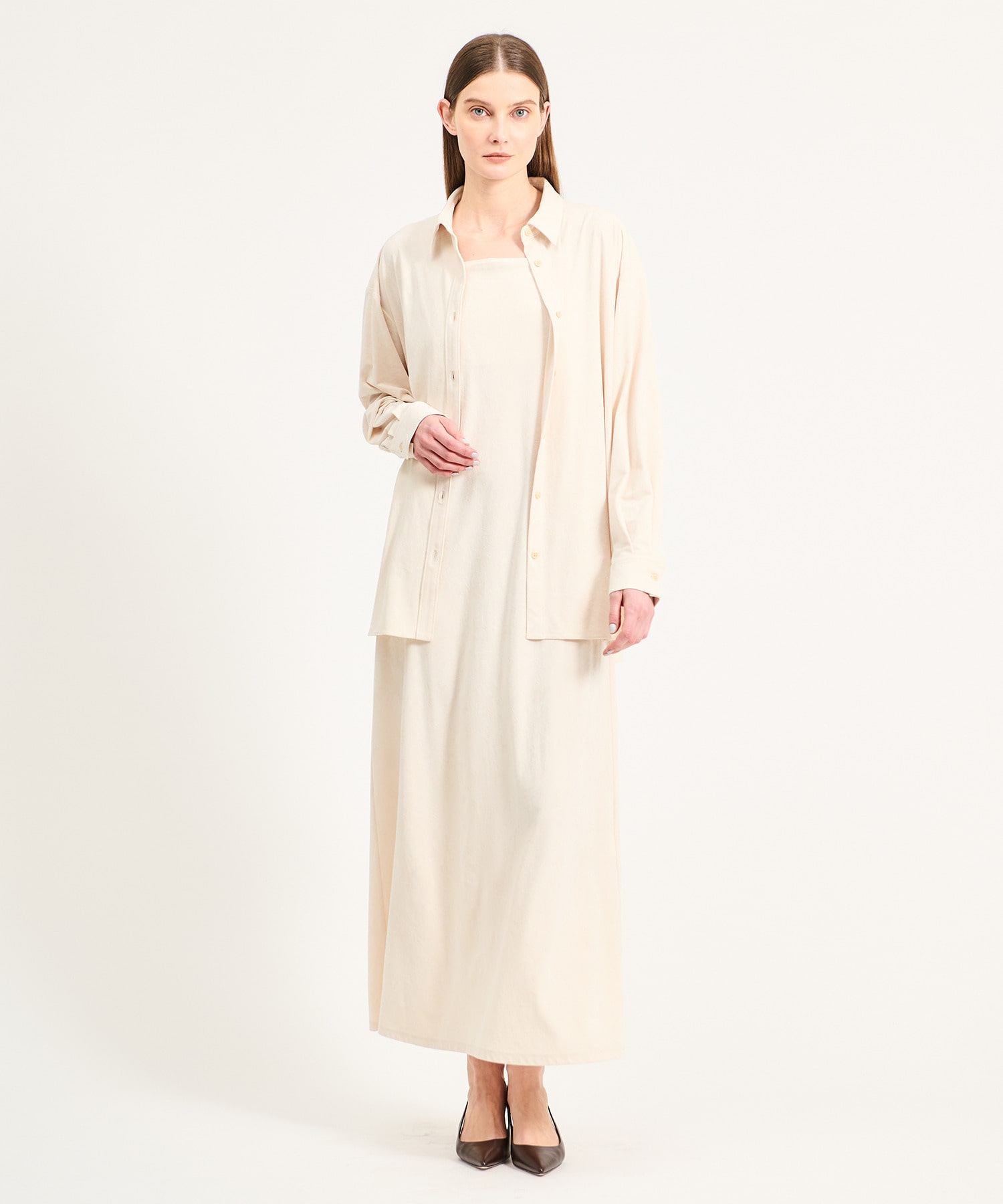 ストンと落ちるIラインシルエットに、フロントはスクエアに見えるストレートラインでモダンな印象に仕上げています。
