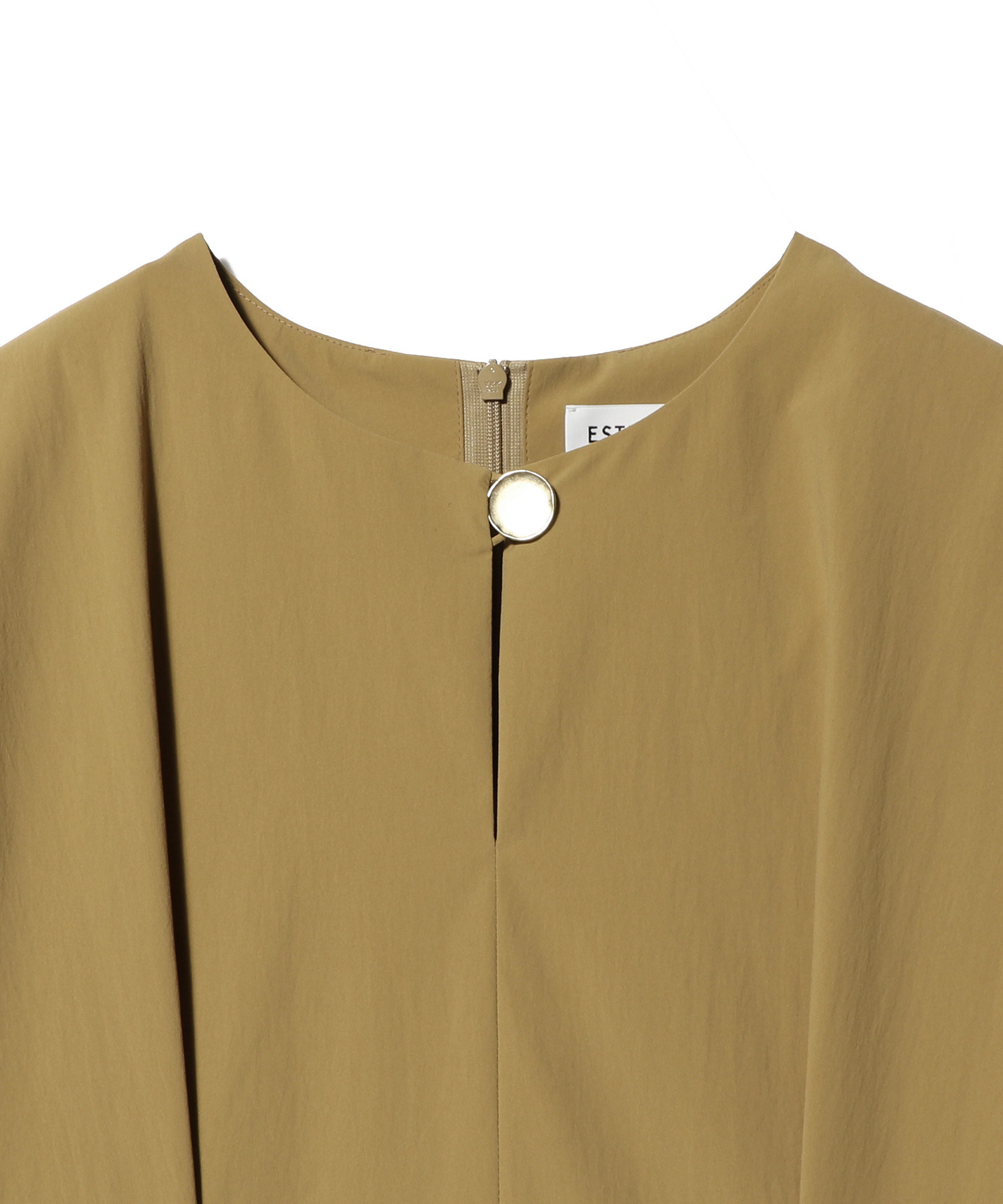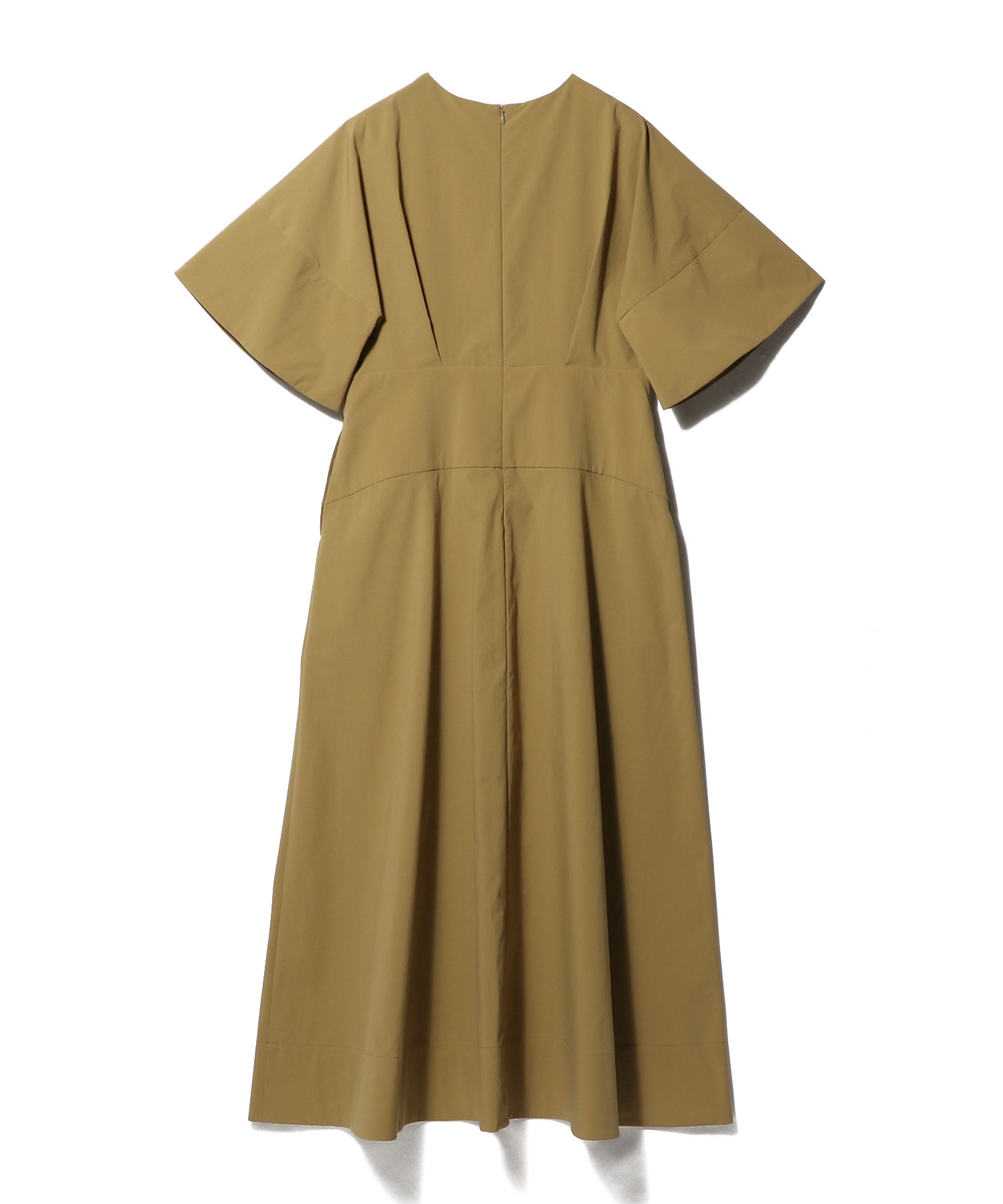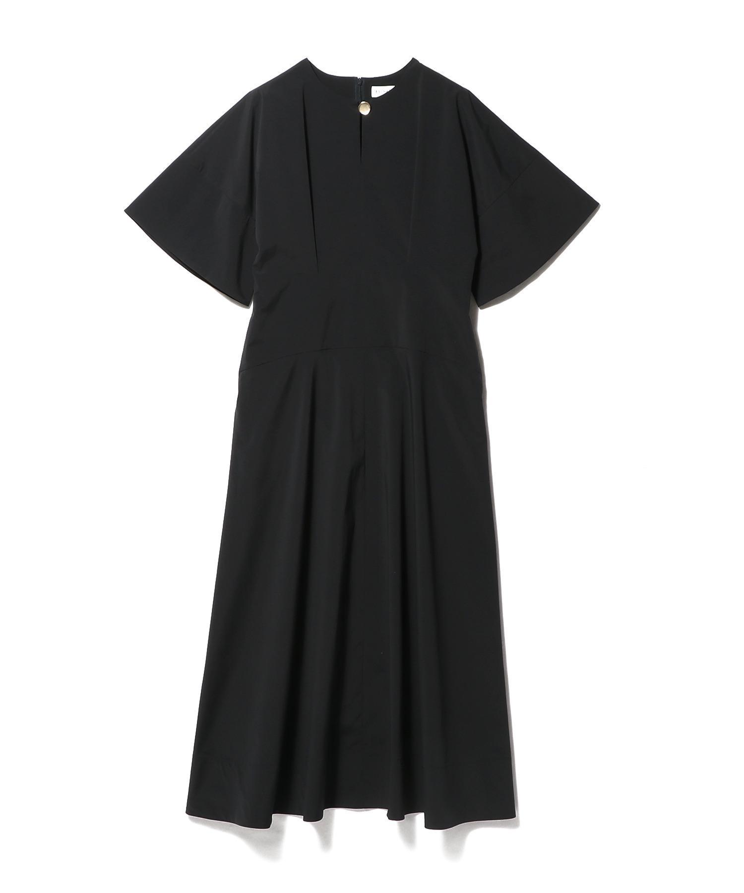 裾に向かって広がるフレアシルエットが、女性らしい動きと華やかさを演出します。襟ぐりはモダンなラウンドVネックで顔まわりをすっきりと見せつつ、ハンドクラフトテイストのメタルボタンがさりげないポイントに。