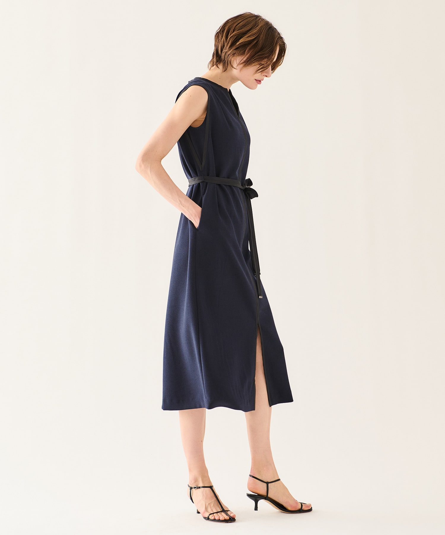 顔回りをすっきと見せるラウンドVネックで、センターフロントにスリットが入れたミニマムで洗練された印象のIラインシルエット。