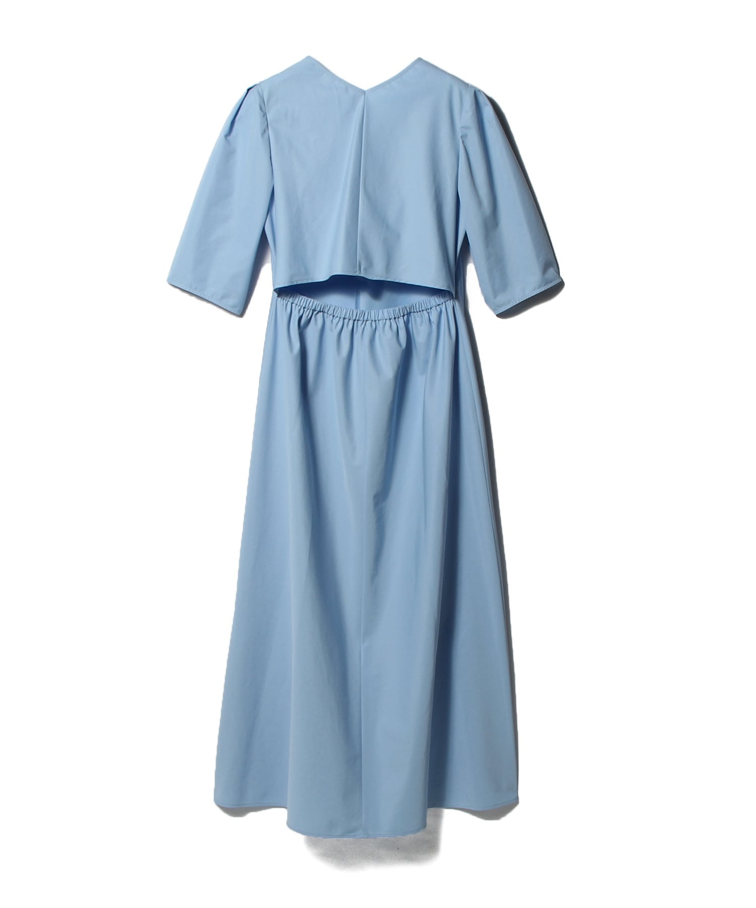 シャープな印象のVネックに、バックデザインは上身頃とスカート部分を切り離し、ヘルシーな肌見せが叶う一枚。スカート部分にゴムを入れることで、ウエストが締まりフォルミーなシルエットに。
