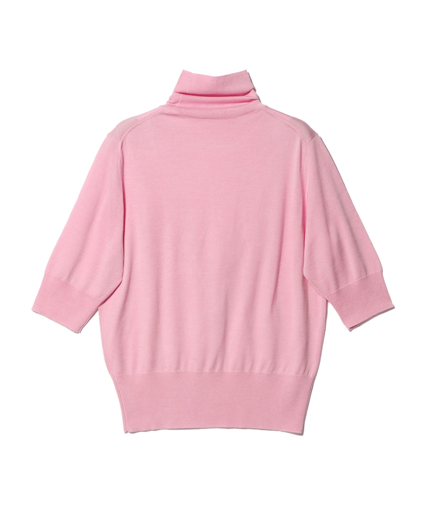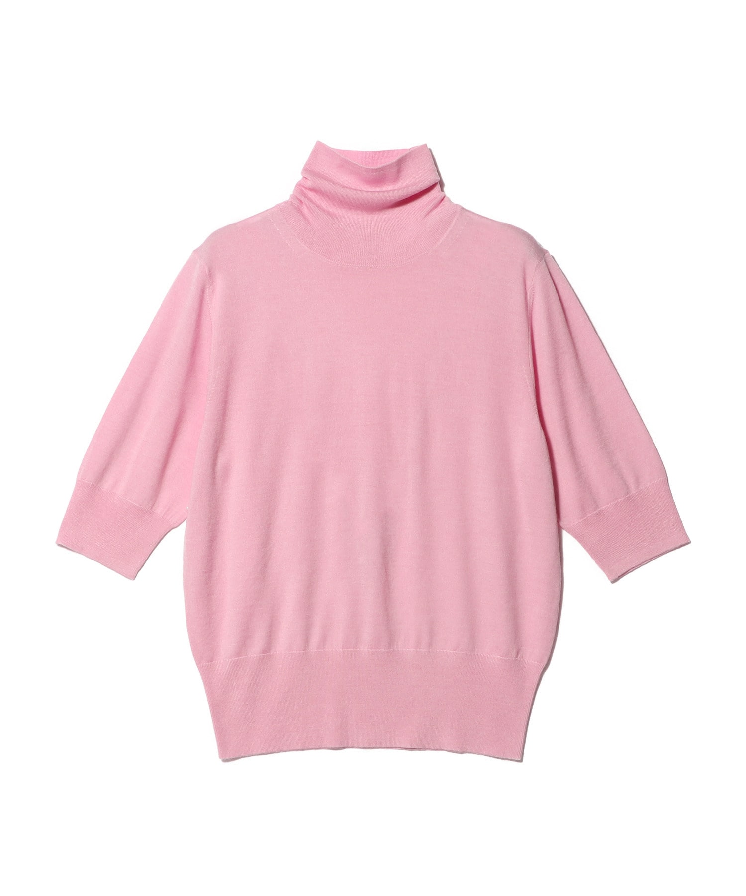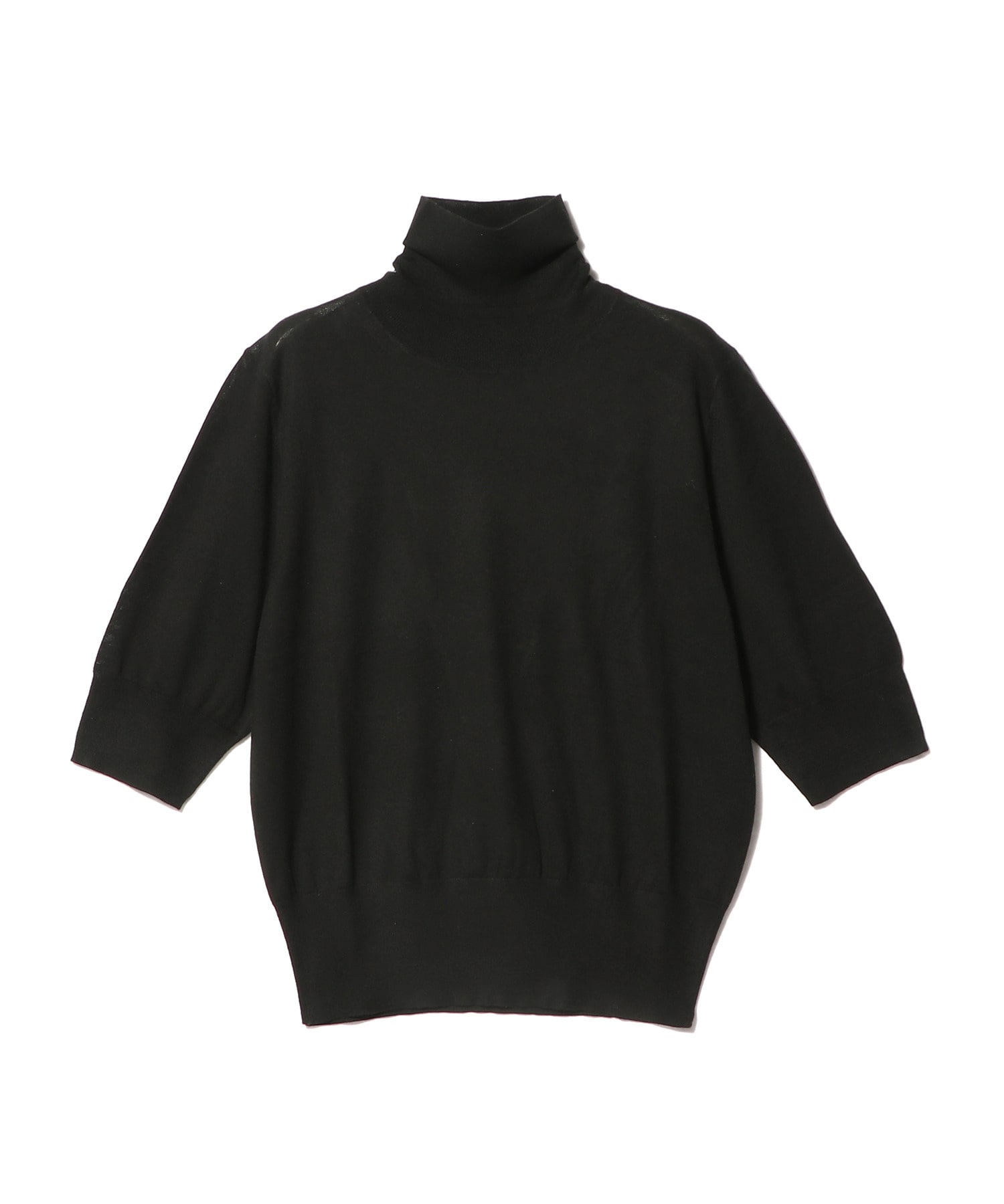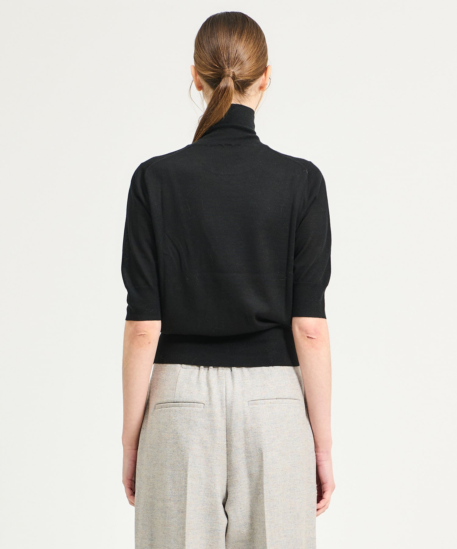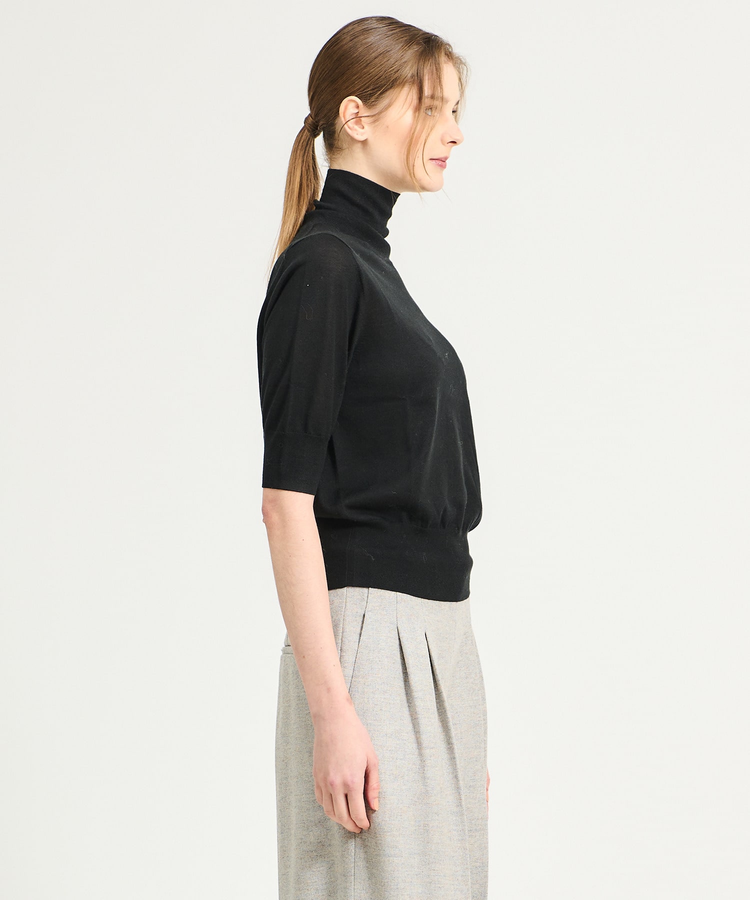薄くしなやかな質感で、ジャージのような軽い着心地が魅力です。5分袖のハイネックは、季節を問わず重宝する万能アイテム。