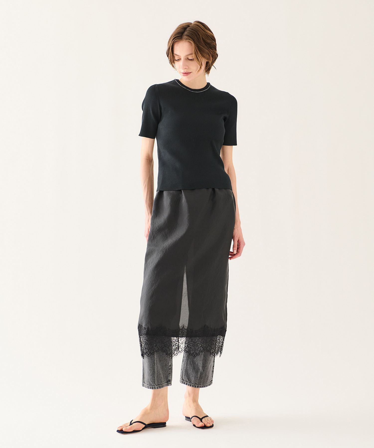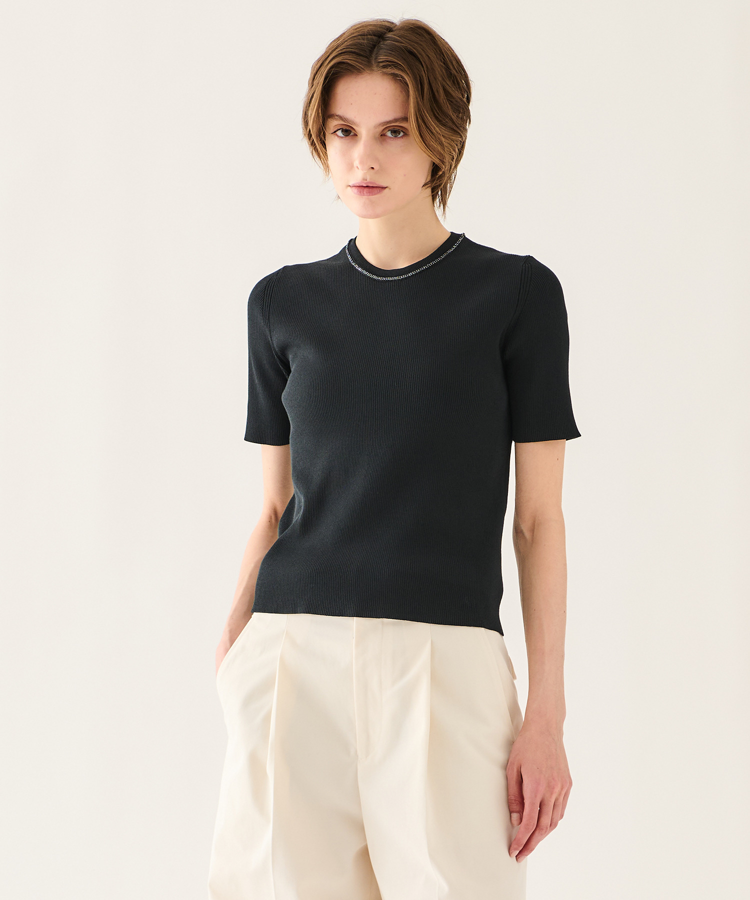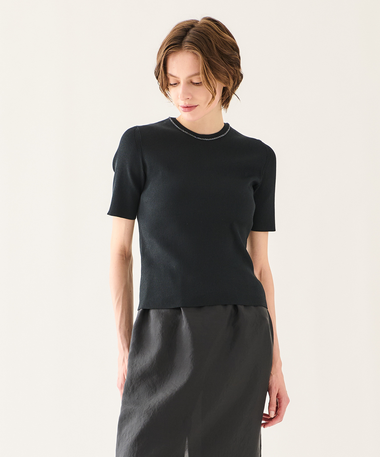 ネックに添えた極細チェーンがさりげなくきらめき、品よくスパイスを添えるポイントに。一枚ではもちろん、インナーとしても重宝します。