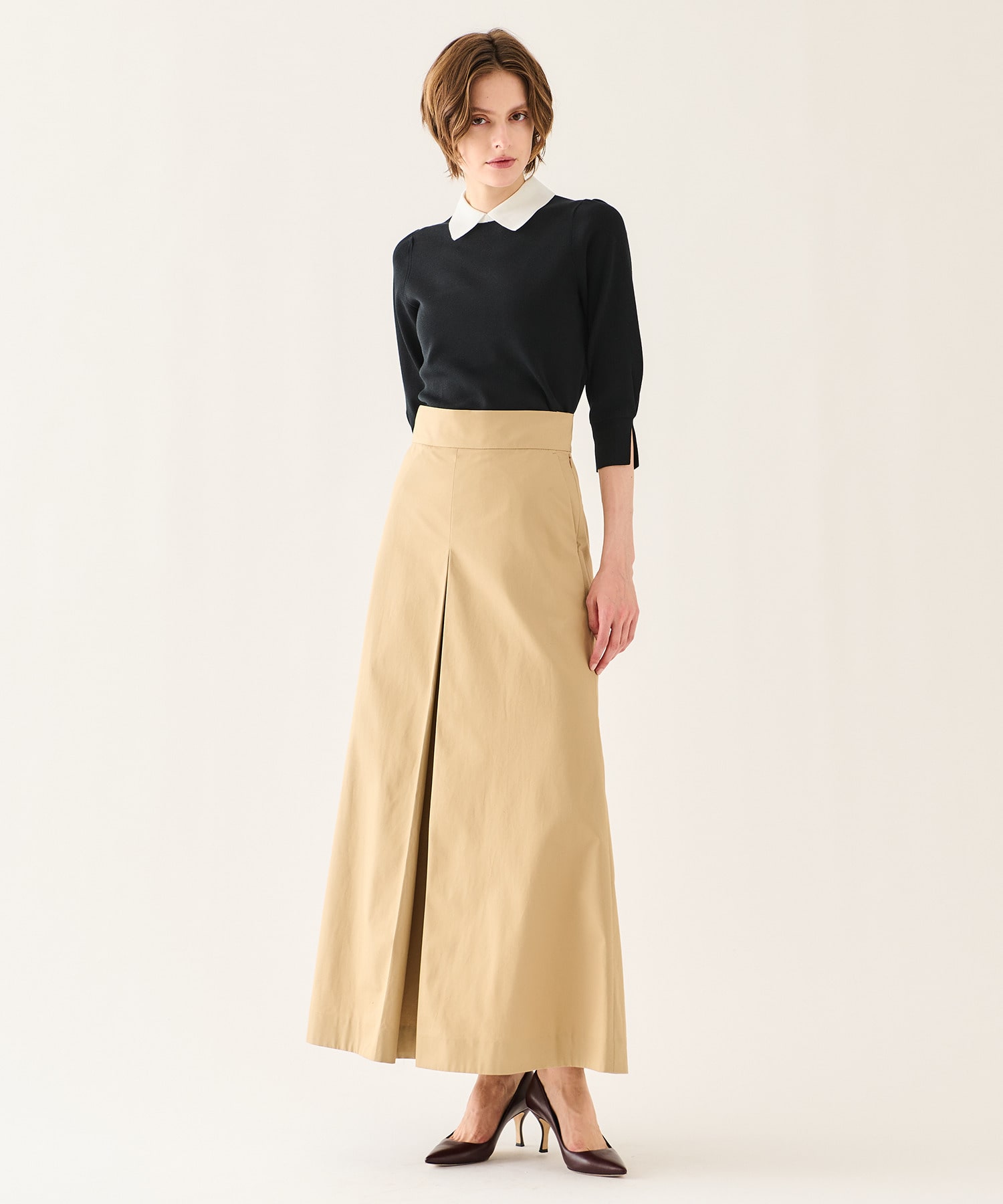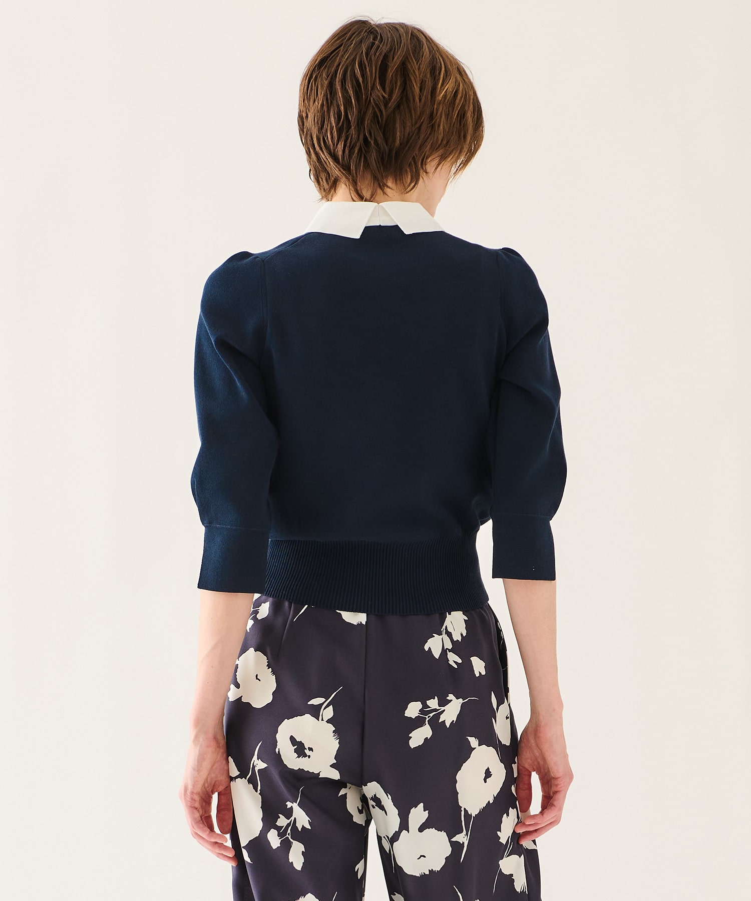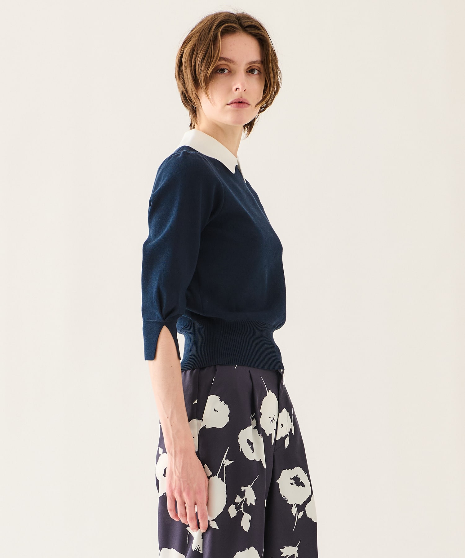 顔回りを華やかに見せてくれる襟は、少し襟腰をつけて首に沿うような仕上がりに。アウターのインナーでも襟がポイントになり、どんなボトムとも相性がよくスタイルが決まります。