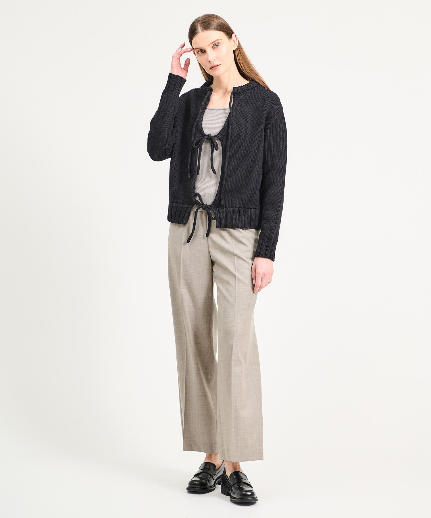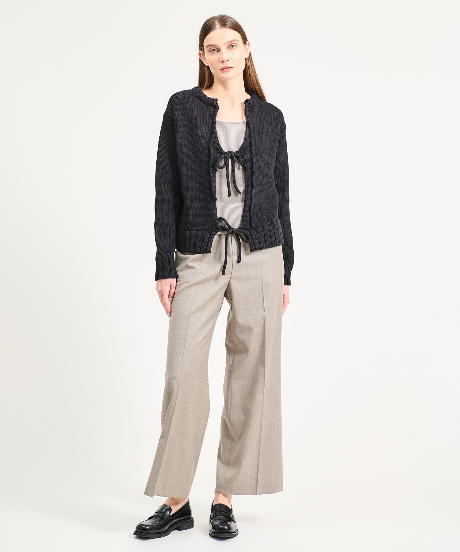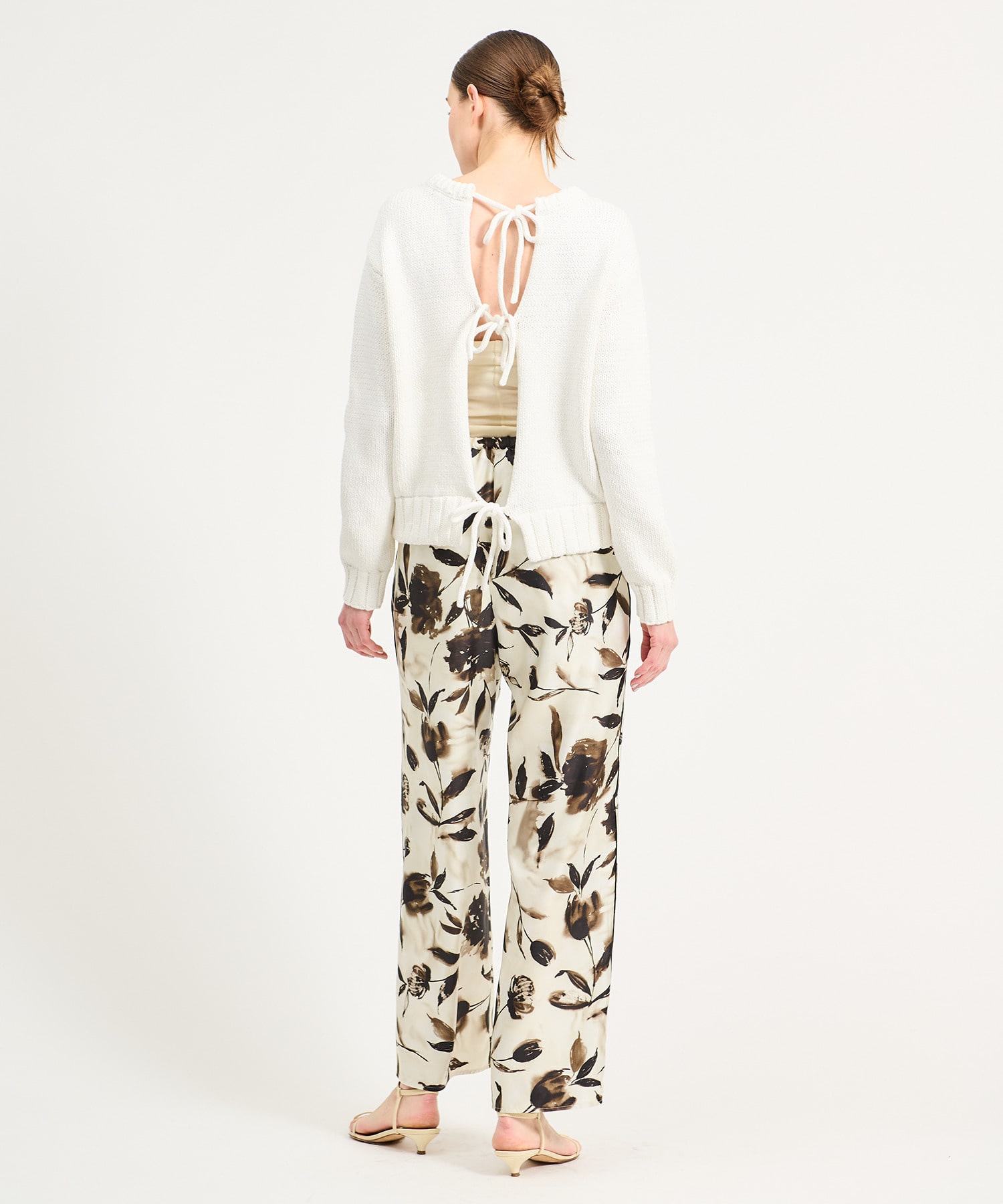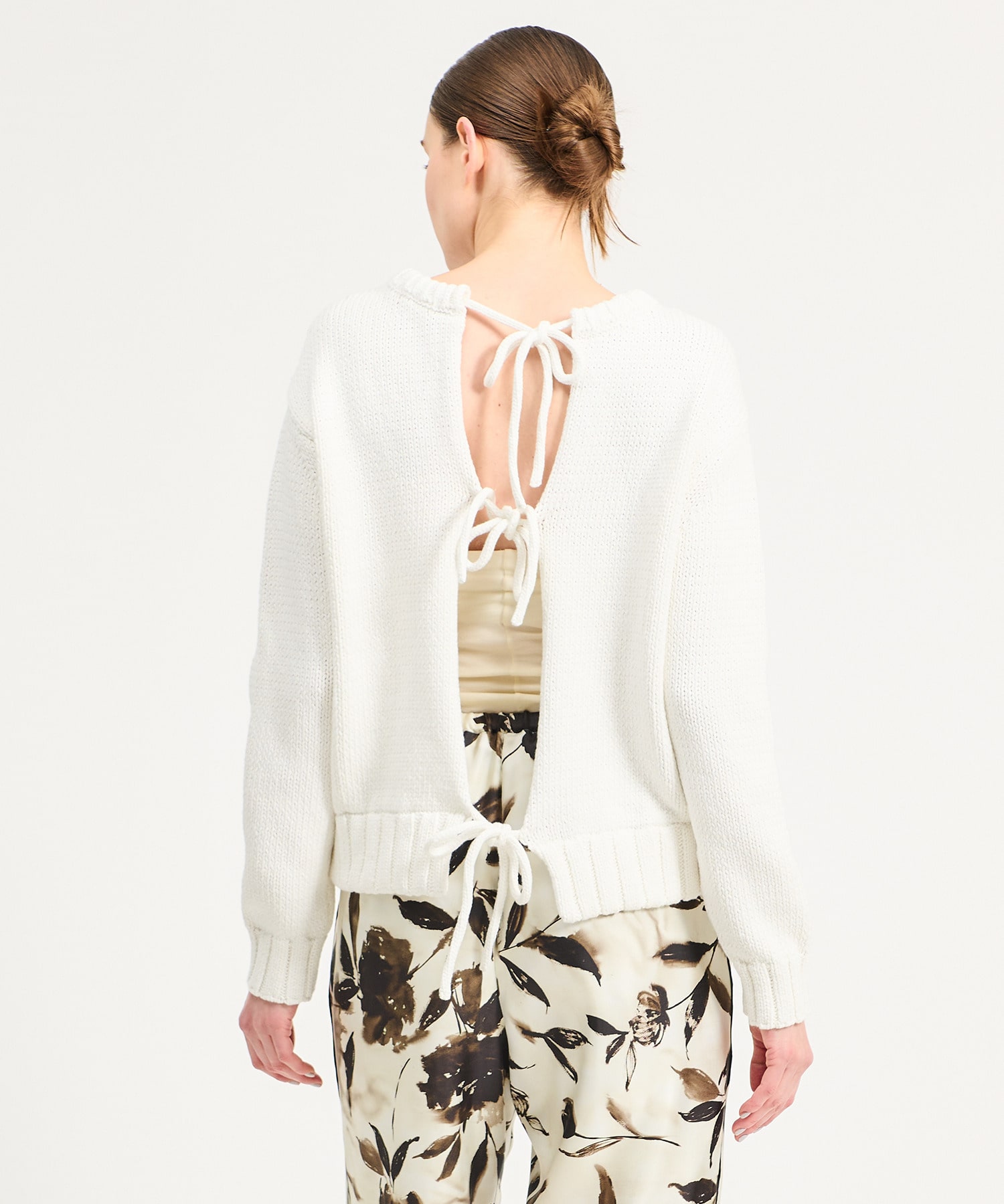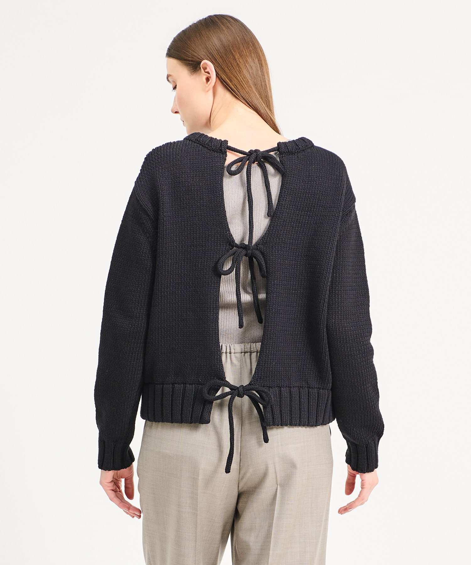 ゆったりとしたシルエットがリラックス感を演出し、センターバックにあしらったリボンがさりげないアクセントに。