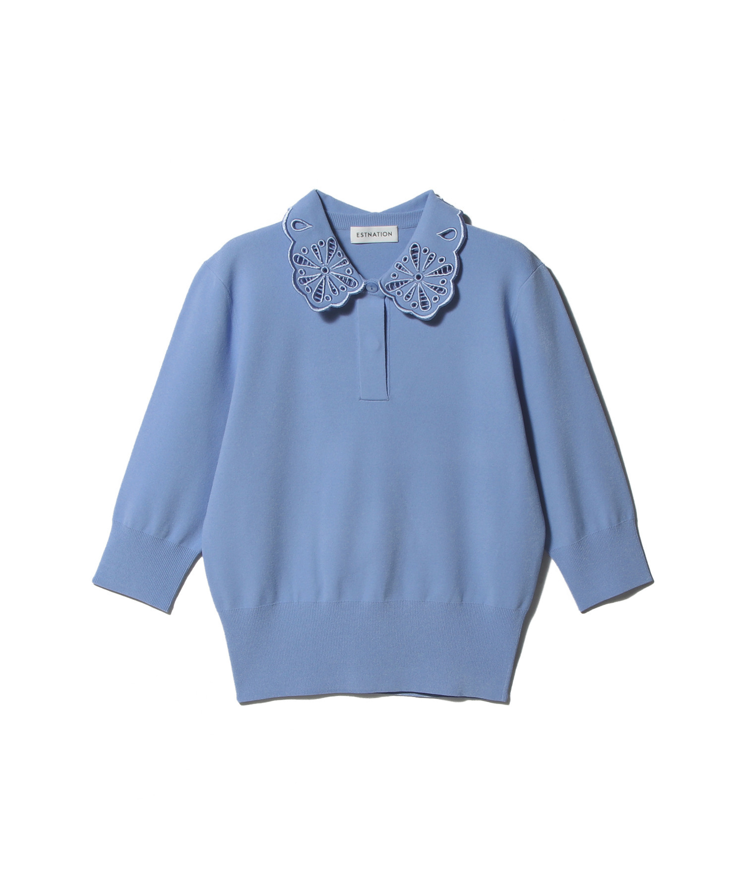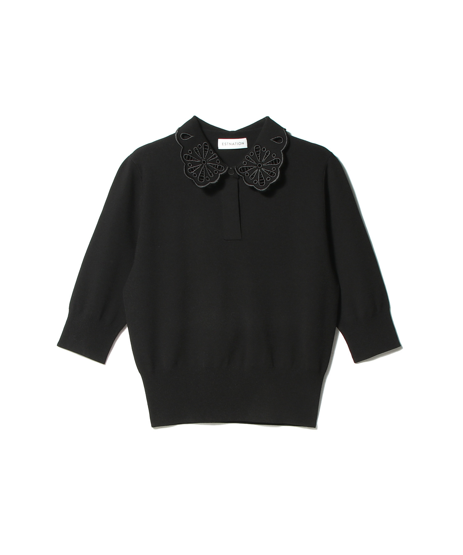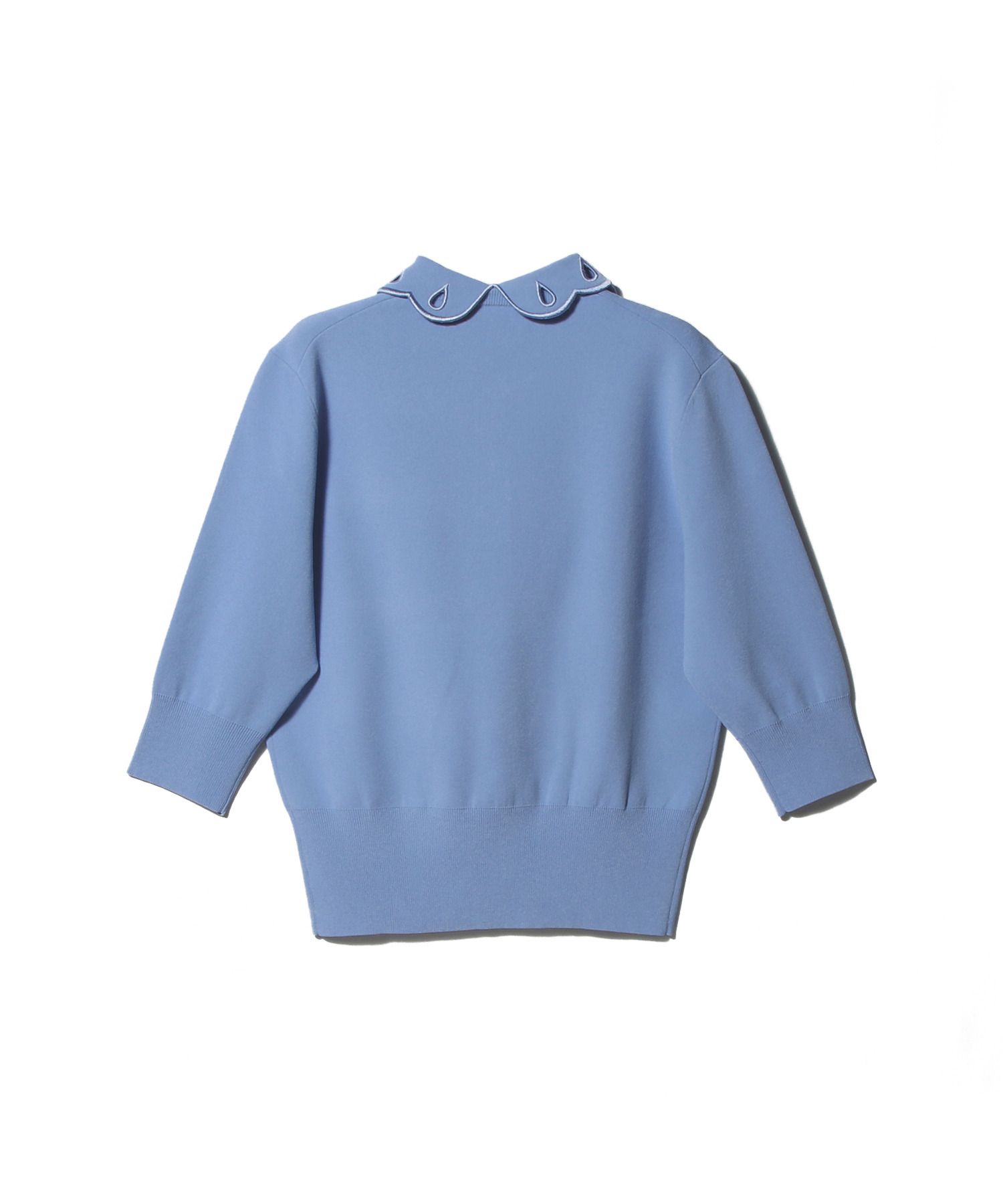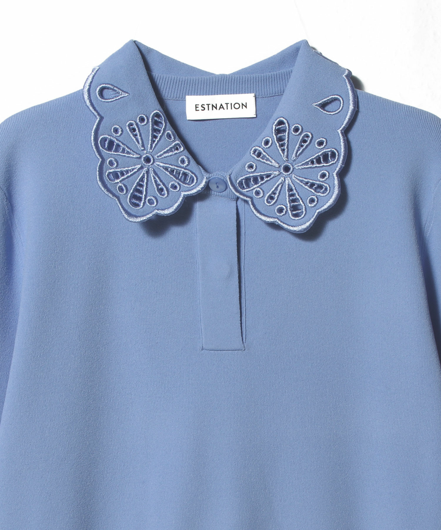 半袖ニットをベースに、オリジナル柄のエンブロイダリー襟をあしらったデザインがポイント。ヘンリーネック仕様で、ボタンを閉じればきちんと感のある上品な印象に、開ければ抜け感のあるスタイリングにと、シーンや気分に合わせてアレンジが可能です。