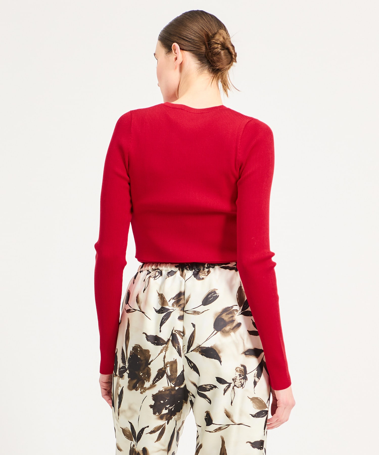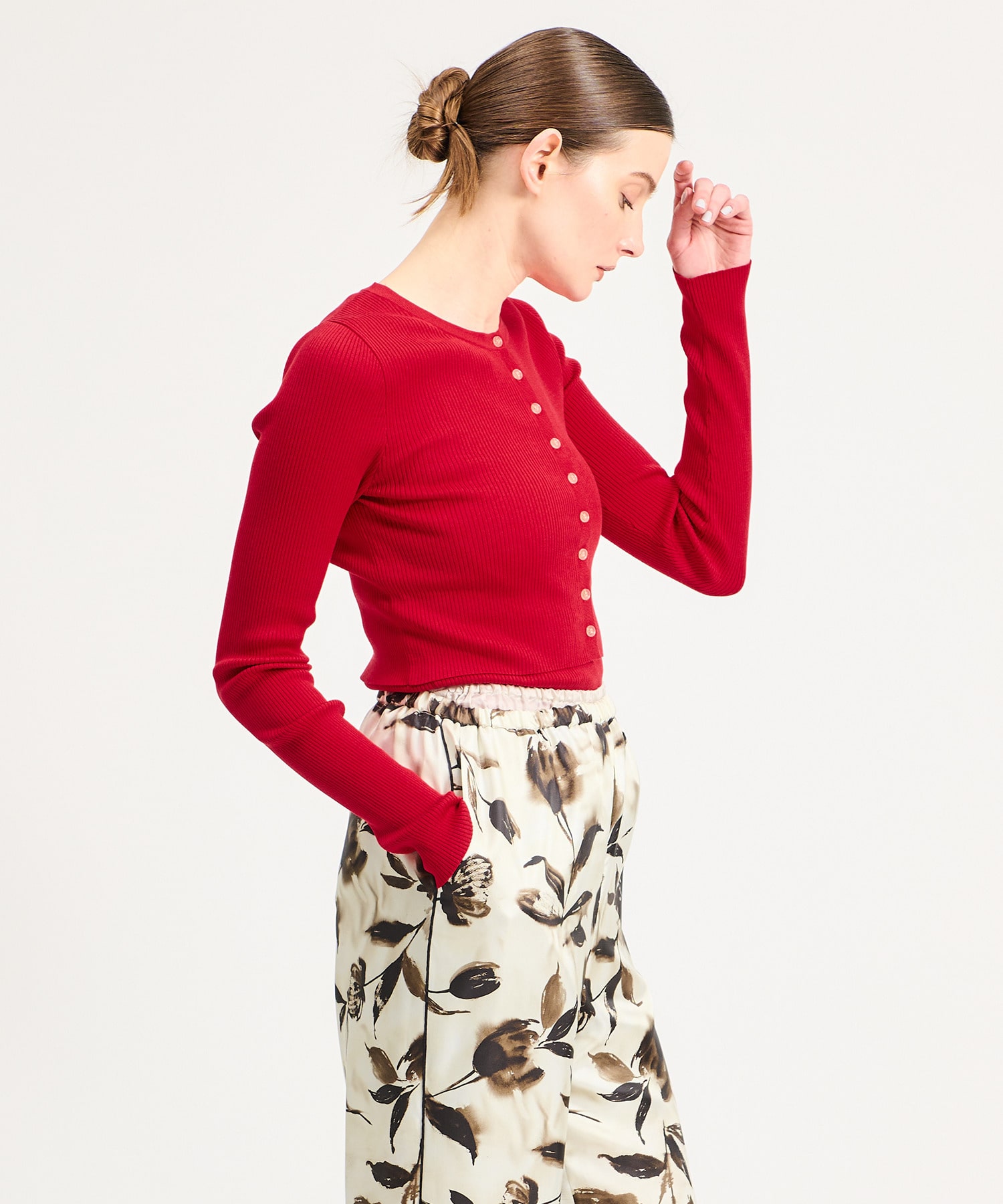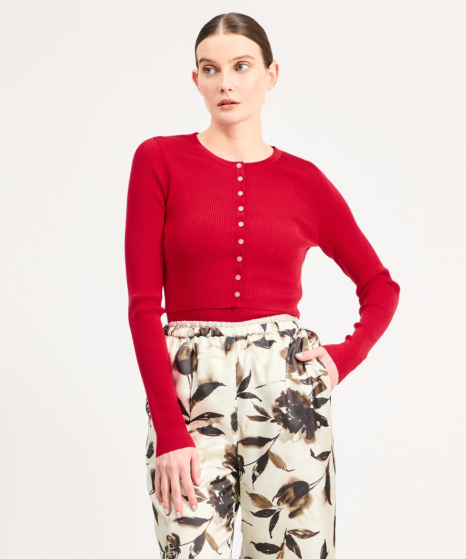 シルクをブレンドした上質な糸を使用し、ほどよいしなやかさと滑らかな肌触りを兼ね備えたショート丈カーディガン。