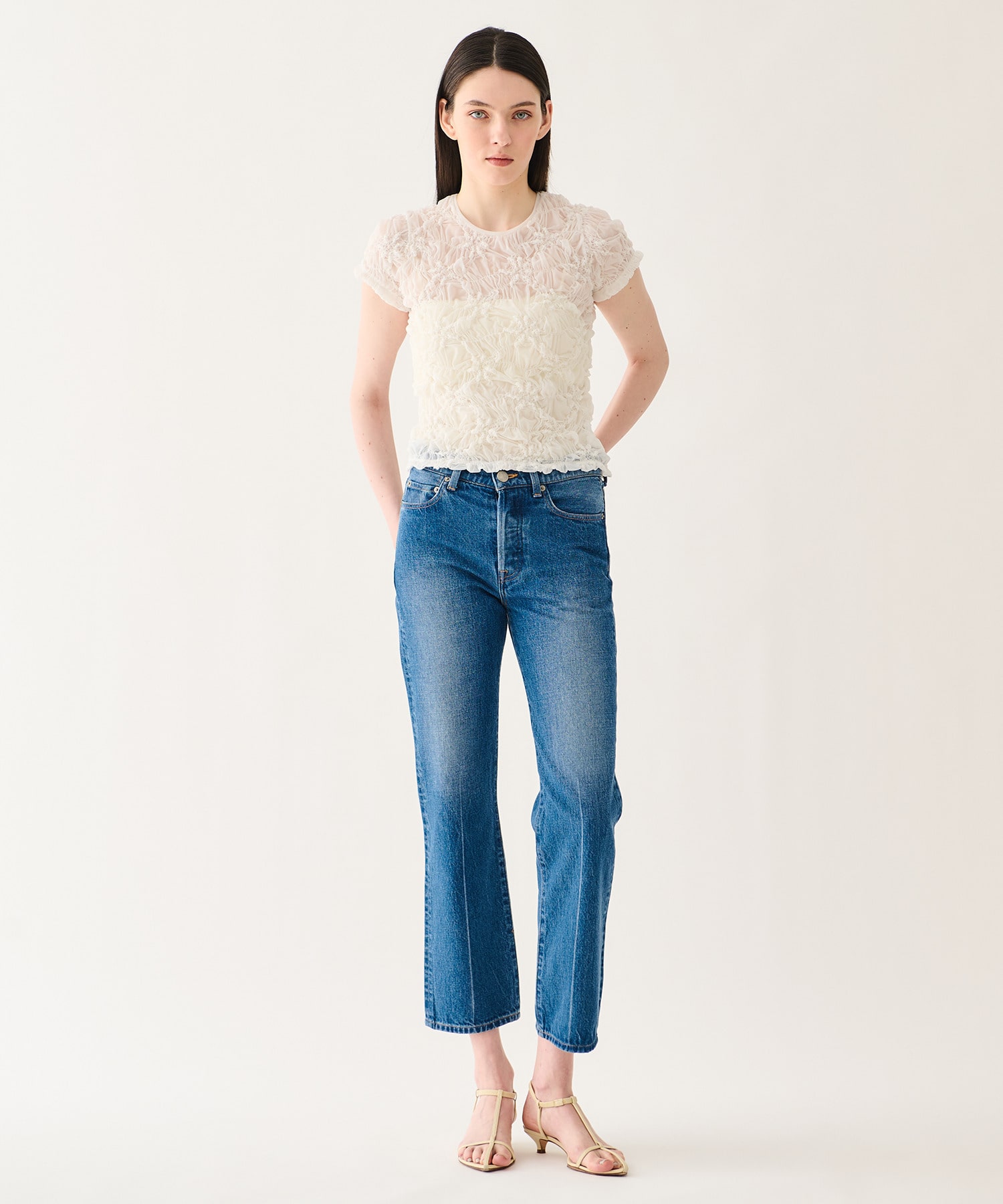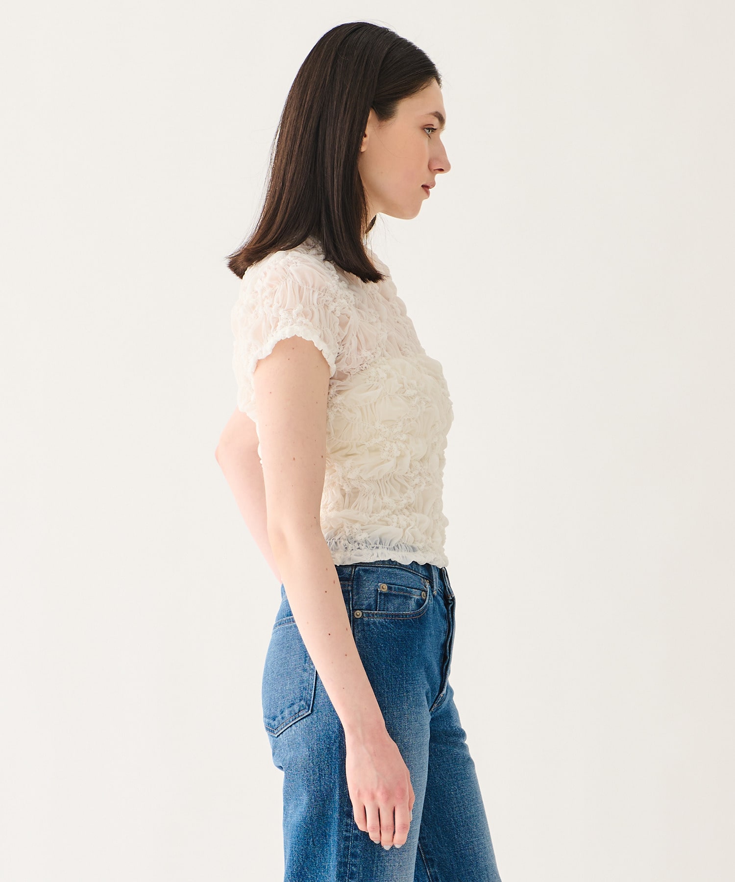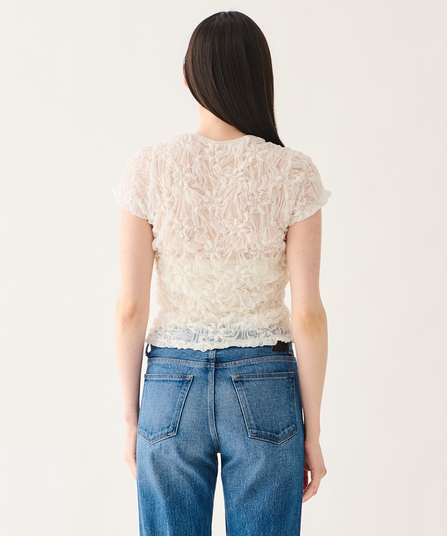 花柄のシャーリング刺繍が印象的な、オリジナル素材を使用したコンパクトTシャツ。