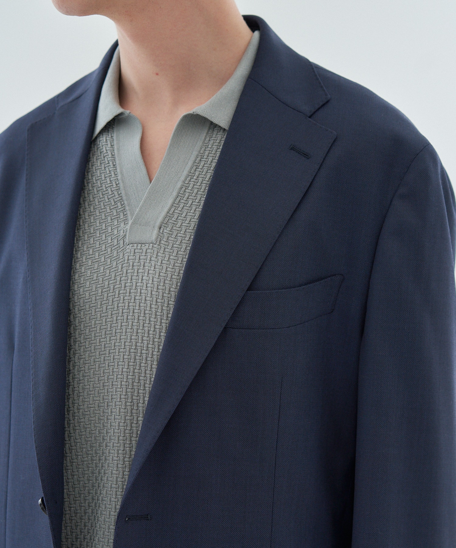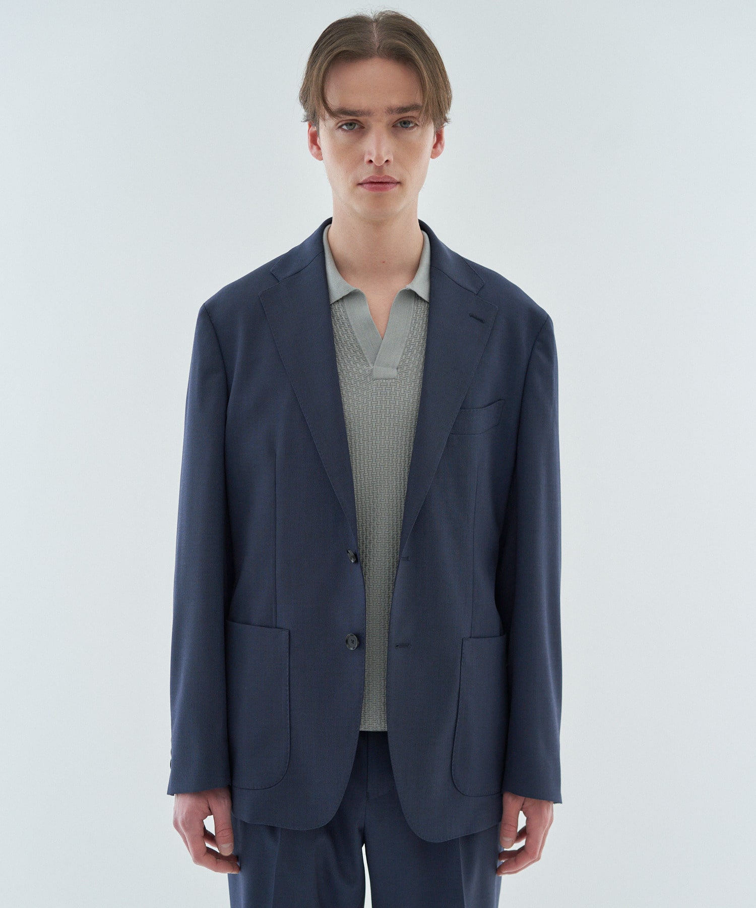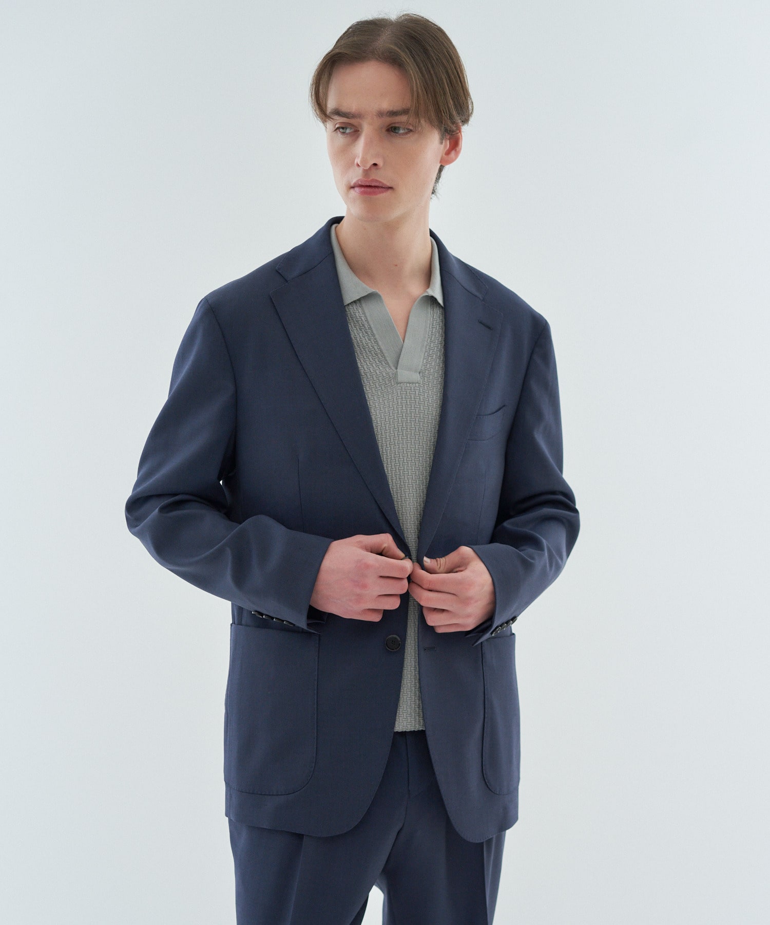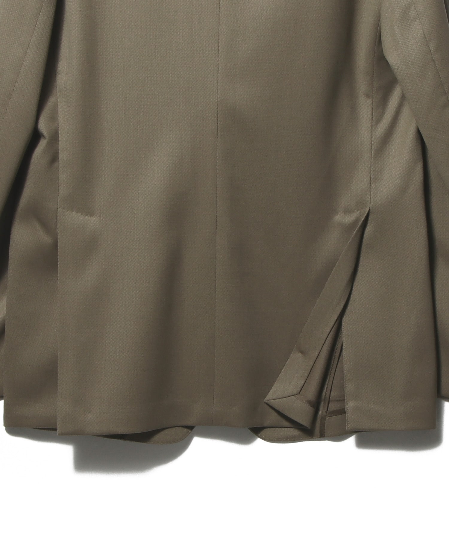 デザインはワイドラペルにバルカポケットを配したクラシックな2釦パッチ仕様。丸みのある肩まわりやゆとりを持たせたアームホールがリラックス感を演出しつつ、傾斜をつけた肩線や程よくシェイプしたウエストライン、カーブを描くフロントカットによって立体的で美しいシルエットが特徴です。