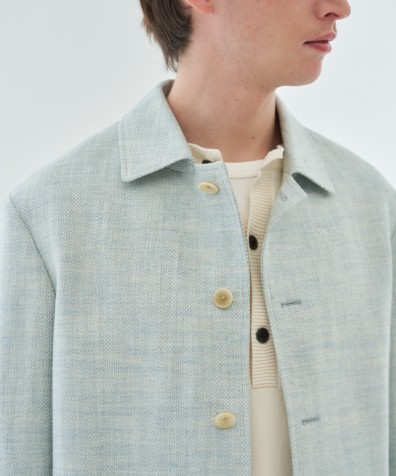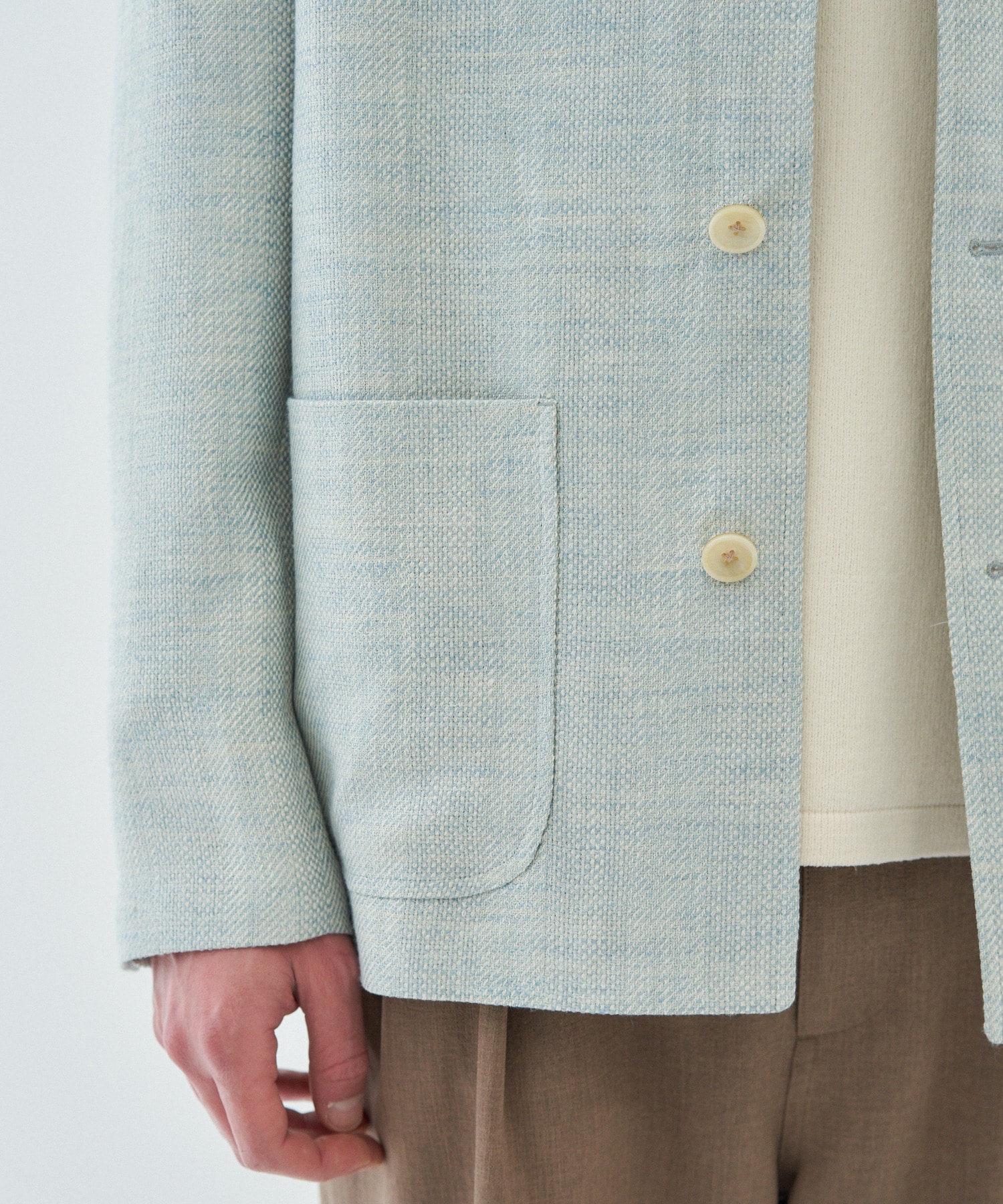 シルク、リネン、コットンをベースにした混紡糸により、光沢・清涼感・柔らかな風合いを持つ軽やかな生地に仕上げています。バスケット織りとカルゼ織りの組織差によって表現された表情が特徴で、白とサックスの色合いに加え、原料や糸番手差による奥行きのある色味と立体的な表面感が魅力です。