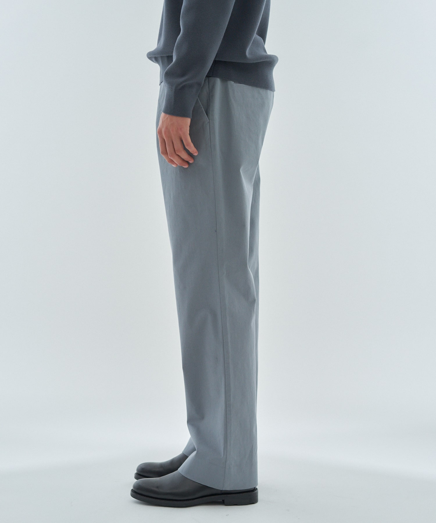 高密度ならではのハリ感に加え、適度な伸縮性とハイクオリティーな原料由来の上品な光沢が特徴です。程よいサイズ感で、ウエストから裾にかけてストレートに落ちる美しいシルエットを構築。身頃続きのベルト仕様によりリラックスした印象を与え、製品洗いを施したカジュアルスラックスに仕上げています。フロントのダブルループがさりげないデザインポイント。さらに高密度素材にボールバイオウォッシュをかけることで、滑りのあるソフトなタッチと程よいフェード感を表現しています。
