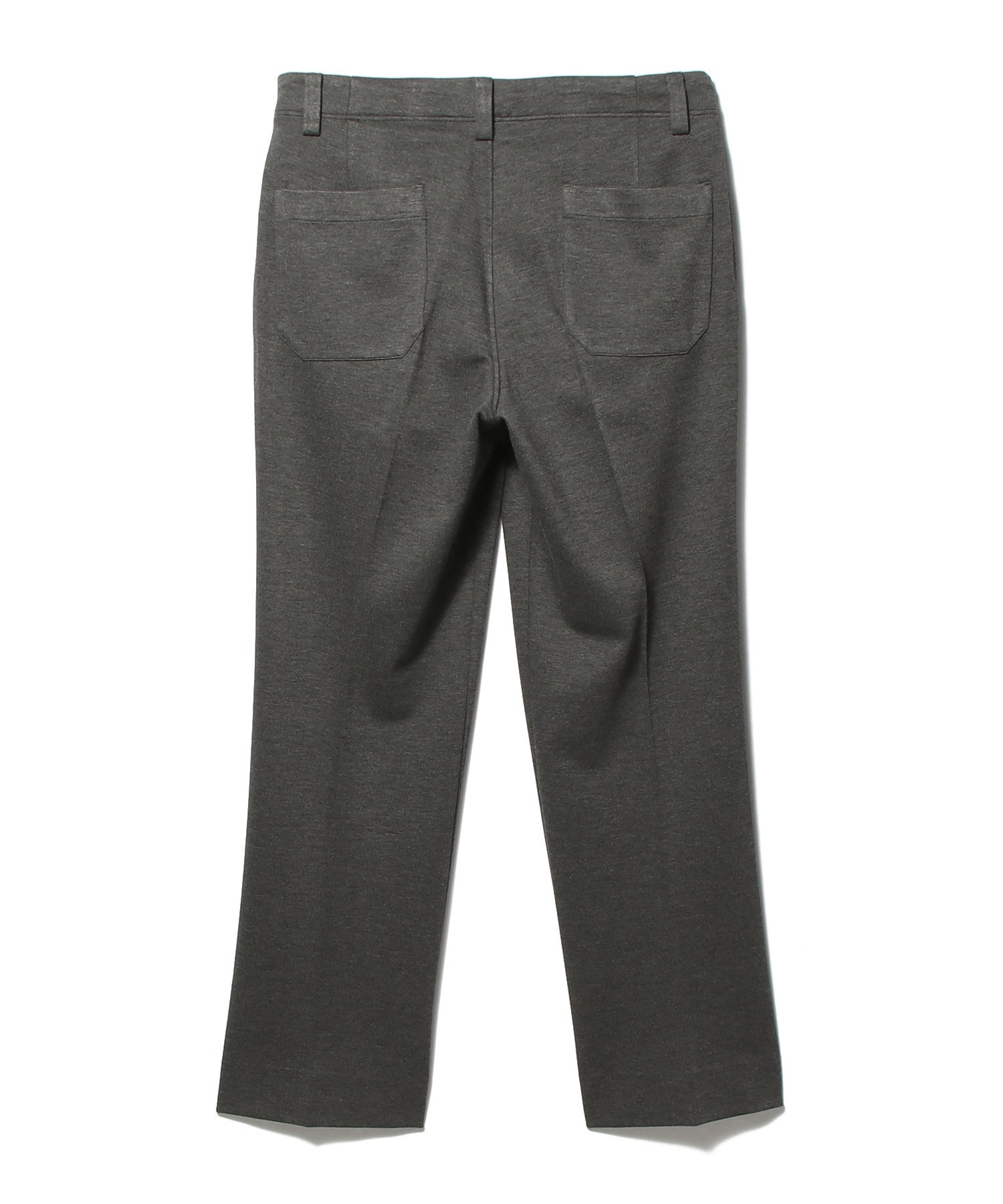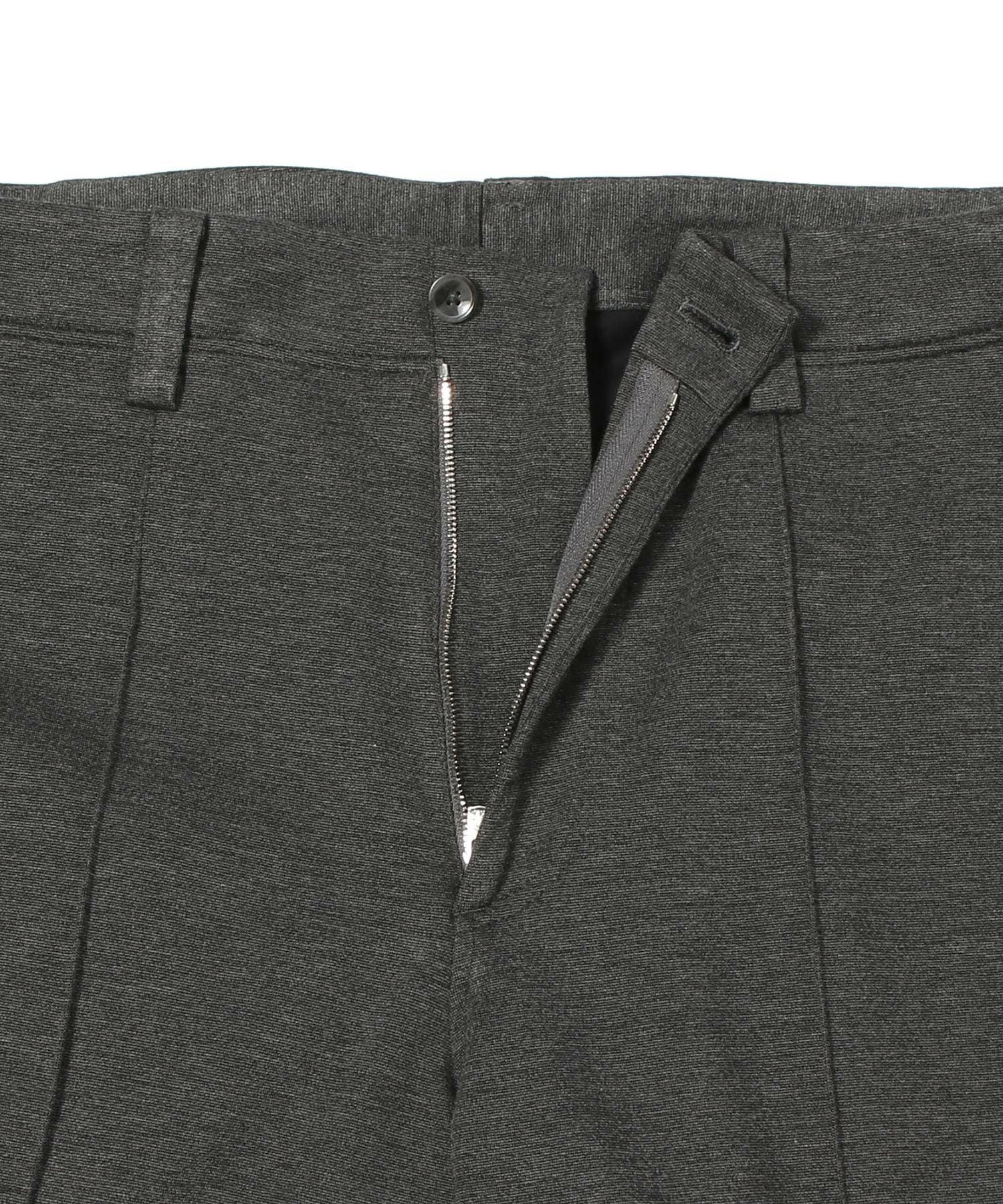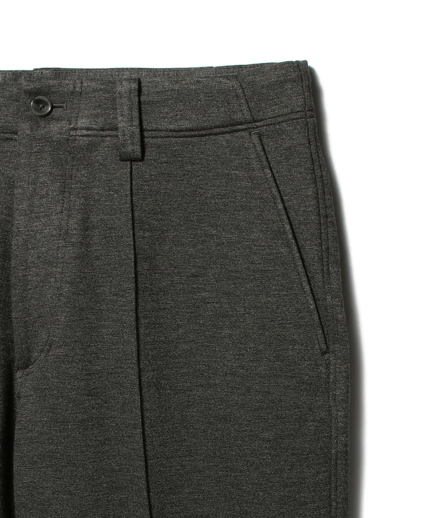 高密度に編み立てられたジャージでありながら、優れたストレッチ性とキックバック性、保形性を備え、滑らかな肌触りが特徴です。ウエストにはドローコードを配し、フロントはピンタックでクリースラインを表現。帯ベルトを身頃続きにすることで、リラックス感のある佇まいに仕上げています。バックスタイルはパッチポケットを採用したカジュアルなデザイン。程よいサイズ感で、ウエストから裾にかけてストレートに落ちる、きれいなシルエットのスラックスです。