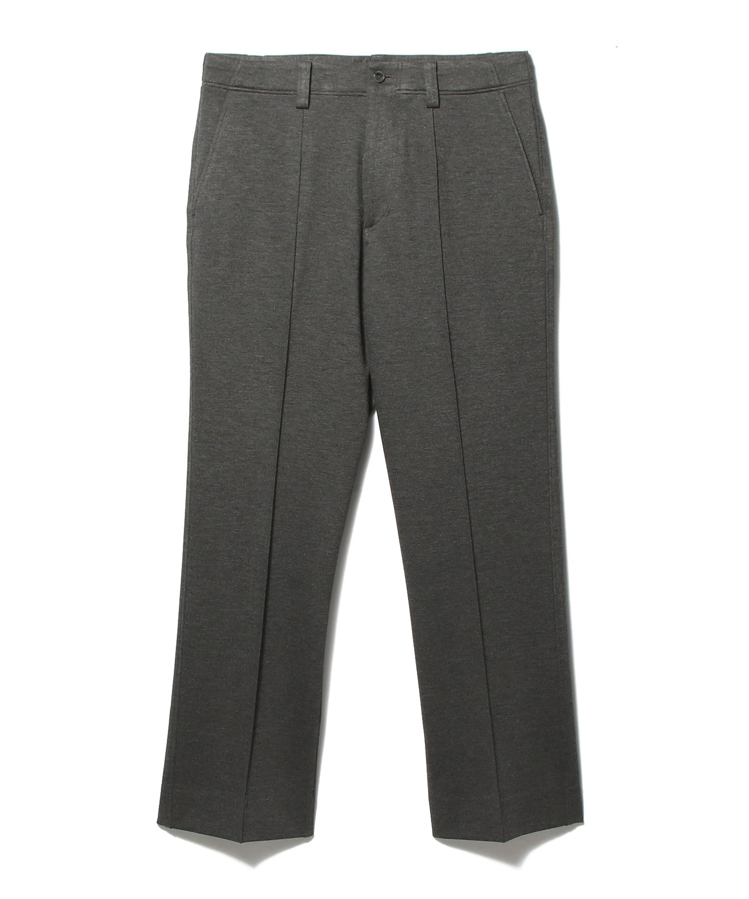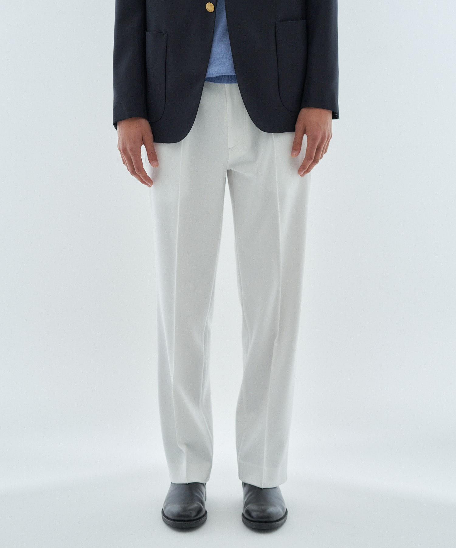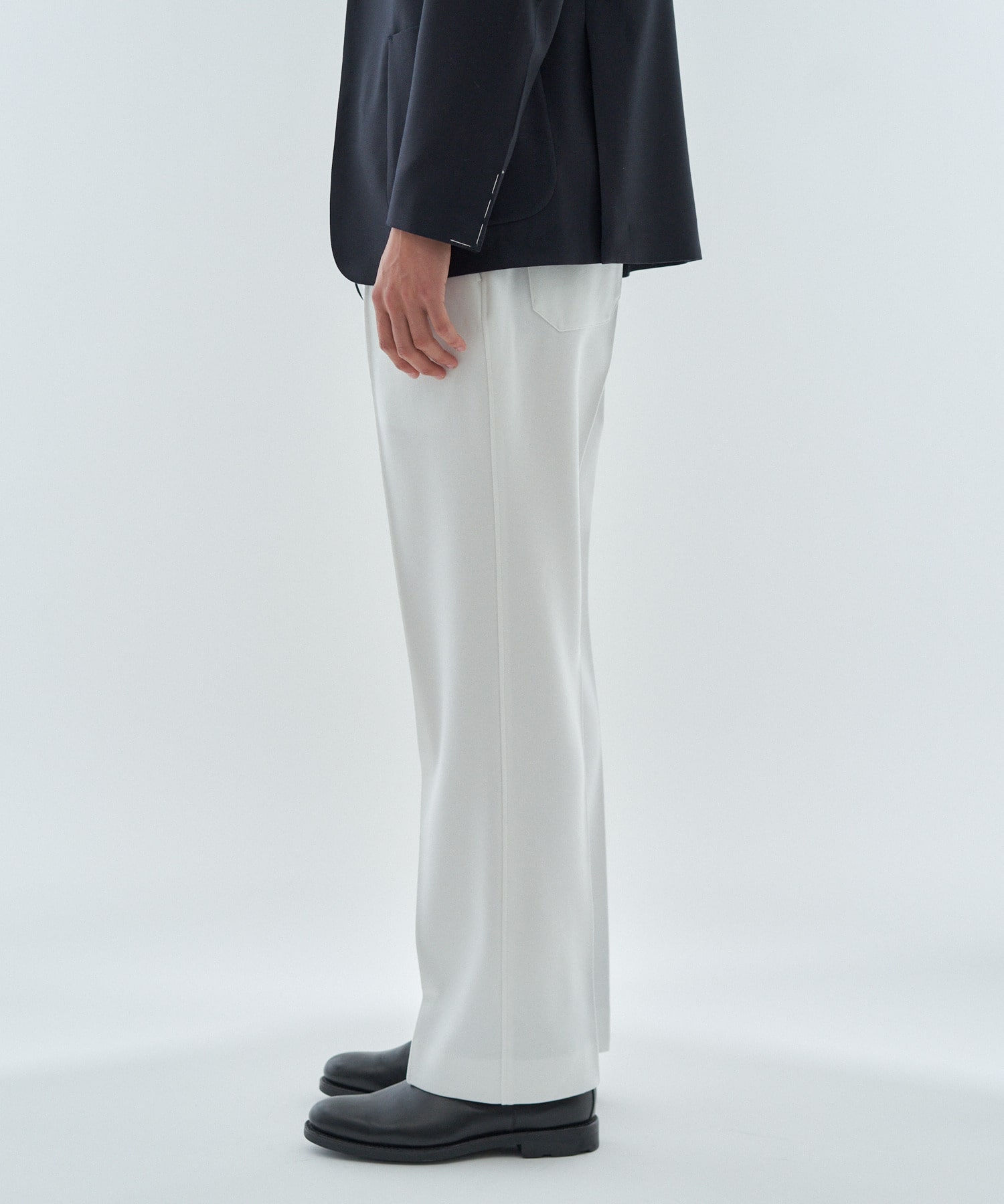 高密度に編み立てられたジャージでありながら、優れたストレッチ性とキックバック性、保形性を備え、滑らかな肌触りが特徴です。ウエストにはドローコードを配し、フロントはピンタックでクリースラインを表現。帯ベルトを身頃続きにすることで、リラックス感のある佇まいに仕上げています。バックスタイルはパッチポケットを採用したカジュアルなデザイン。程よいサイズ感で、ウエストから裾にかけてストレートに落ちる、きれいなシルエットのスラックスです。