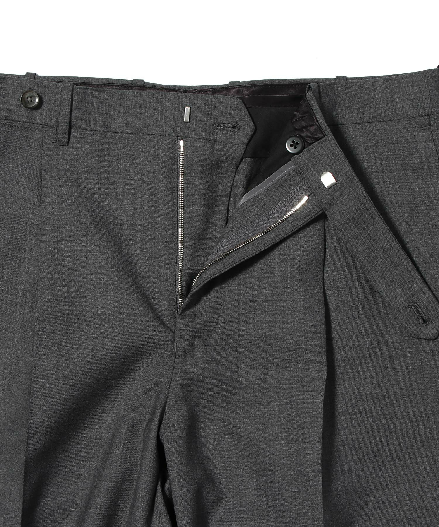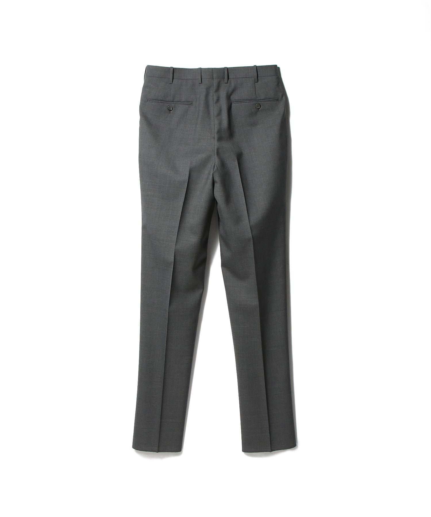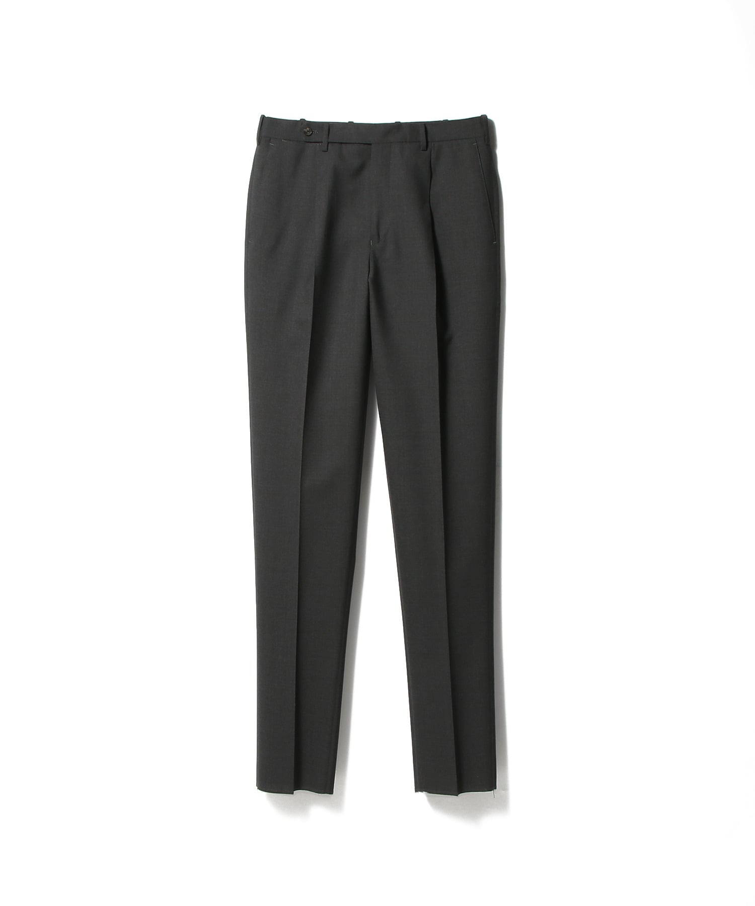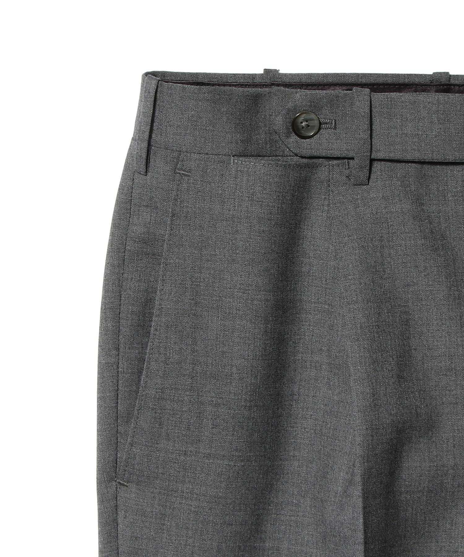 しっかりと打ち込むことで程よいハリ感を持たせつつ、適度な伸縮性も兼ね備えた快適な生地です。シルエットはヒップから渡りにかけて脇の膨らみを抑え、膝から裾にかけてテーパードをかけた上品な細身ライン。1プリーツ仕様で立体的なシルエット。フロントを長めに設定した持ち出しがデザインのアクセントとなり、上質さと実用性を両立した一本です。