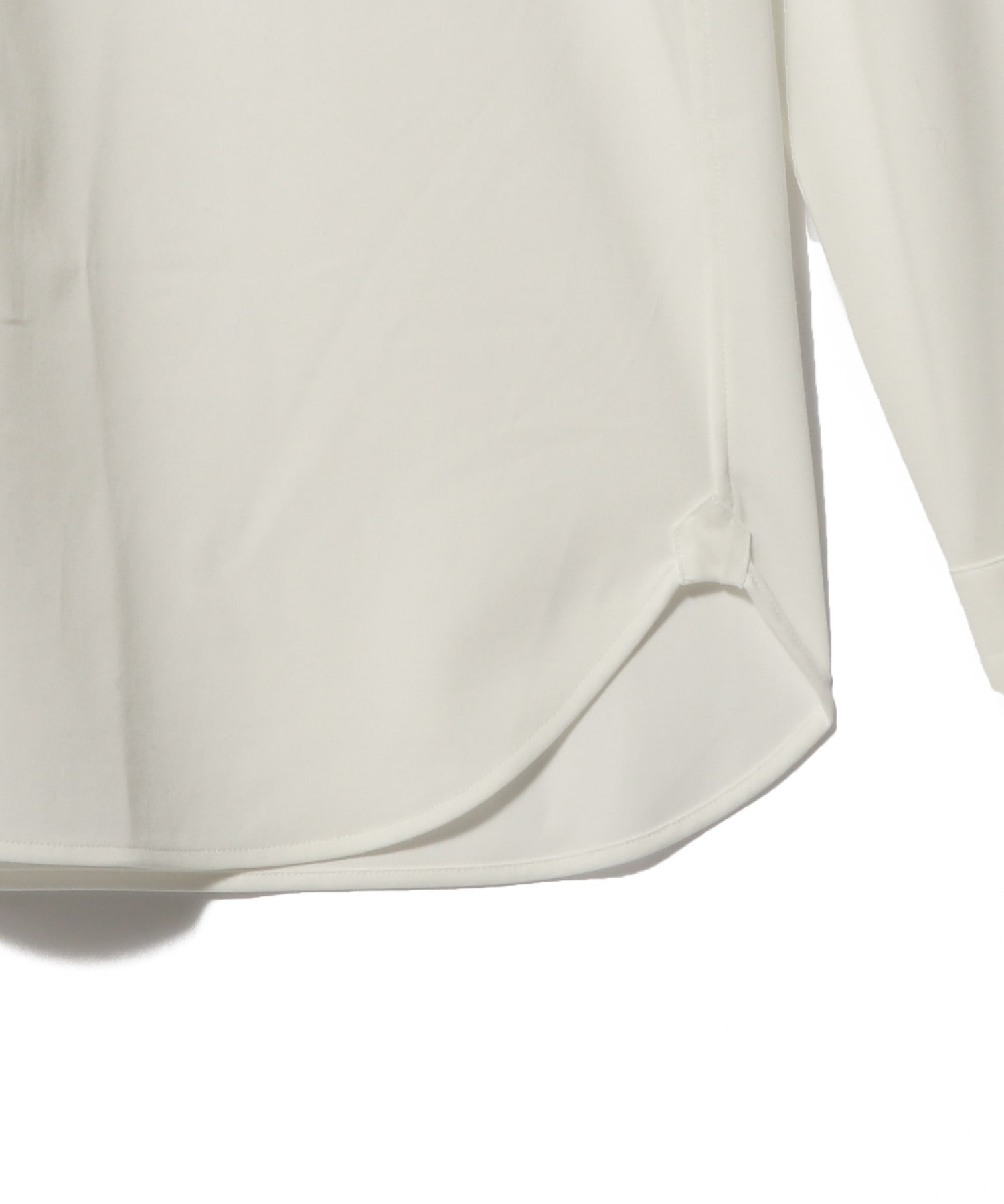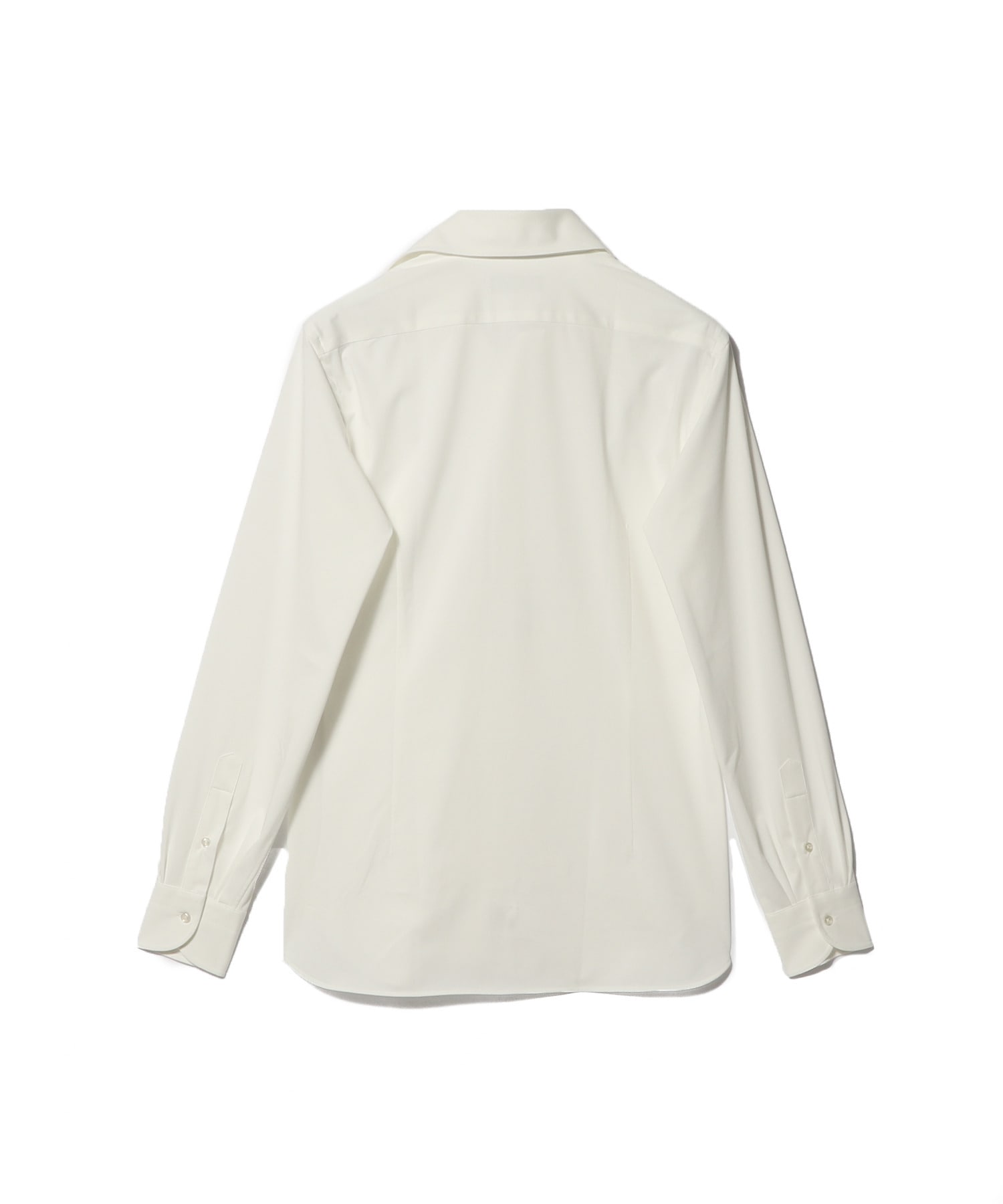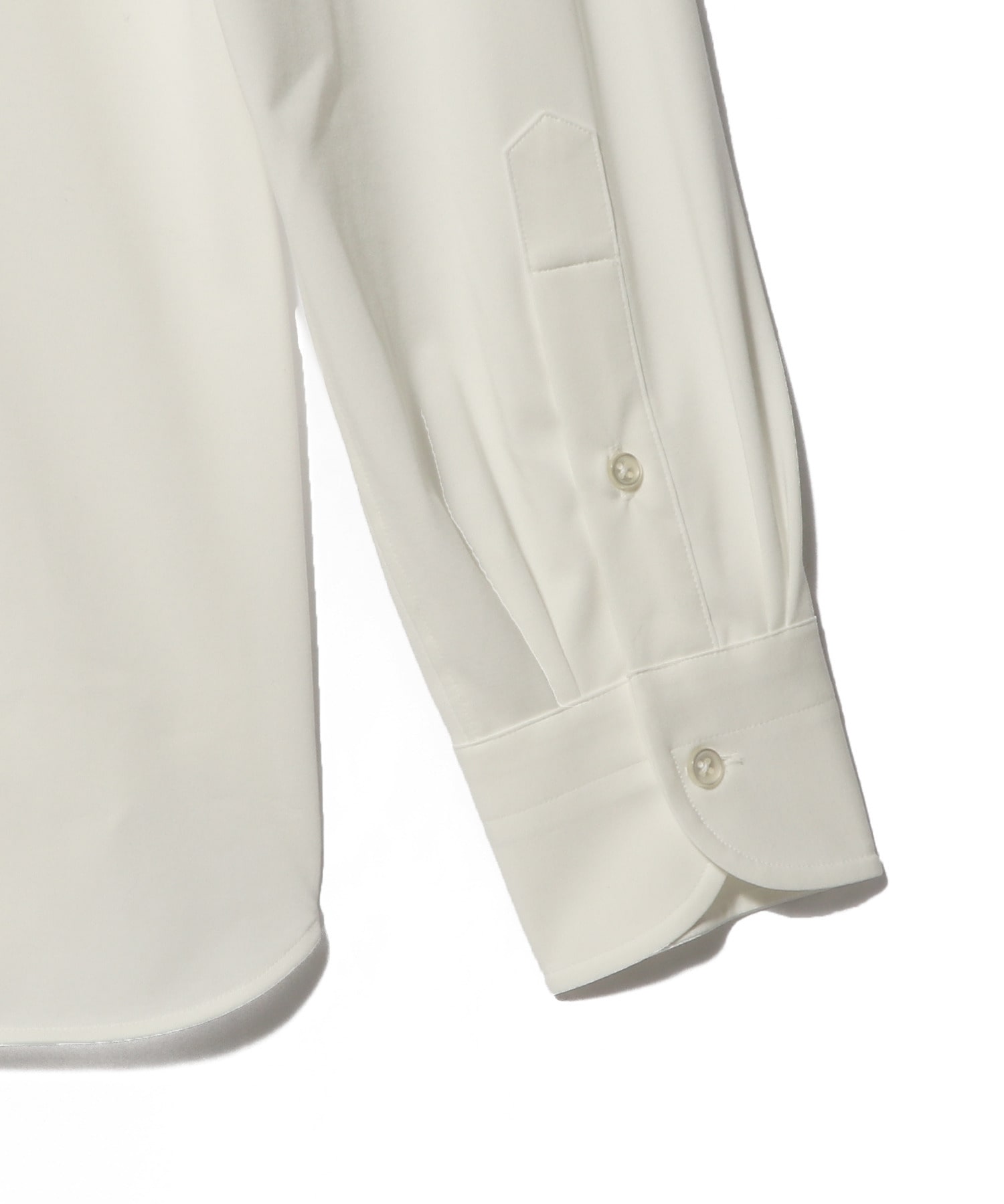 台衿をやや高めに設定し、ソフトな衿芯にすることでジャケット着用時も美しく収まり、ノータイでも自然な開きになるよう釦位置を調整しています。裾はクラシックなラウンドカット、袖口は4本タック仕様で端正な印象に仕上げました。