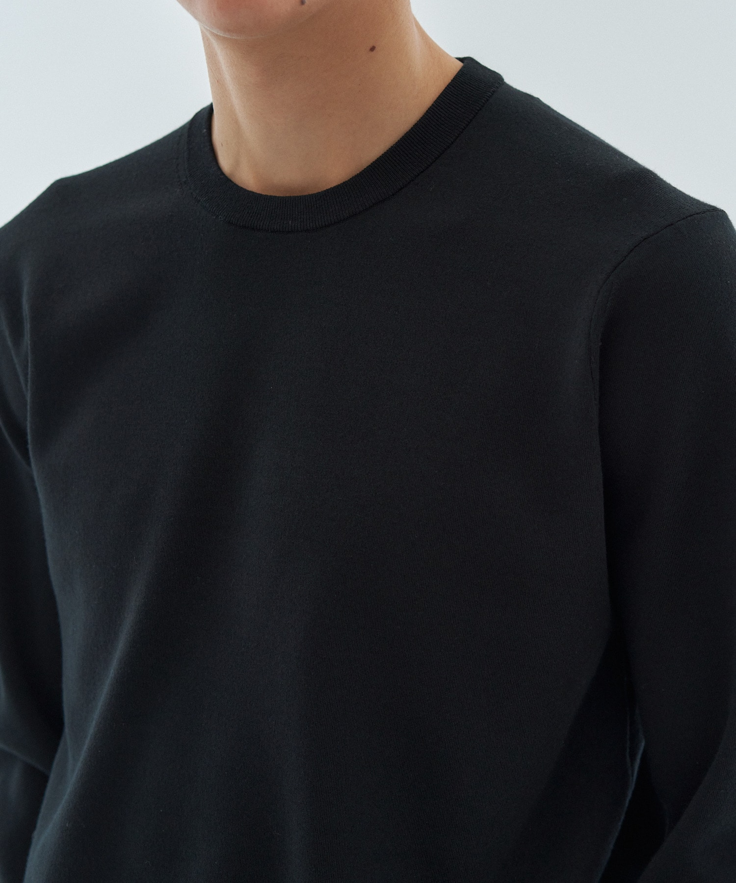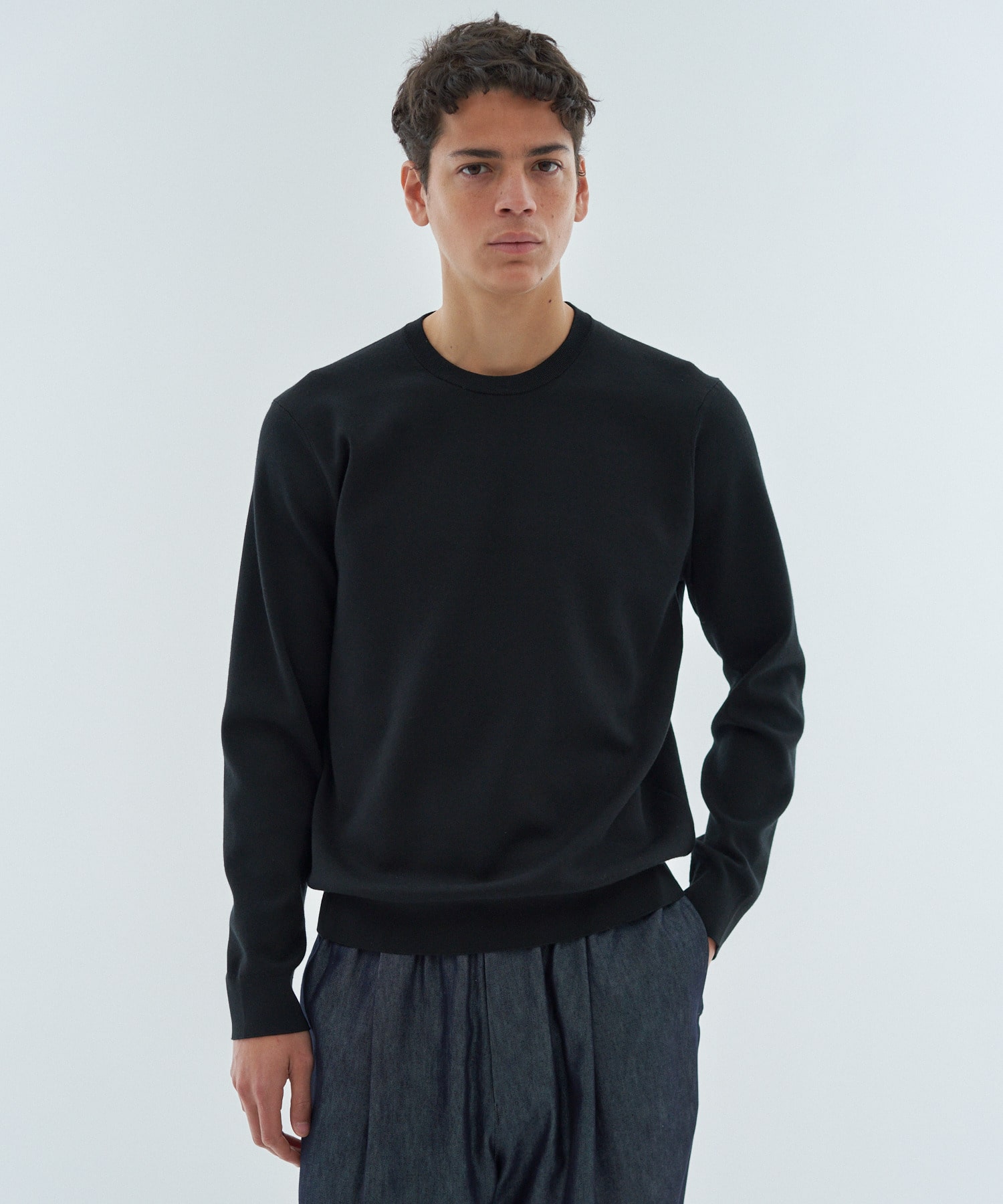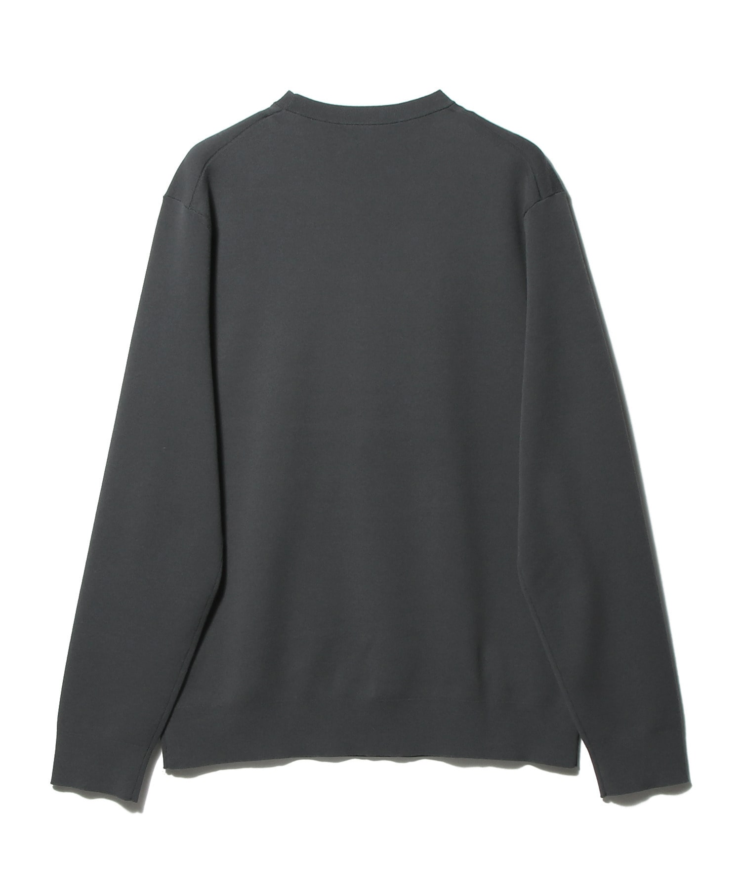 高いストレッチ性に加え、軽さとふくらみを併せ持つ独特の嵩高性が特徴です。18Gのスムース編みにより、カットソーのような軽やかさとニットならではの上質なタッチを両立。ほどよくゆとりのあるクルーネックデザインで、ジャケットのインナーとしても一枚着としても品良く着用いただけます。