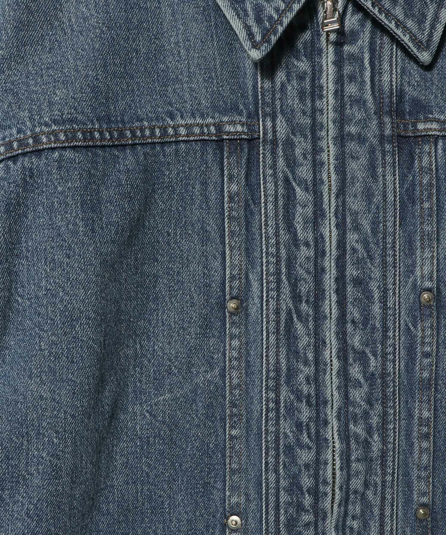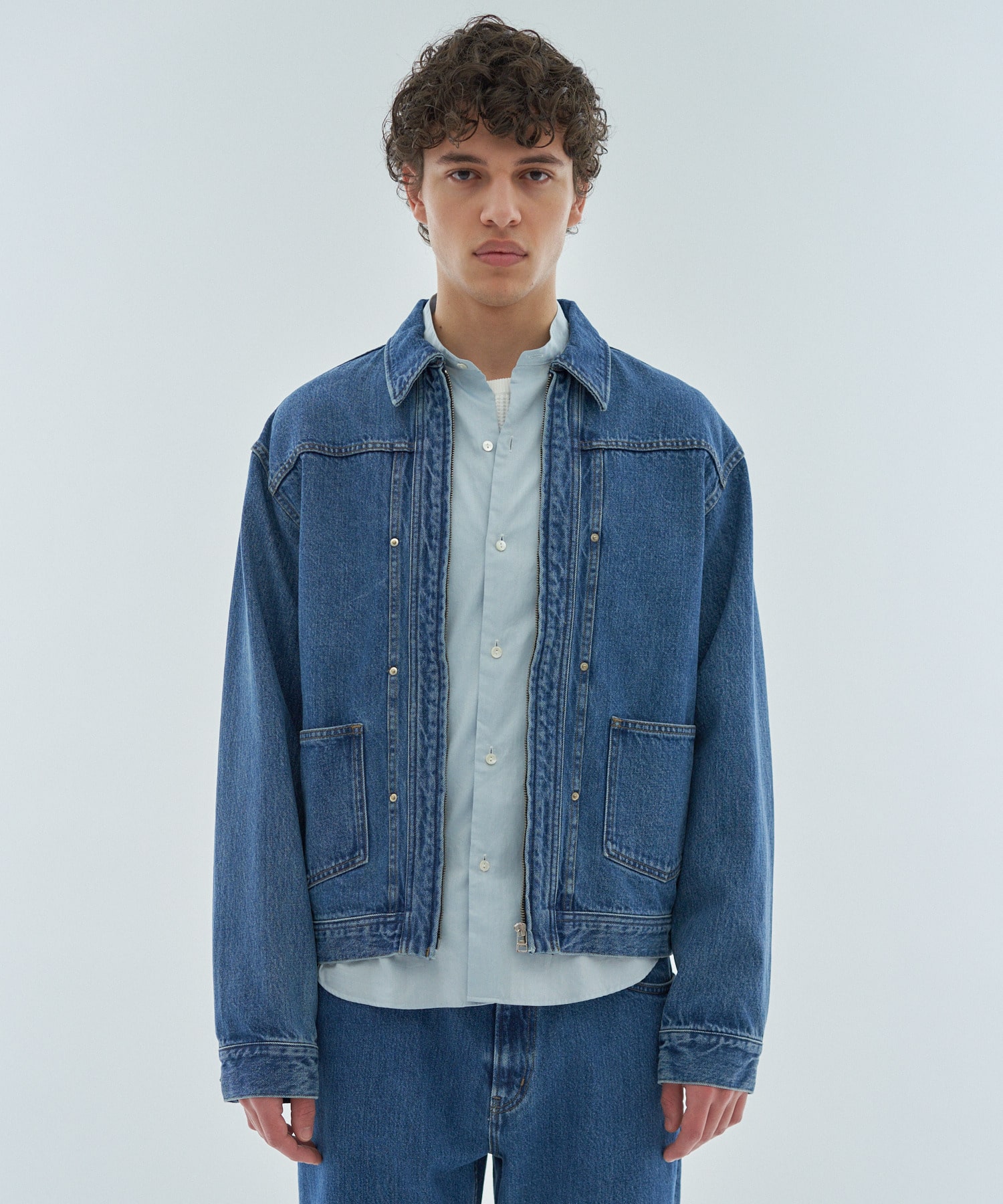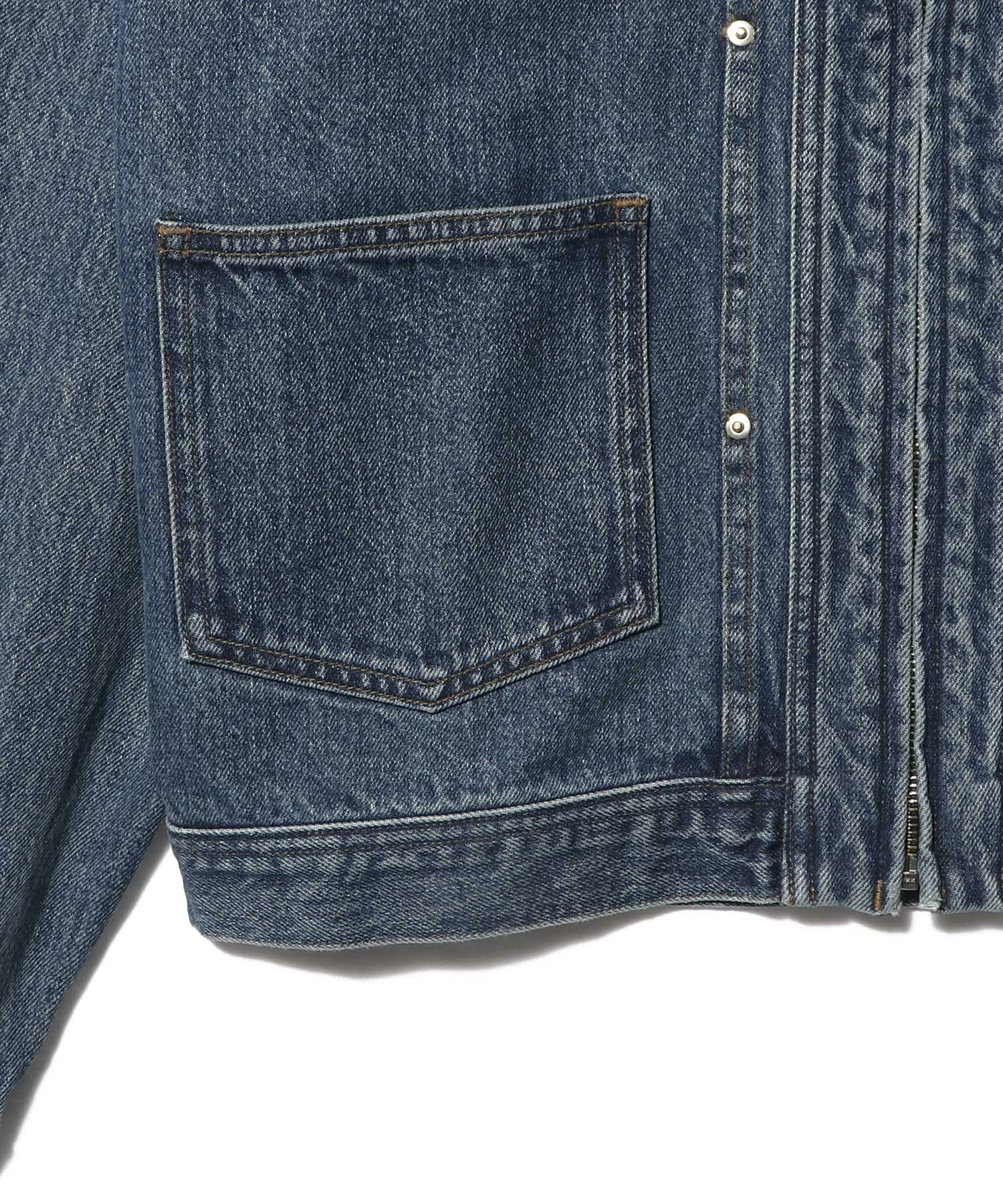 フロントの両裾にポケットを配したジップアップのデニムジャケット。