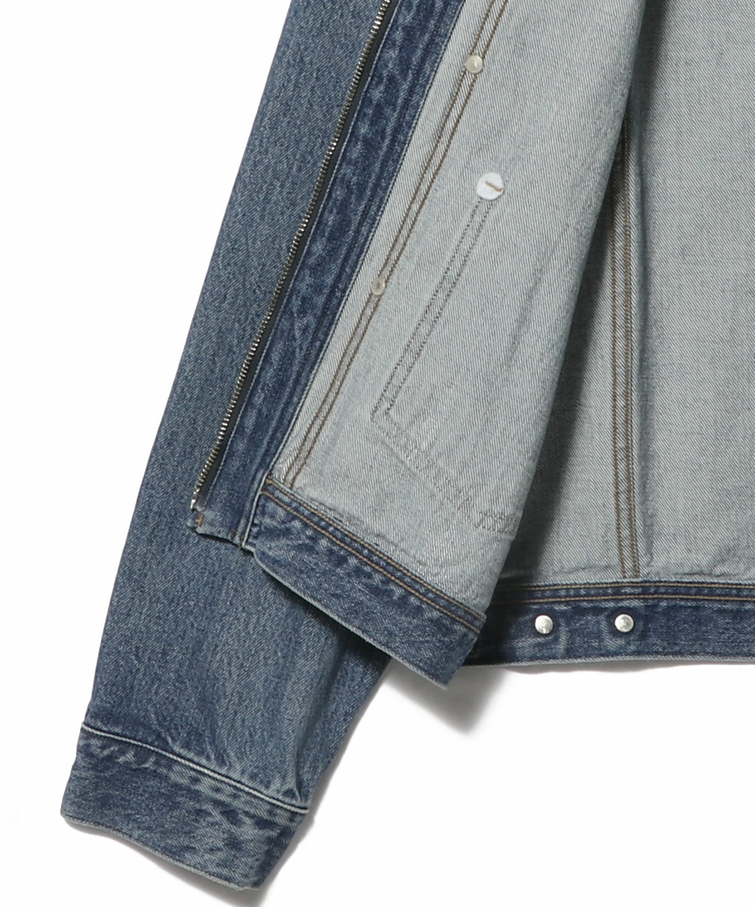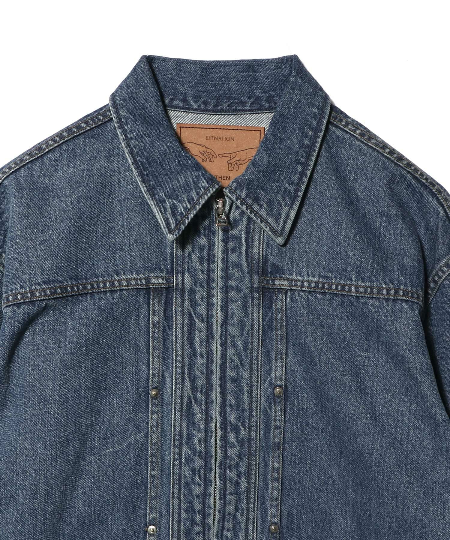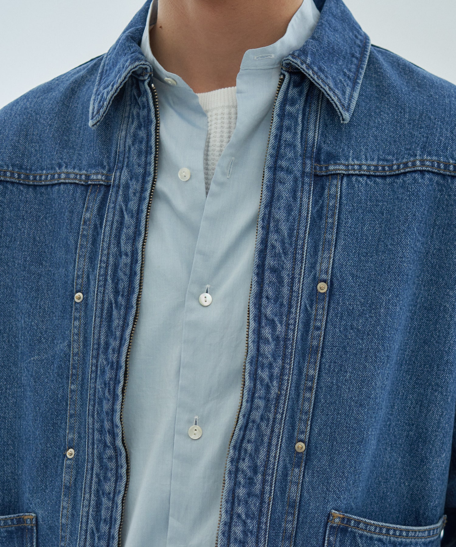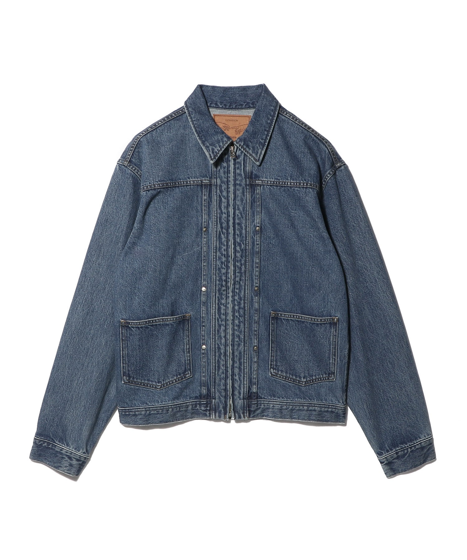 フロントの両裾にポケットを配したジップアップのデニムジャケット。