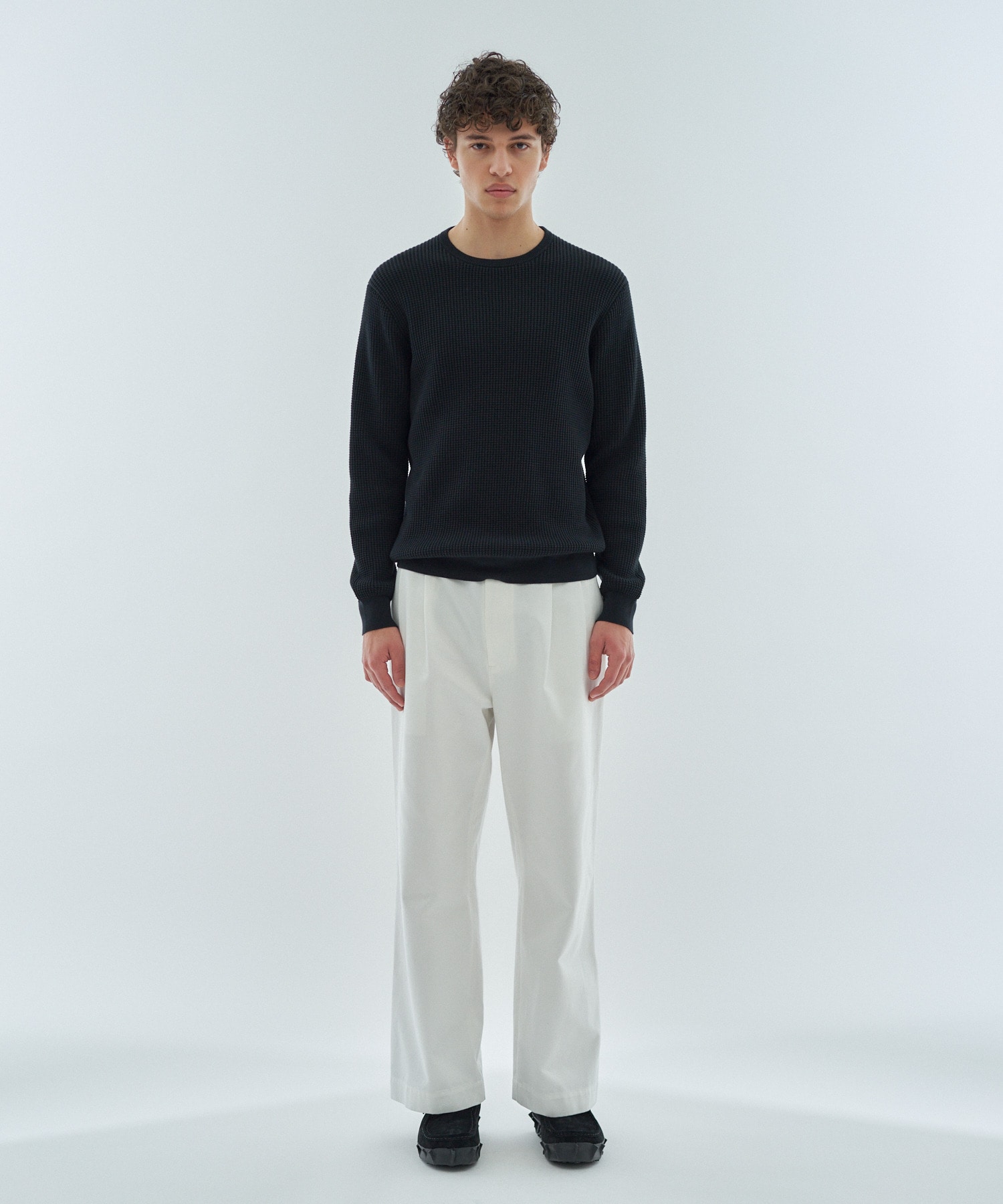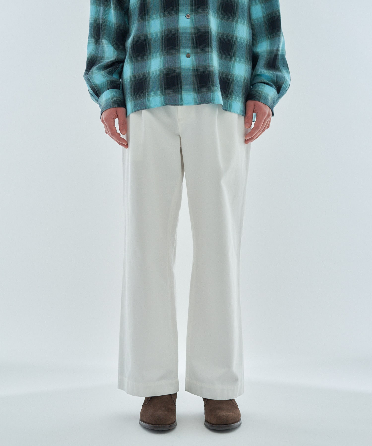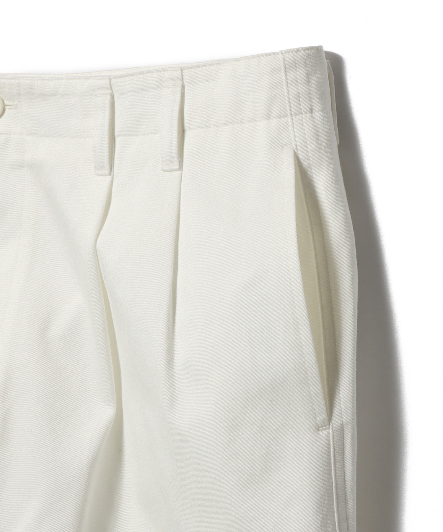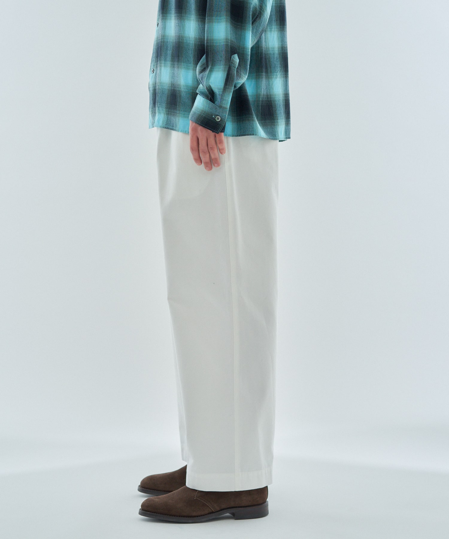 高密度に織り上げたウエストポイント生地を使用したワイドチノパンツ。