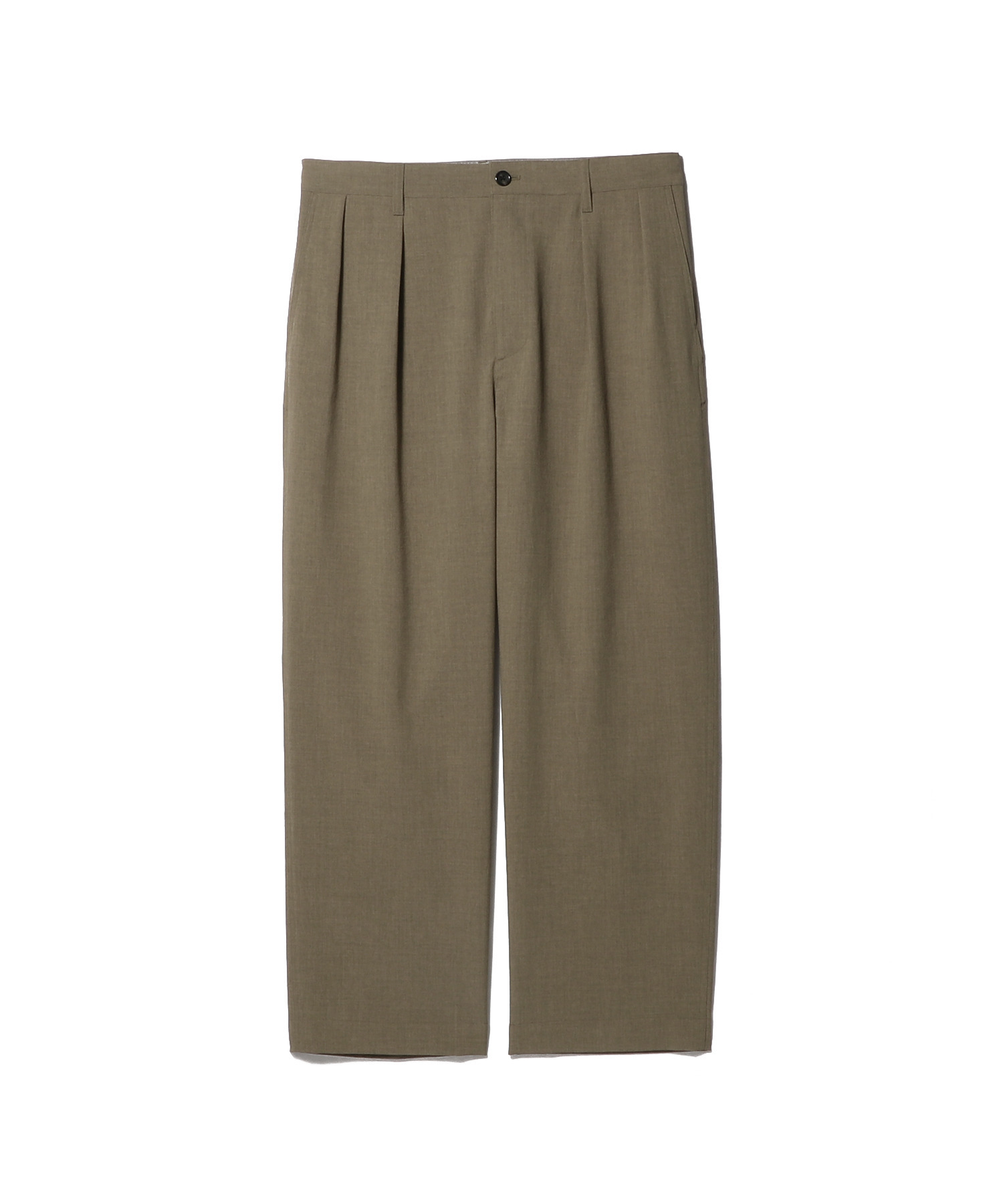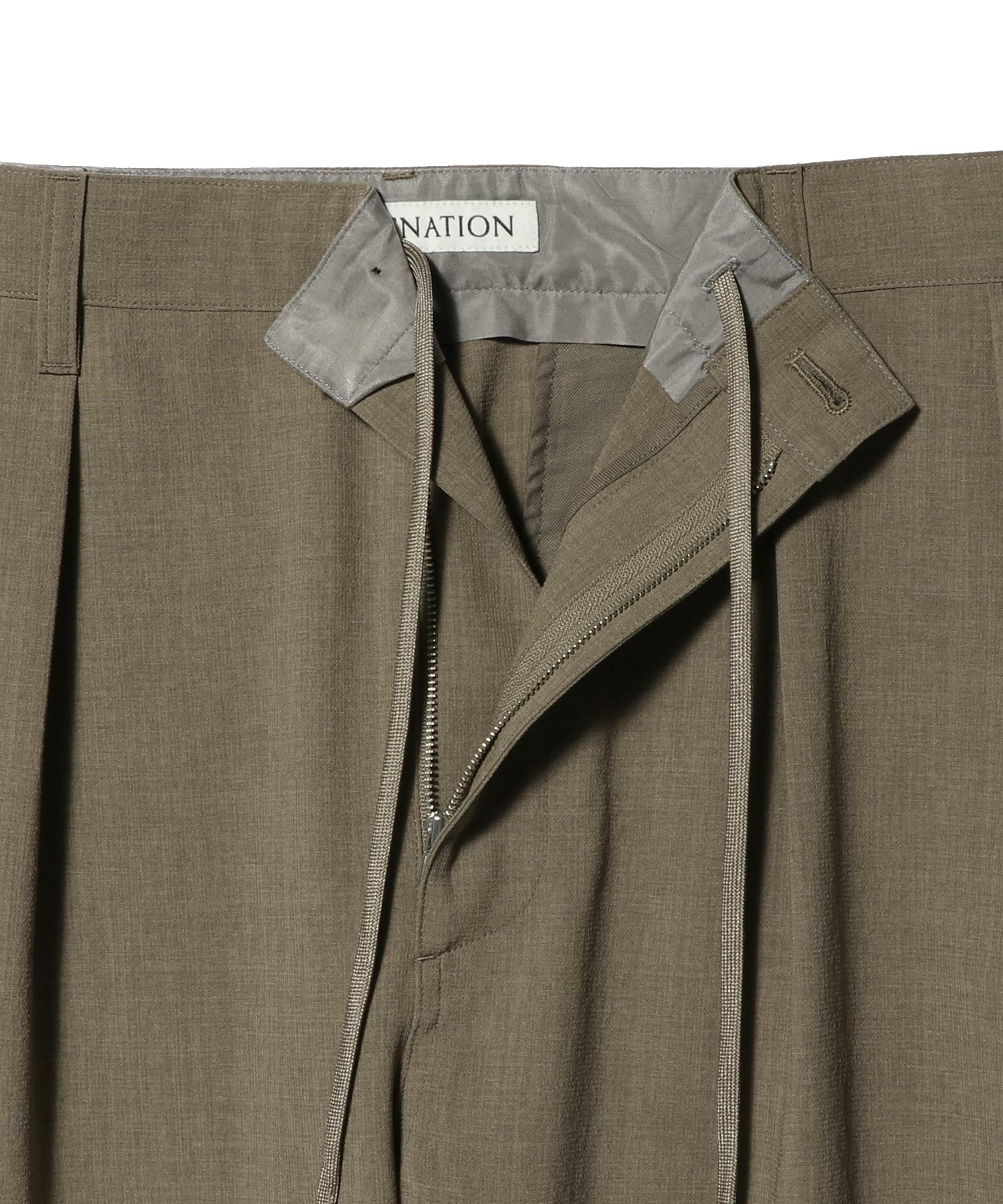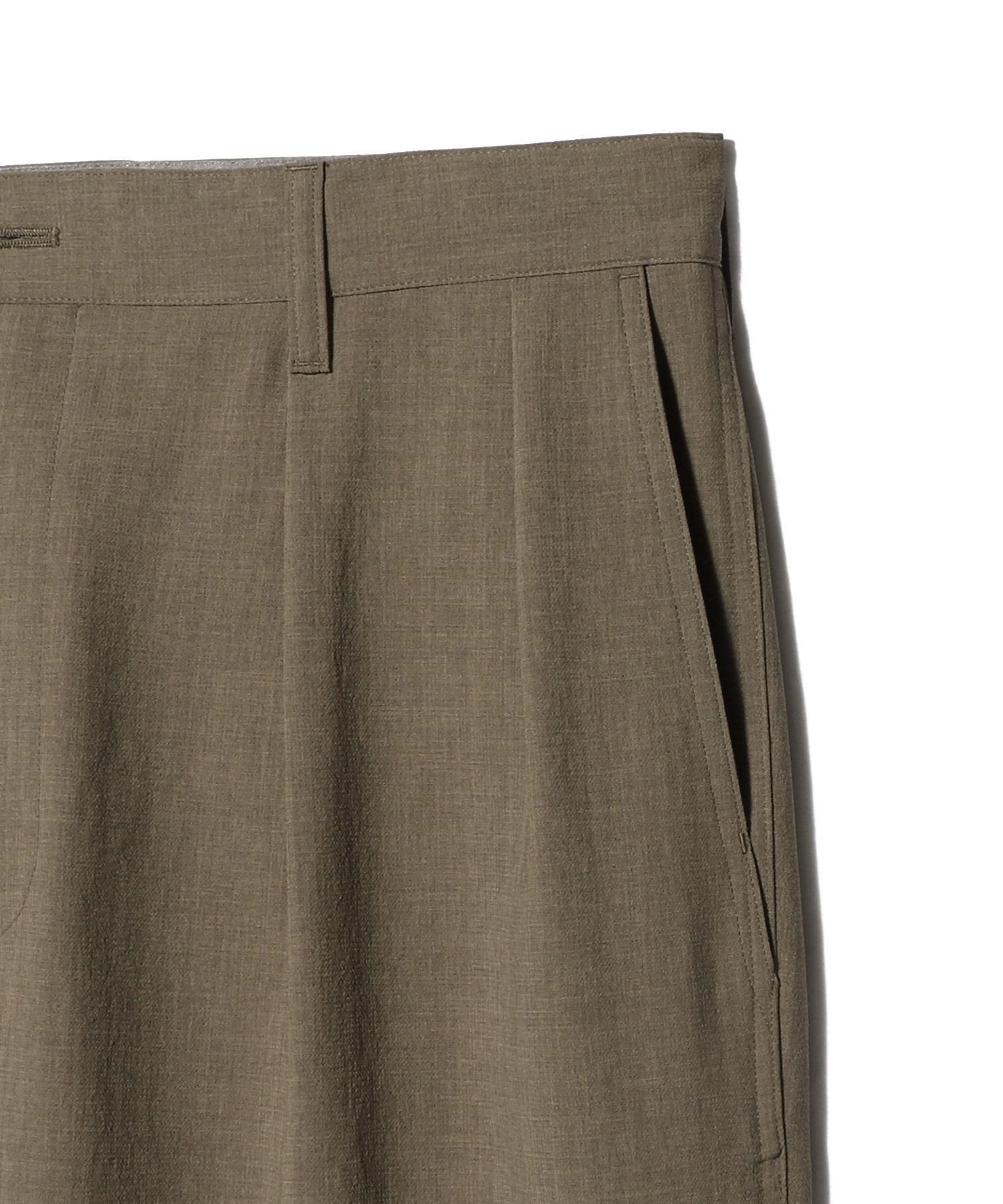 自然なしわ感と凹凸のある表情により肌離れが良く、涼しげで快適な穿き心地に仕上げています。フィットは太めのストレートシルエット。フロントの2タックとウエストのドローコード仕様がデザインと機能性のポイントです。シンプルなシャツと合わせたクリーンなスタイリングがおすすめです。