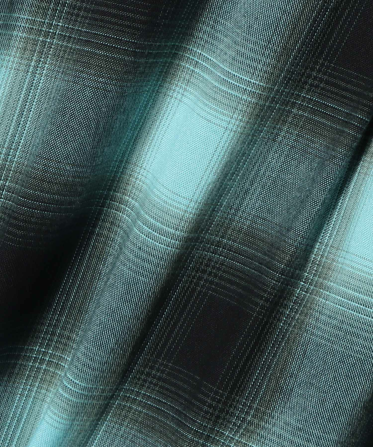 レーヨンのオンブレチェック生地を使用し、製品染加工を施したオープンカラーシャツ。