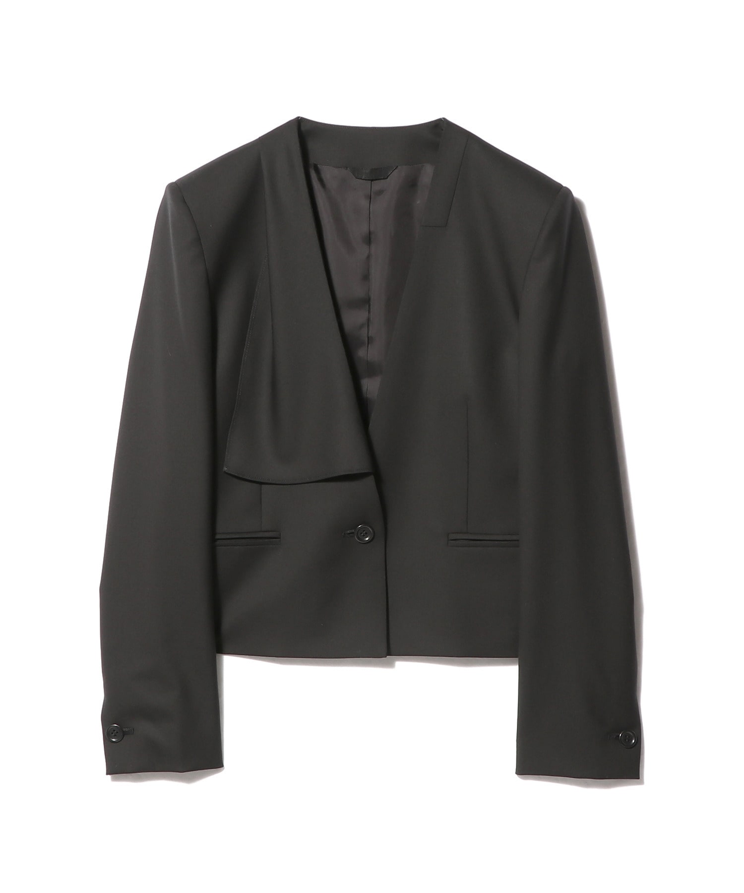シンプルなVネックにアシンメトリーにフレア衿が配されたニュアンスを加えたデザイン。ブラックは背抜きの裏地、グレーは総裏仕立てになります。