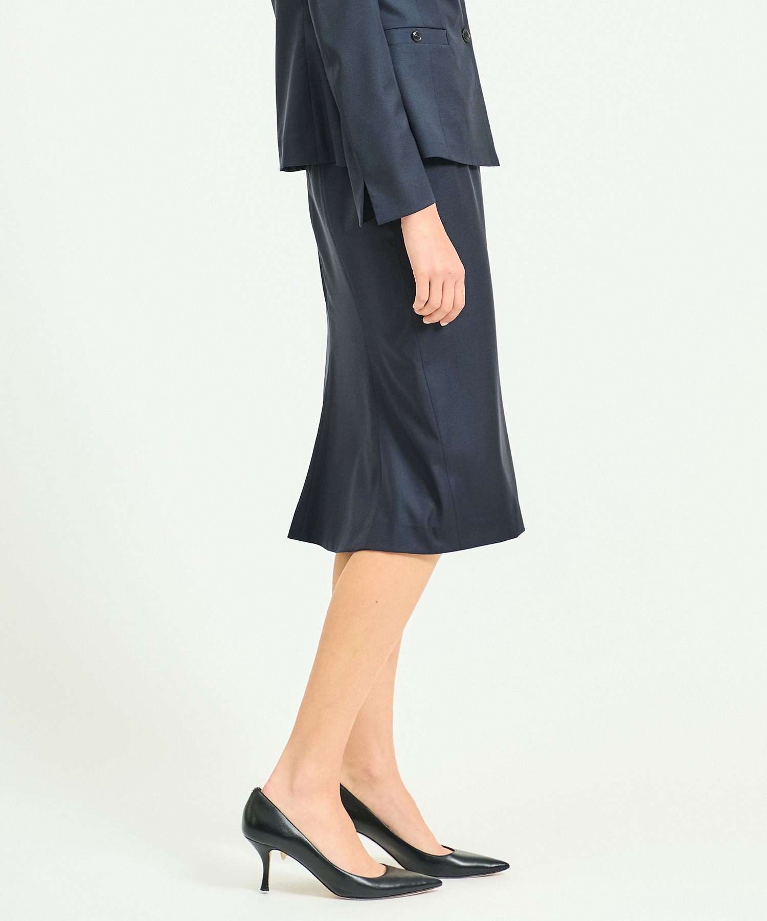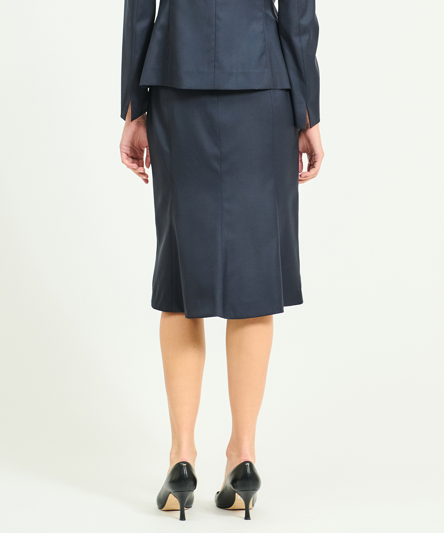 前から見るとタイトスカートですが、後ろは切り替えパネルのデザインとヒップ下から少しフレアになっており、歩いた時の美しいシルエットが魅力。