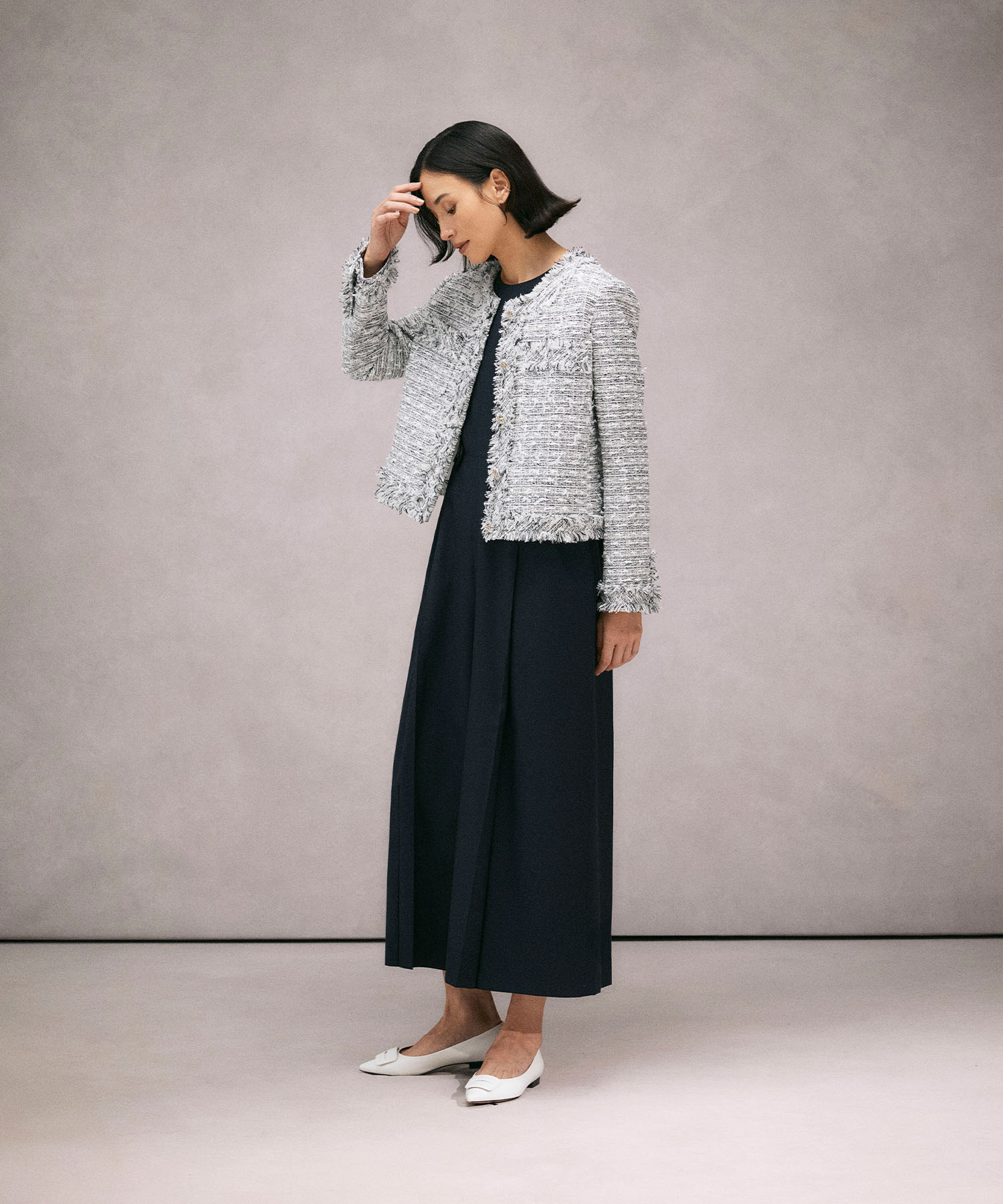 フォーマルな場はもちろん、アクセサリーやシューズの合わせ方次第で、日常にも取り入れやすい万能アイテムです。