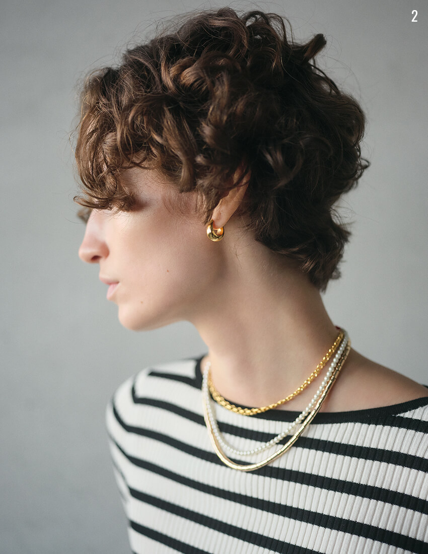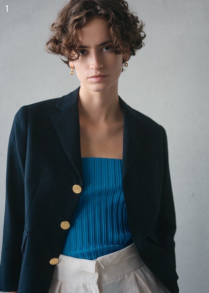 オンシーンのスーツスタイルも遊び心を取り入れたデザインで気分を変えて。新しいプロポーションで完成させるのは、タフさとセンシュアルさを併せ持った女性像。