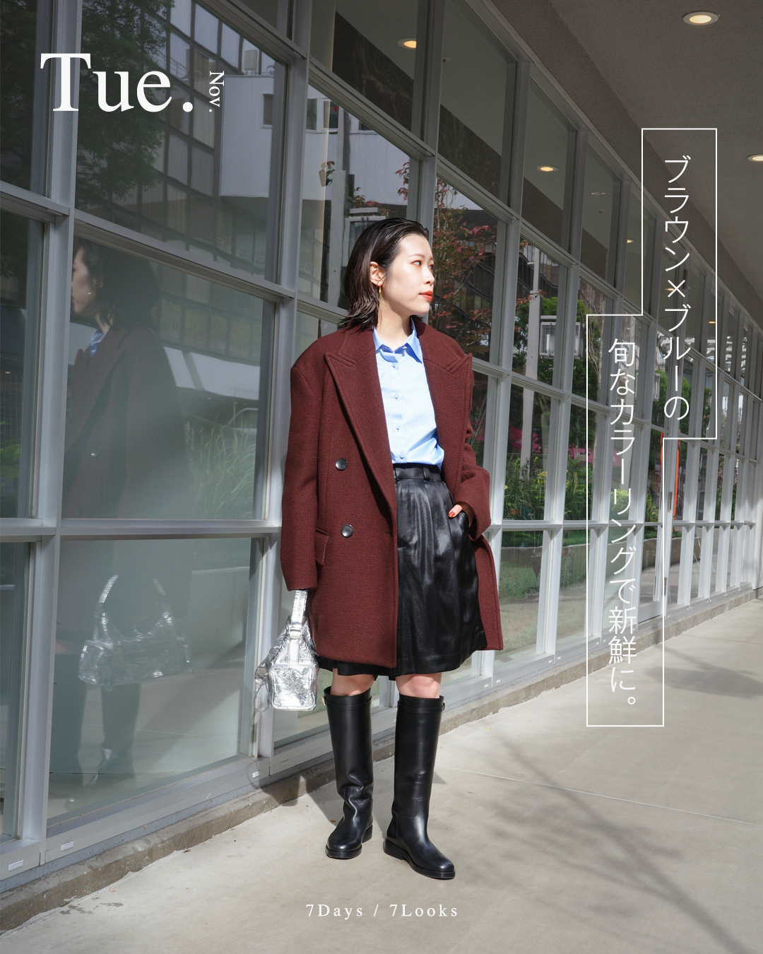 02. TUESDAY ブラウン×ブルーの旬なカラーリングで新鮮に。
