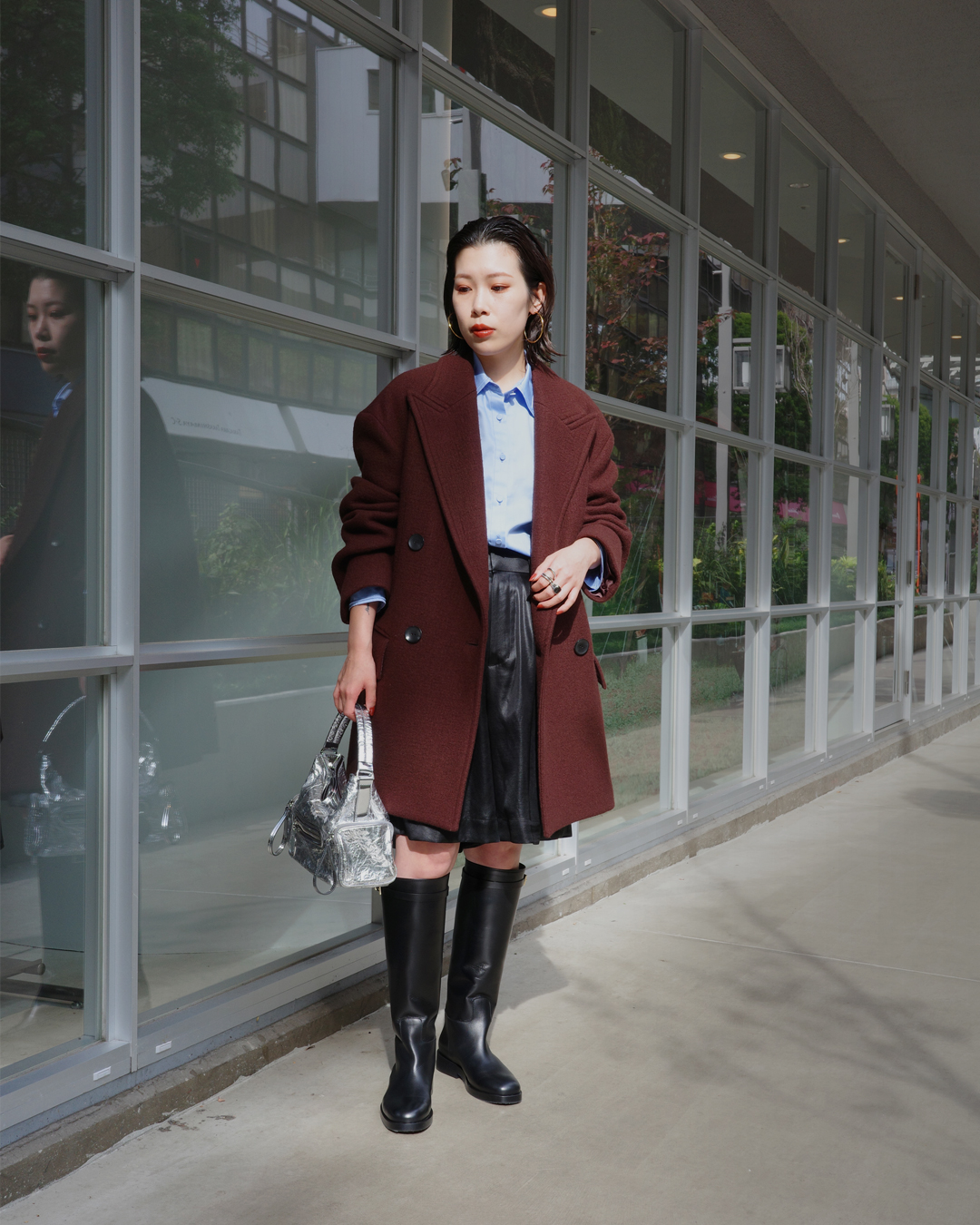 ハンサムになりがちなジャケットコートを、Iラインシルエットのワンピースできれいめマニッシュに。