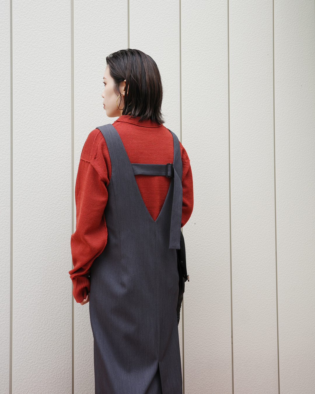 ほどよく表情のあるニットには、バックルワンピースの端正さをひとさじ。