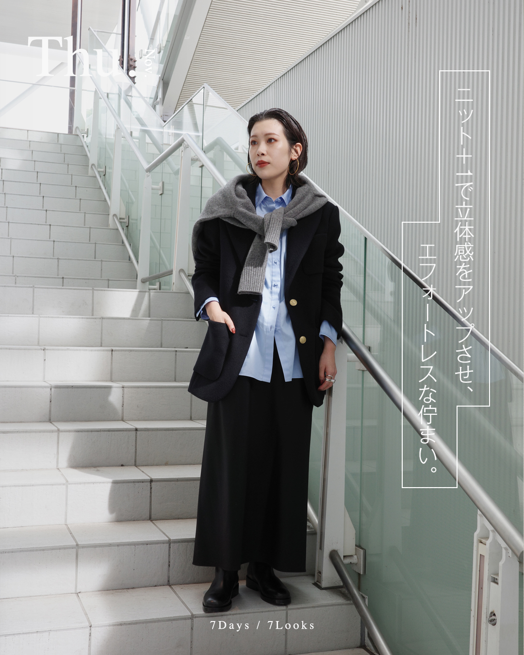 04. THURSDAY ニット+1で立体感をアップさせ、エフォートレスな佇まい。