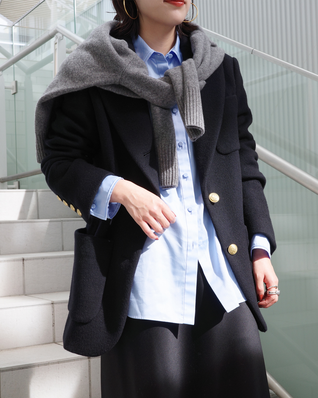 冬の街並みに映えるグレーニットをストール感覚で。温度調節も楽に、グッとこなれ感のある着こなし。