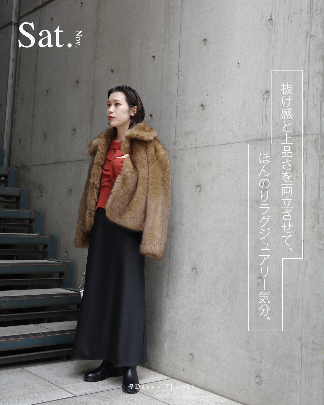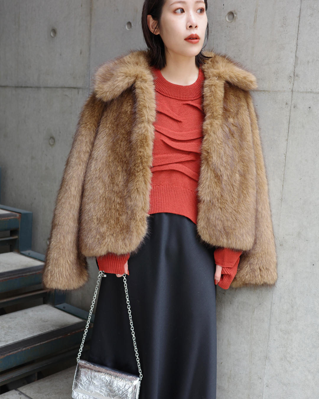 ファー × ツヤ感スカートの異素材を掛け合わせてドラマティックな存在感を高める。