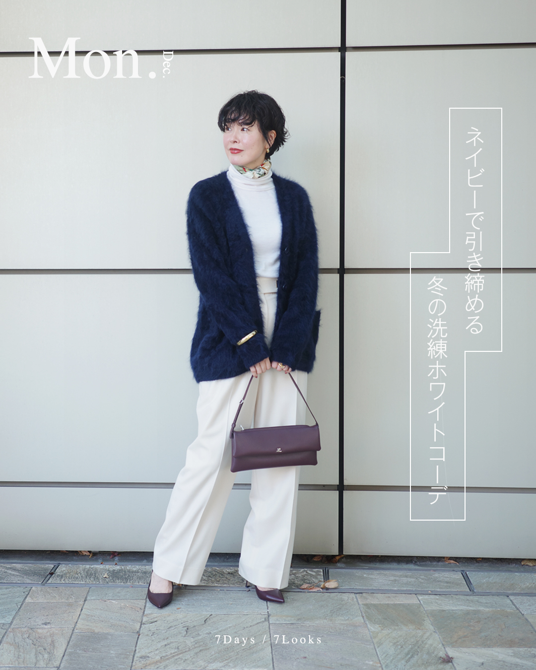 01. MONDAY ネイビーで引き締める冬の洗練ホワイトコーデ。
