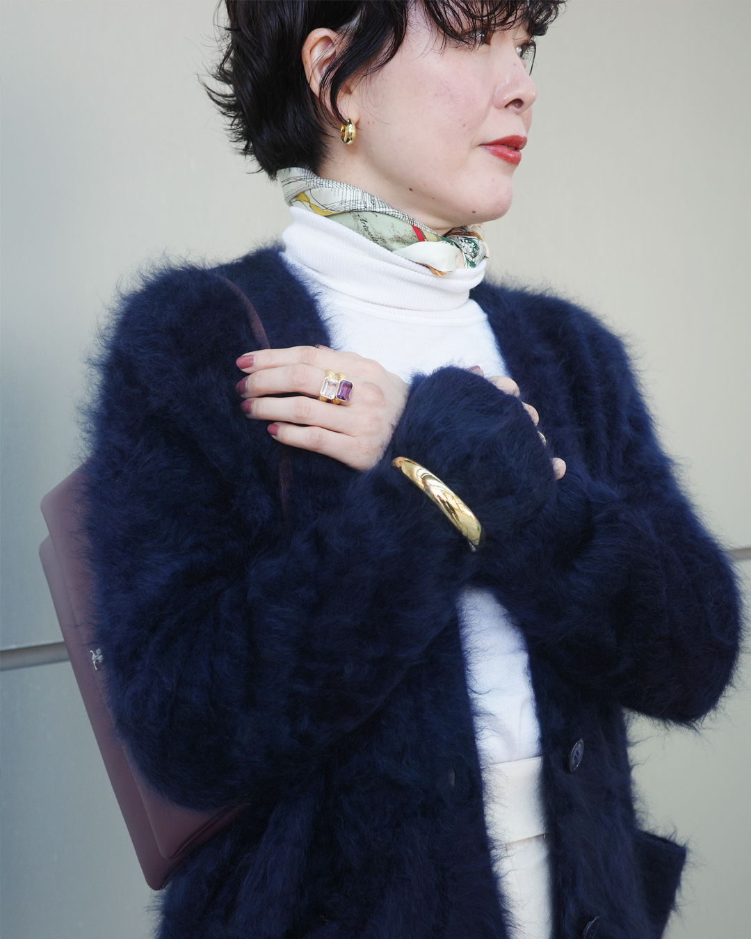 ネイビーのニットカーディガンが、こなれ感のあるホワイトコーデを引き締めます。