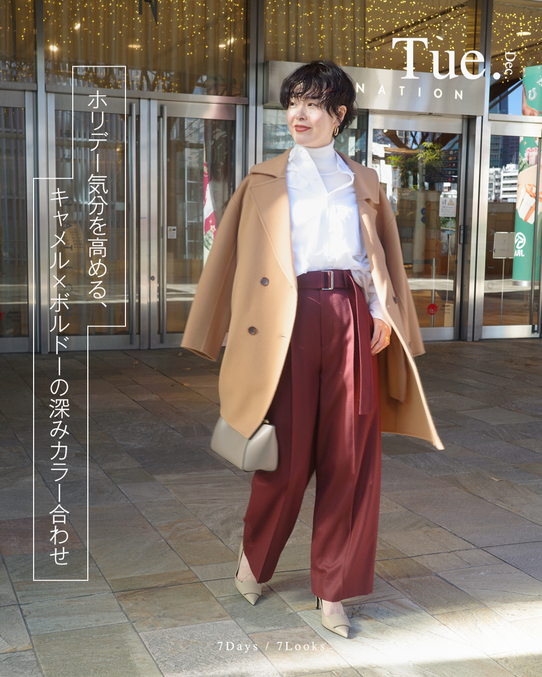 02. TUESDAY ホリデー気分を高める、キャメル×ボルドーの深みカラー合わせ。