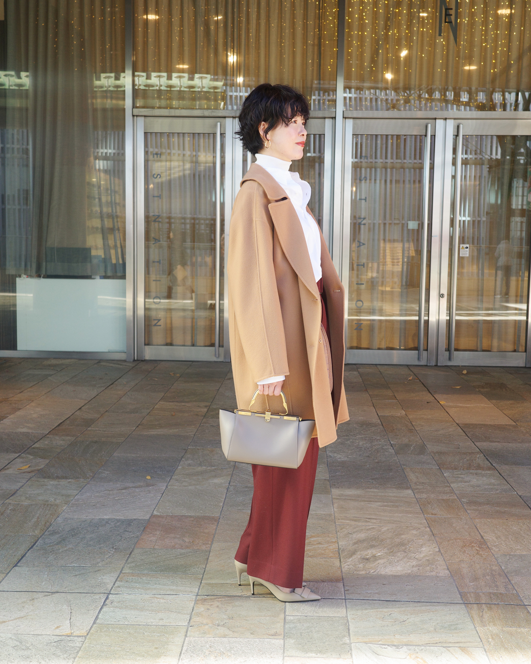 深みのあるボルドーが季節感を出しつつ、キャメルとも相性抜群。ハイウエストパンツで美脚バランスも忘れずに。