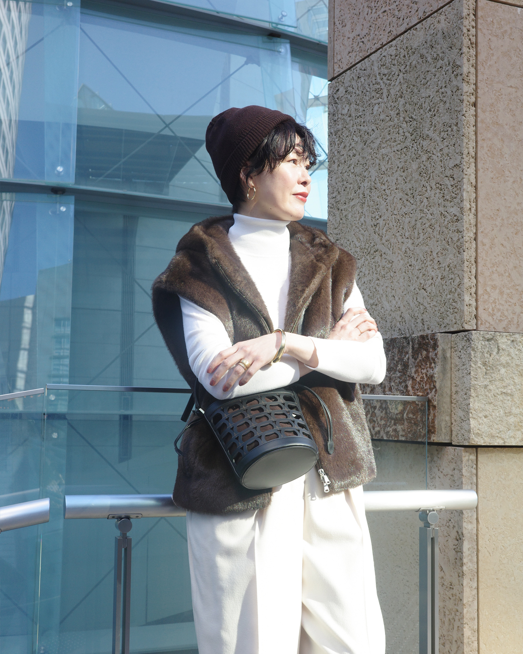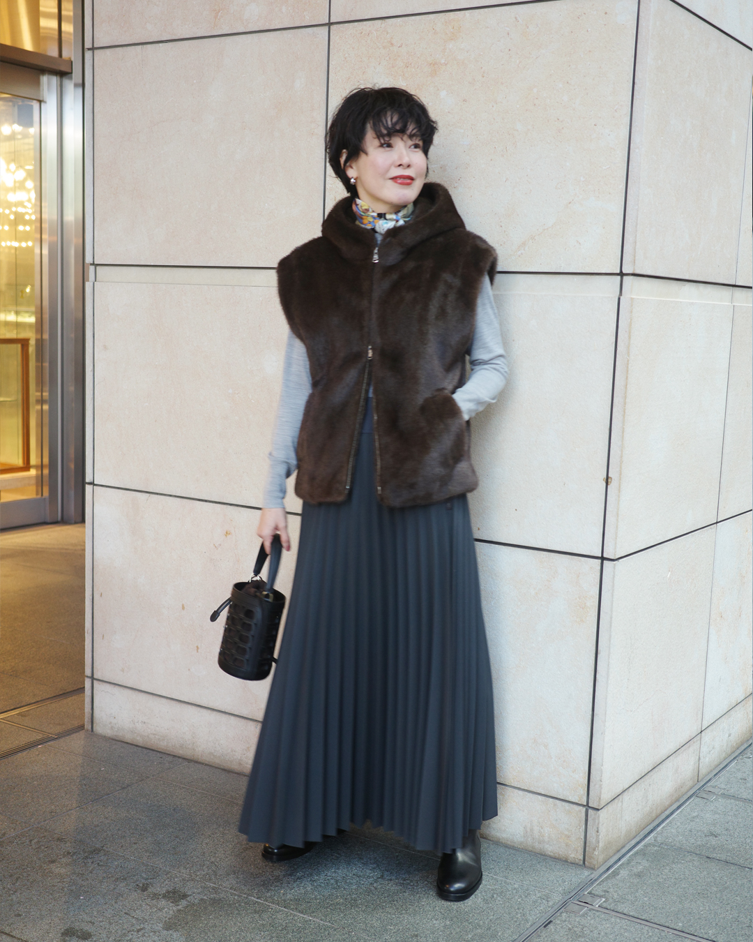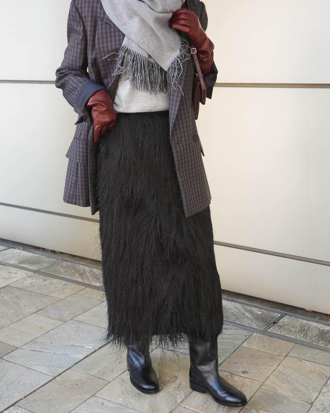 ファーベストとニットスカートの上品素材のコントラストで着こなしをシックに昇華。