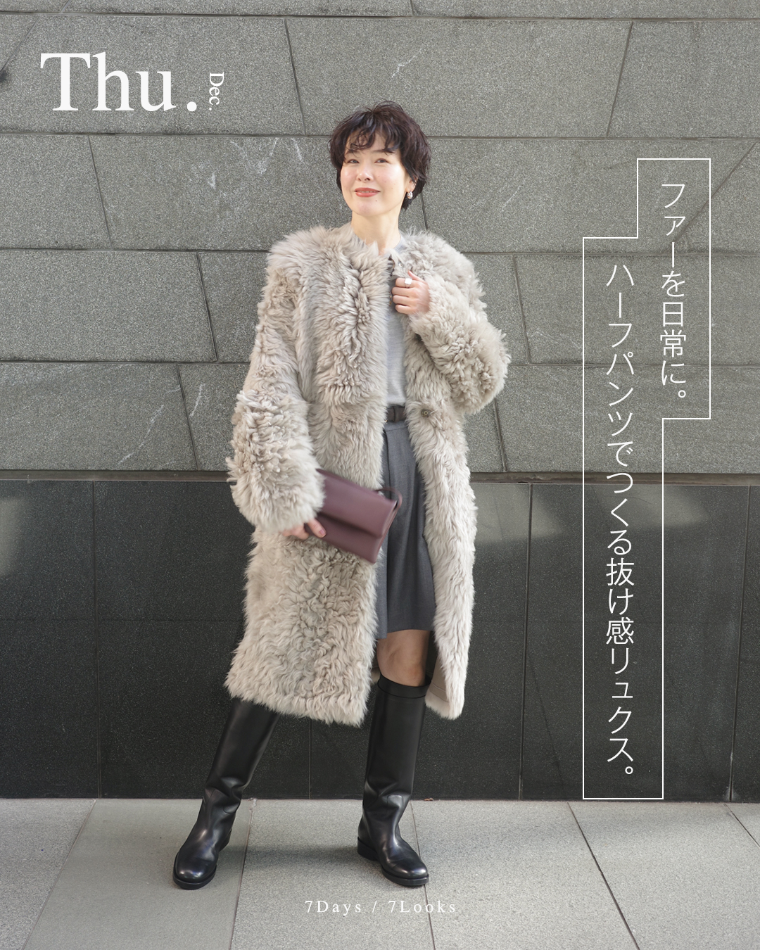 04. THURSDAY ファーを日常に。ハーフパンツでつくる抜け感リュクス。