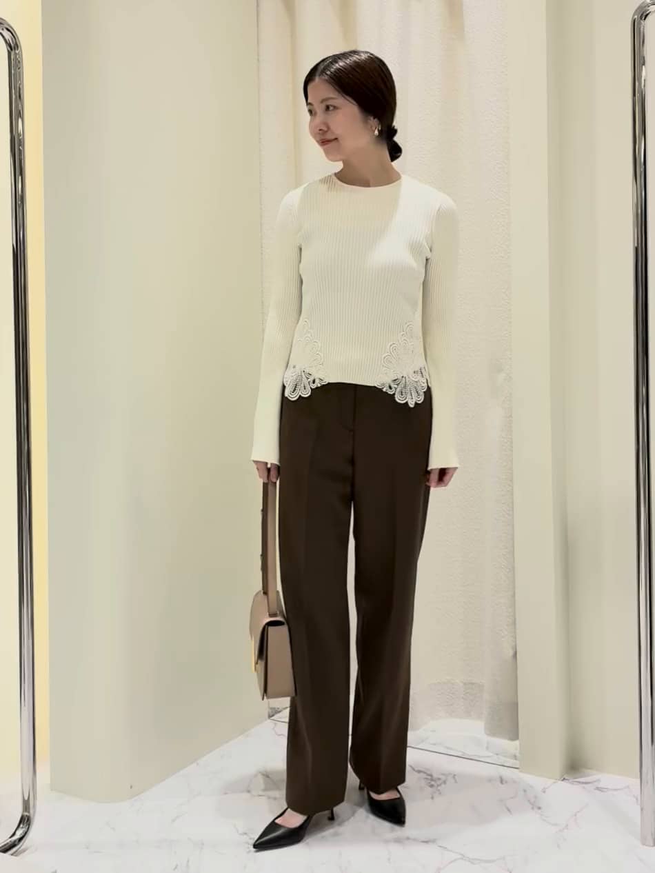 立体的なレースが印象的な1枚で着映えするニット。 シルキーな光沢とシャリ感のあるシャープな質感で程よく体に沿うフィット感です。 合わせたストレートシルエットのパンツもやや光沢感があるためどこか女性らしさも兼ね備え、日常から華やかなシーンまで着用して頂けます。 【着用サイズ】 ニット:F ボトムス:36 身長:160cm