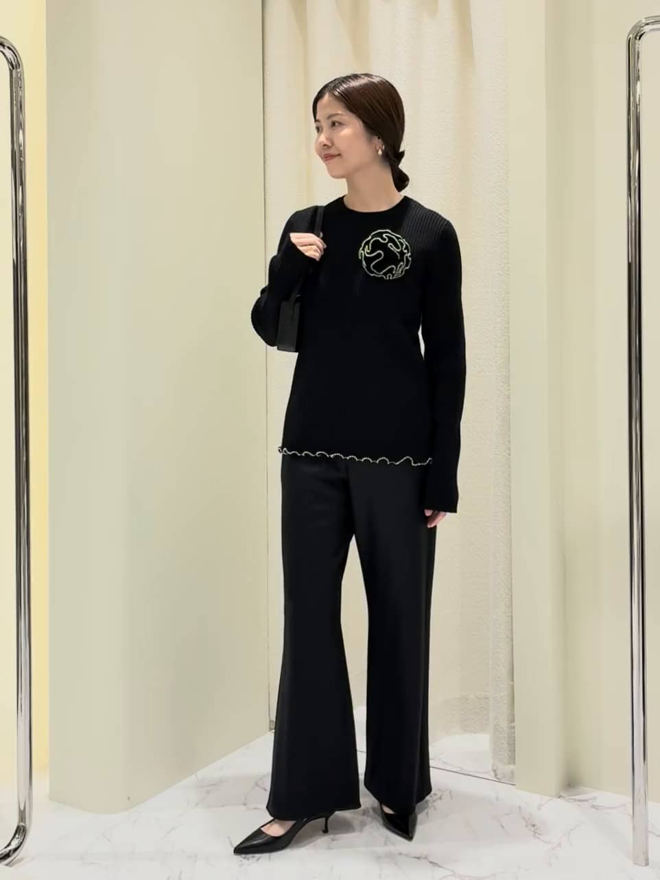 取り外し可能なコサージュ付きのリブニットは裾にあしらわれたボールチェーンが華やかでとても印象的。 柔らかいニットの着心地はそのままに、やや長めの着丈が今年らしいシルエットを演出してくれます。 合わせたパンツは毎年人気の美シルエットなイージーパンツです。ウエストはゴムで着用しやすく、ヒールからスニーカーまで合わせられます。 【着用サイズ】 トップス:F ボトムス:36 身長:160cm