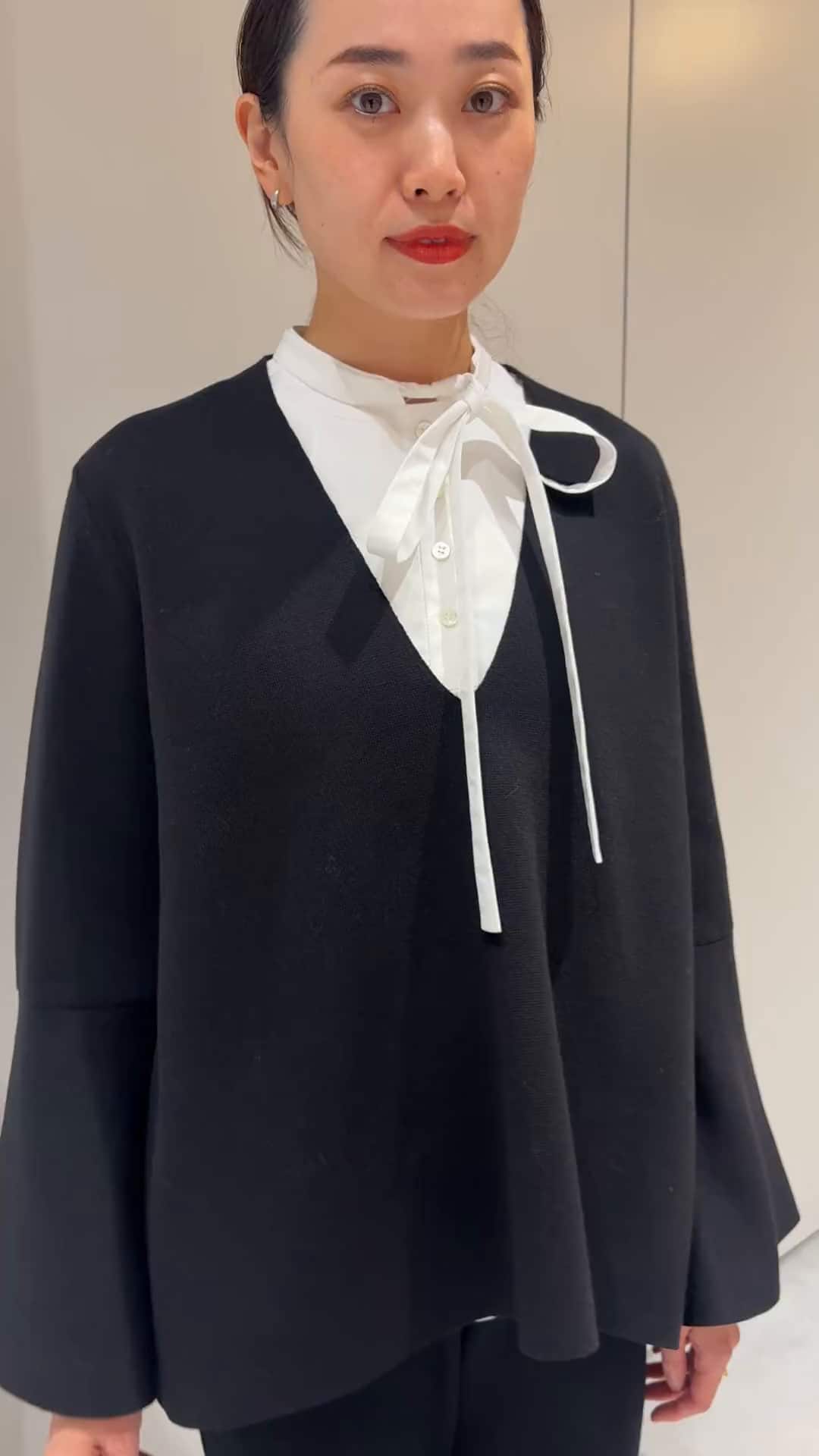 ニットのセットアップはお仕事や学校行事におすすめの一枚です。 ニットパンツは伸縮性もあり楽に履いていただける一枚です。 また今回のスタイリングではボウタイブラウスと合わせましたが、タートルネックを合わせても素敵です。