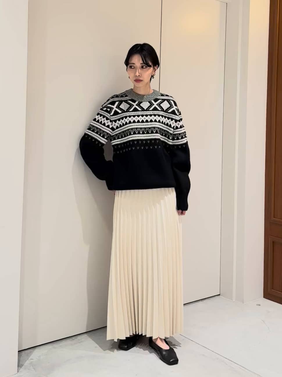 『ニットコーデ🧶』 『ノルディック柄』 黒×白のコントラストが効いているノルディック柄ニットは、冬らしい温かみと華やかさを兼ね備えた一着❄️🦌 存在感がありながらもモノトーン配色なので上品にまとまり、これからのホリデーシーズンにも活躍してくれます🎄✨ ニットにほどよくボリュームがあるため、ボトムスには明るいカラーをチョイスしてメリハリのある印象に。 繊細なプリーツスカートを組み合わせることで、 一気におしゃれ見えするスタイリングとなります。 シューズは私物ですが、フラットタイプを選ぶと抜け感が生まれリラックスした雰囲気に。ショートブーツなどを合わせれば、より季節感のあるコーディネートもお楽しみいただけます。 店頭にてご覧いただけます。お気軽にお立ち寄りくださいませ。 ASSEMBLEESTNATION GINZASIX店 TEL:03-6264-5553 営業時間:10:30-20:30