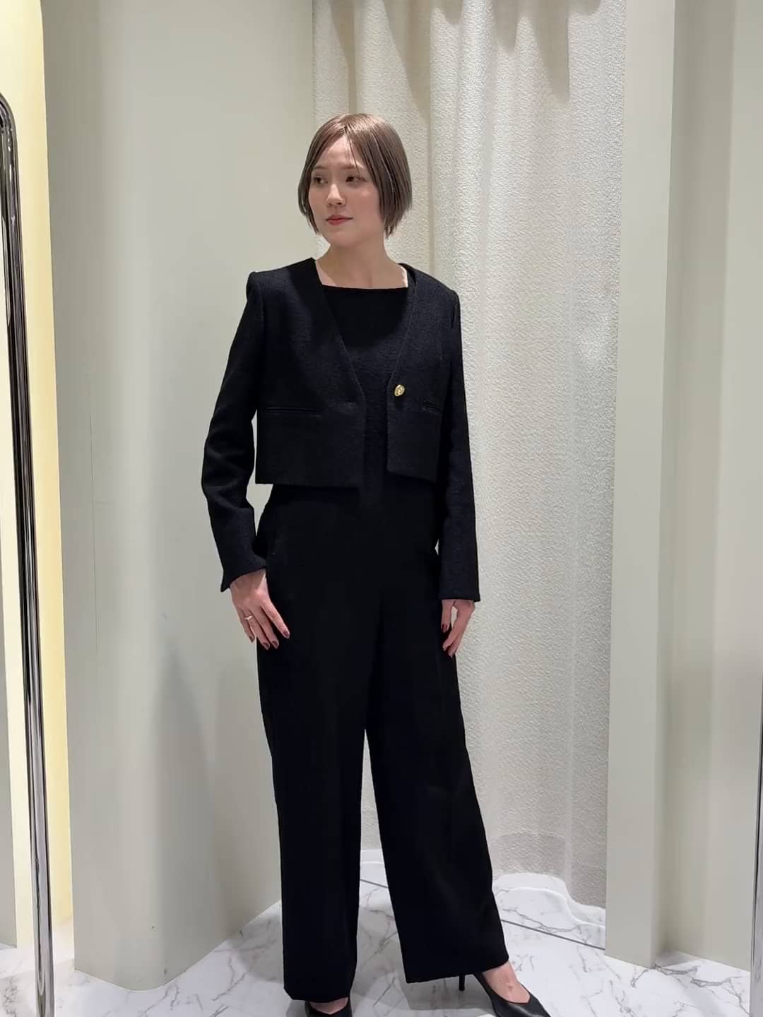 リングツイードのセットアップ ジャケットは、スタイルアップ見えのウエスト丈と深めのVネックで抜け感を出しています。 バックスタイルも深めのベンツが特徴的です。 お手持ちのワンピースなどともバランスを取りやすい丈感になっているので、単品使いもおすすめです。 オールインワンは、ストンと落ちるストレートシルエットがとても綺麗です。 ウエスト切り替えの線を無くして、ダーツを取っているので、スタイルアップが期待できる上品な一枚となっています。 華やかなシーンや綺麗見えするスタイリングがお好きな方におすすめです✨ 【着用サイズ】 ジャケット:36 オールインワン:36 気になるアイテムや詳細は、お気軽にニュウマン高輪店まで問い合わせ下さいませ アッセンブルエストネーション ニュウマン高輪店 ニュウマン高輪 South 3F 営業時間 11:00-20:00 TEL 03-6277-4155