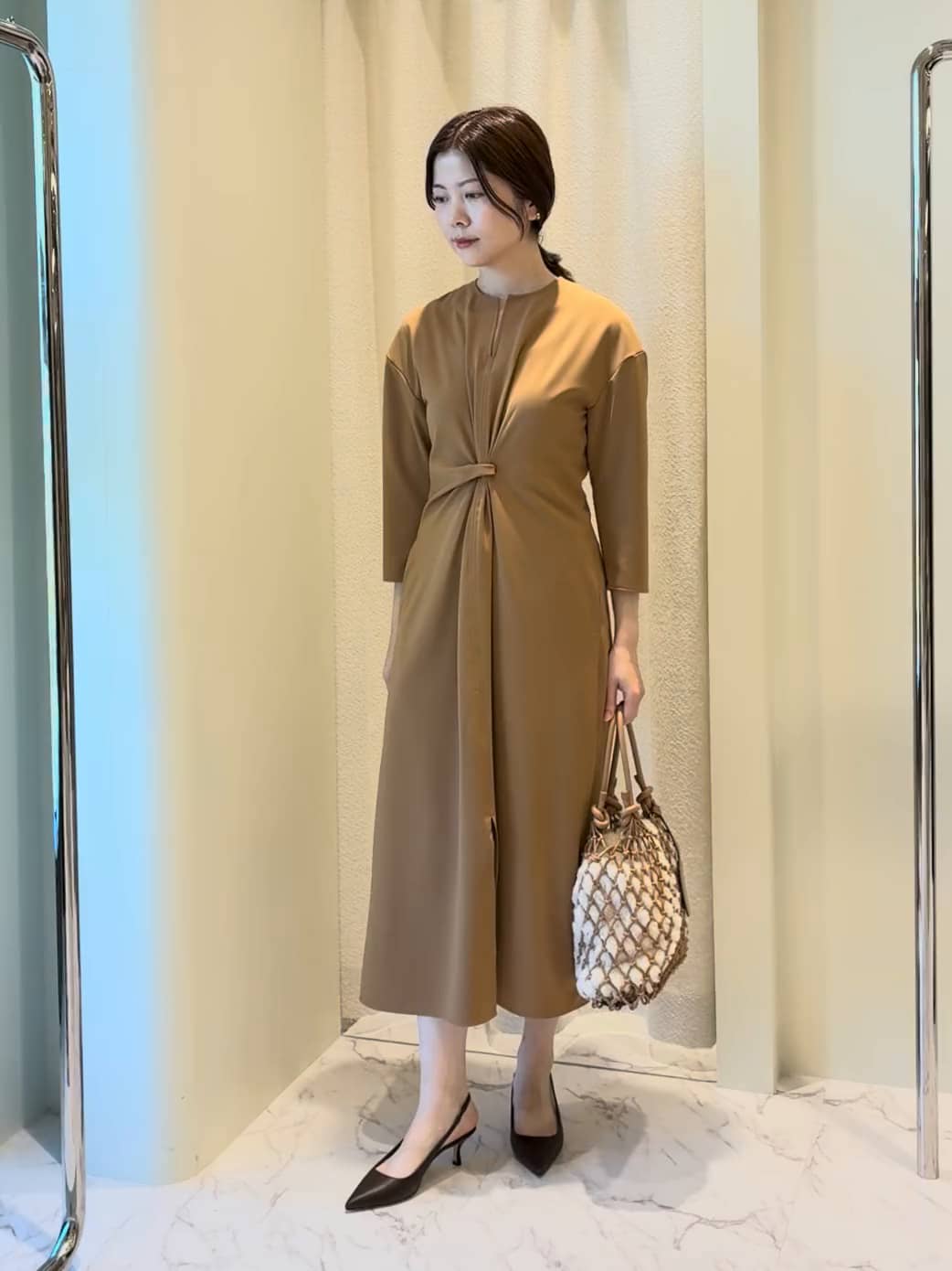 フロントのツイストデザインが特徴的な上品なワンピース。 シンプルながらも立体的なシルエットが美しく、体のラインを上品に引き立てます。 オールシーズンお使い頂ける素材感で1枚あるとTPOに合わせて活躍して頂けます。 【着用サイズ】 ワンピース:36 身長:160cm -------- 気になるアイテムや詳細はお気軽にニュウマン高輪店まで問い合わせ下さい。 ◇アッセンブルエストネーション ニュウマン高輪店 ニュウマン高輪 South 3F 営業時間 11:00-20:00 TEL 03-6277-4155 ◇ROUTE JR高輪ゲートウェイ駅南口改札より出て正面の左の棟がSouth棟になります。 BLUE BOTTOLE COFFEE横のエスカレーターから3階に上がって頂き、左側に曲がって頂くとお店がございます。